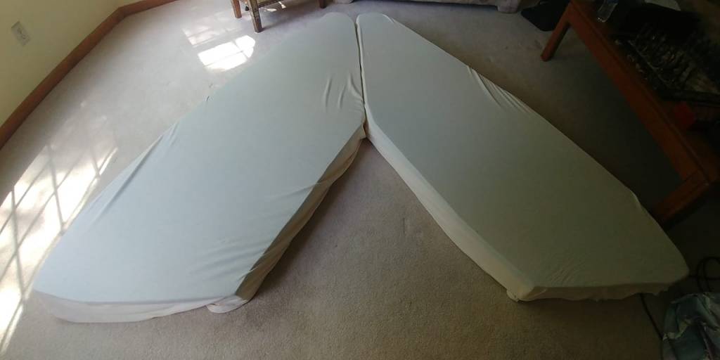 Pretty stoked about our new v-berth mattresses. They are (were) twin XL mattresses that I cut to size with Mom’s electric knife. The kids are going to be happy that they don’t have to sleep on the stinky old mattresses that these will replace.