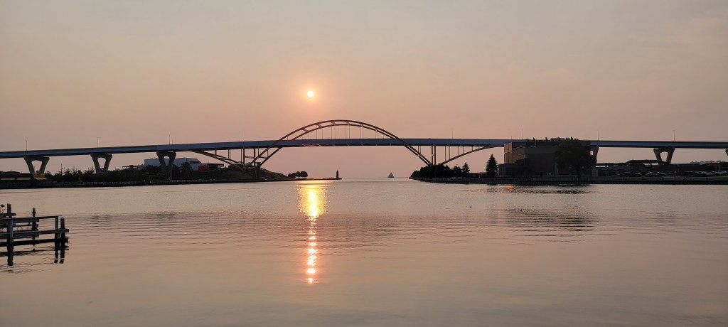 At any rate, it’s not often the Bucks are in the playoffs. As a Wisconsinite, I felt it was my personal responsibility to wish them well. We stopped at Camino American Craft Beer and Eatery for dinner before walking on the Riverwalk the two miles to the Deer District with what was eventually 100,000 of our closest friends. We really had no desire to watch the game from there, just wanted to see the action. So we walked up to the gate, took a picture, took a selfie with the local news guy (he had no idea), looked around for a minute, and then headed back to the boat. We watched the game on TV. The cool part for us was that the moment the game ended, the colors on the Hoan Bridge near us changed colors, and the bar just down the street had fireworks. What a special day for Milwaukee!