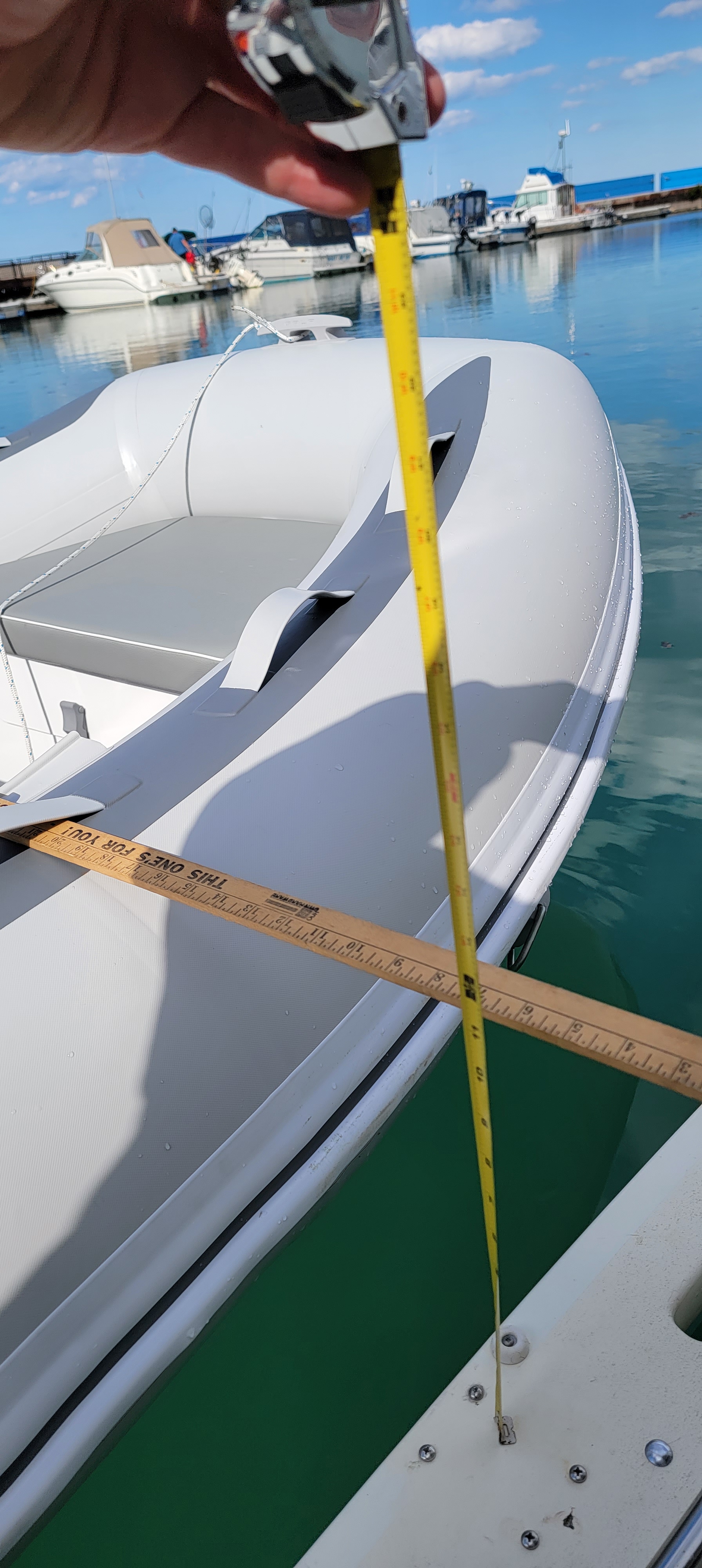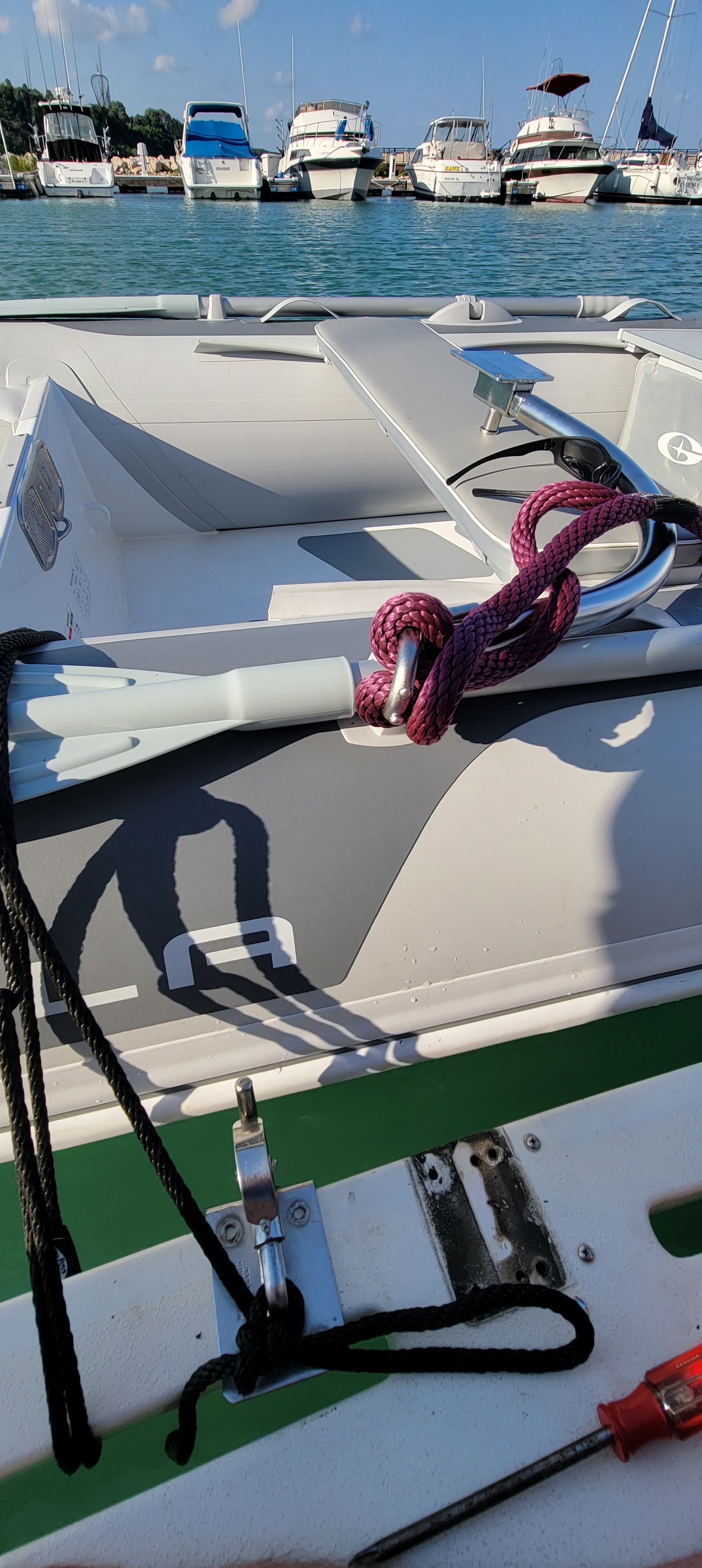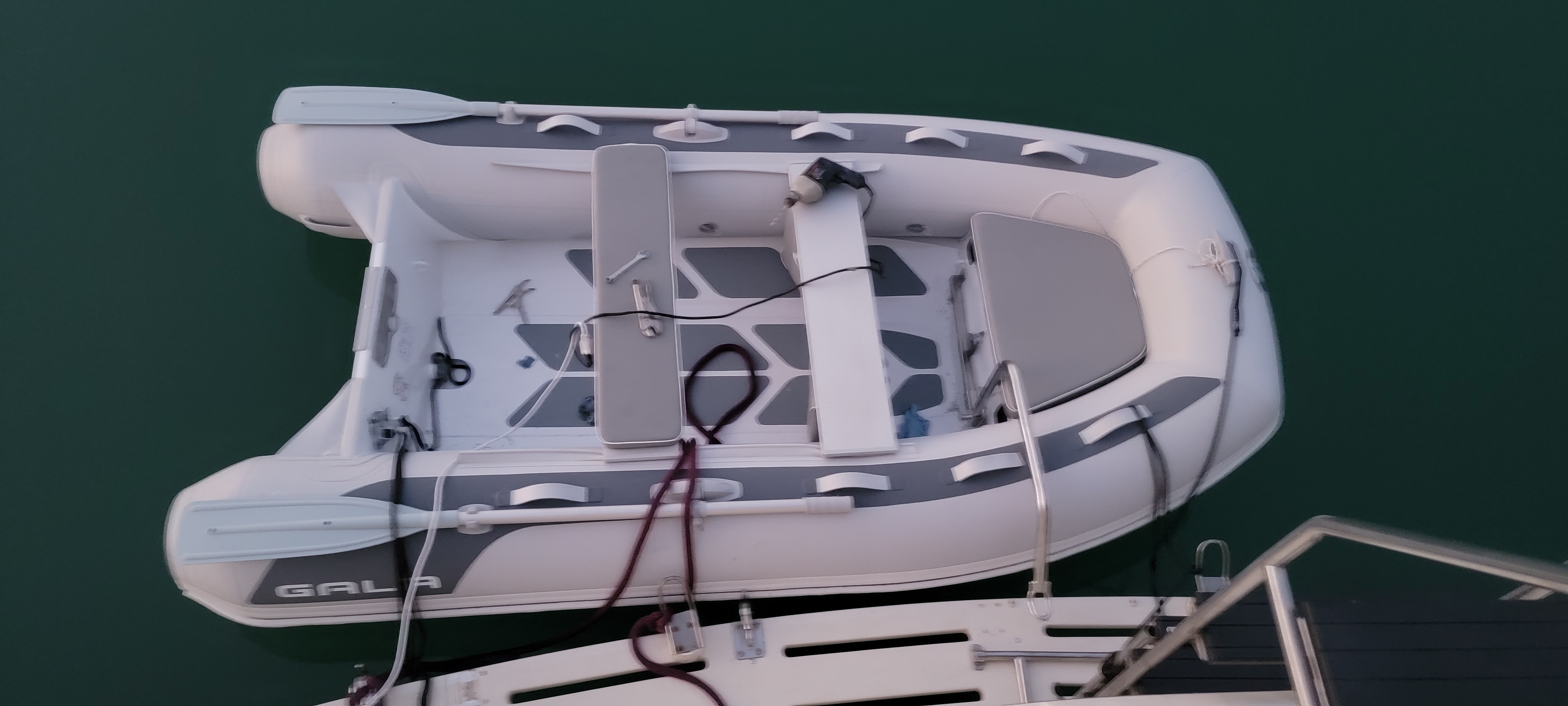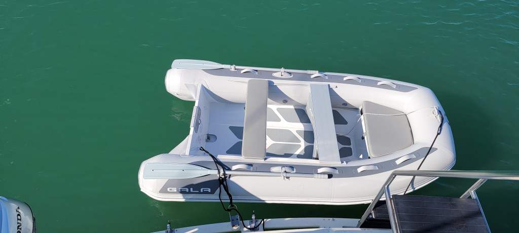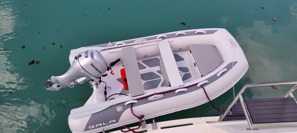 After searching for a used one because our yacht dealer admonished us to “never buy a new dinghy,” we gave up and bought a new one. We purchased a Gala A300D with a Honda 9.9hp motor. It’s a 10 foot aluminum hull RIB and her name is Dot.