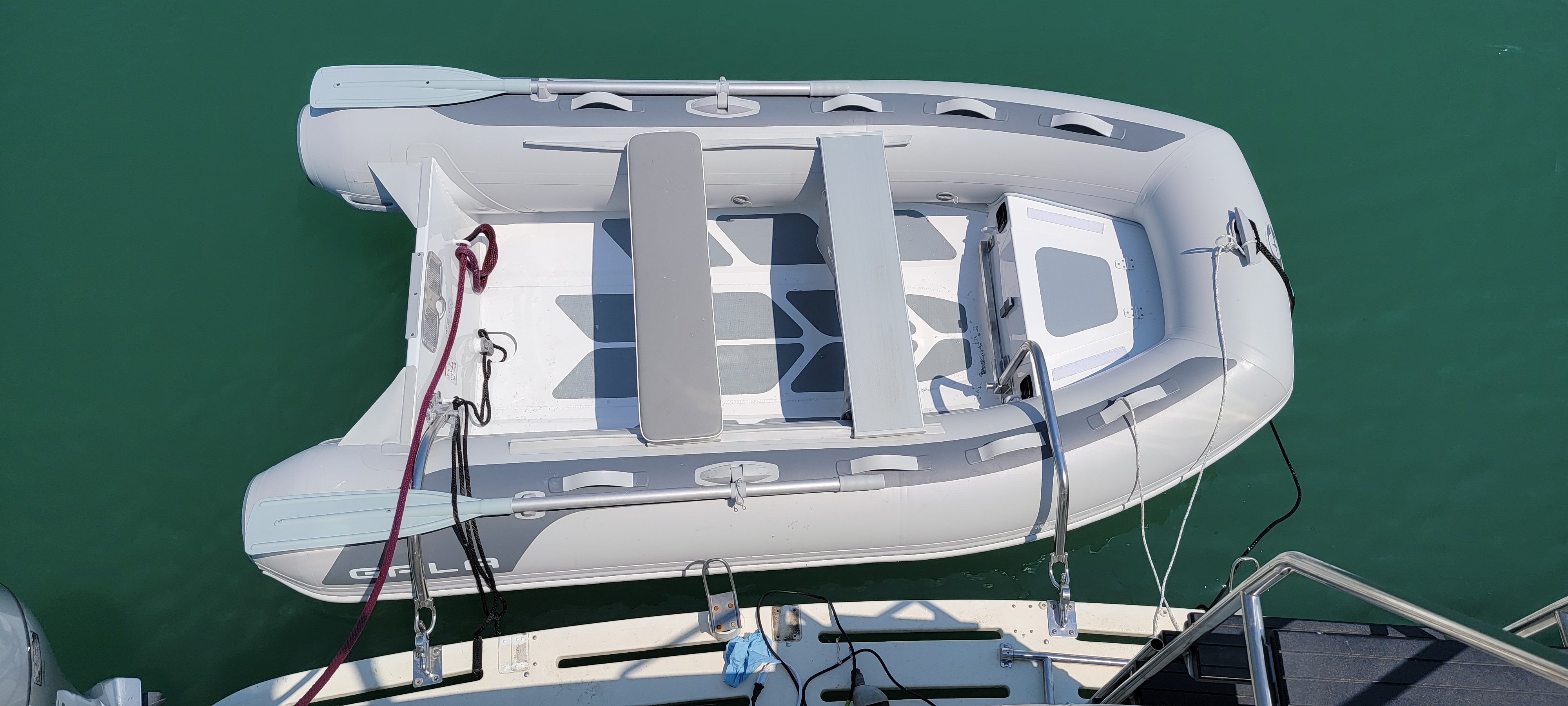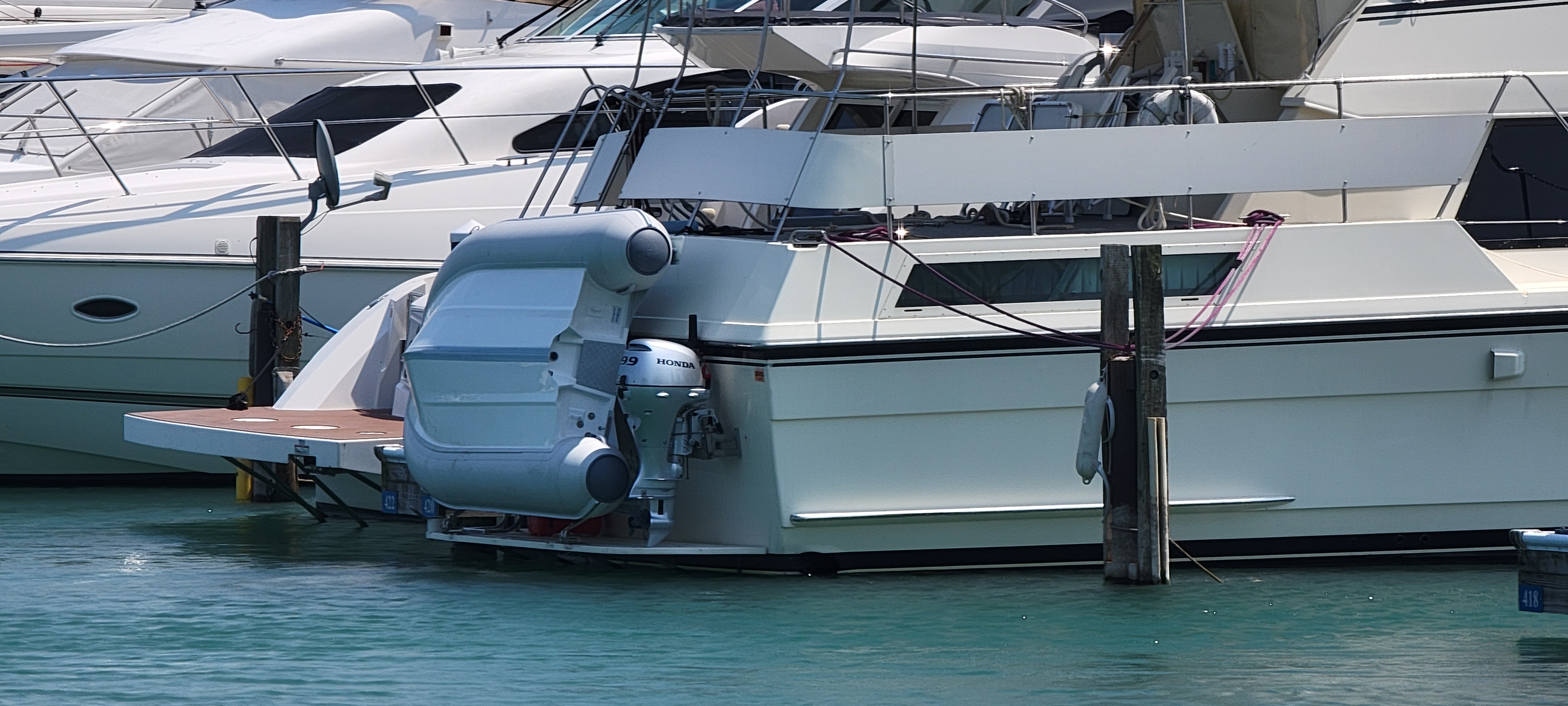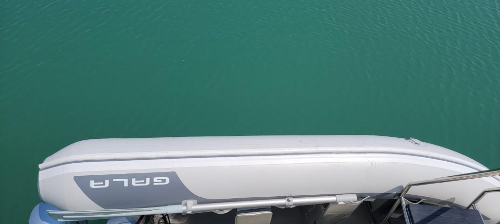 After a bit more wrangling… it’s up! Now we are debating whether or not to use standoffs instead of just letting the dinghy sit against the back. We bought the standoffs and it would provide a little access to the swim deck, but it would still be very tight. We may try it for a while like this and see how it goes.
