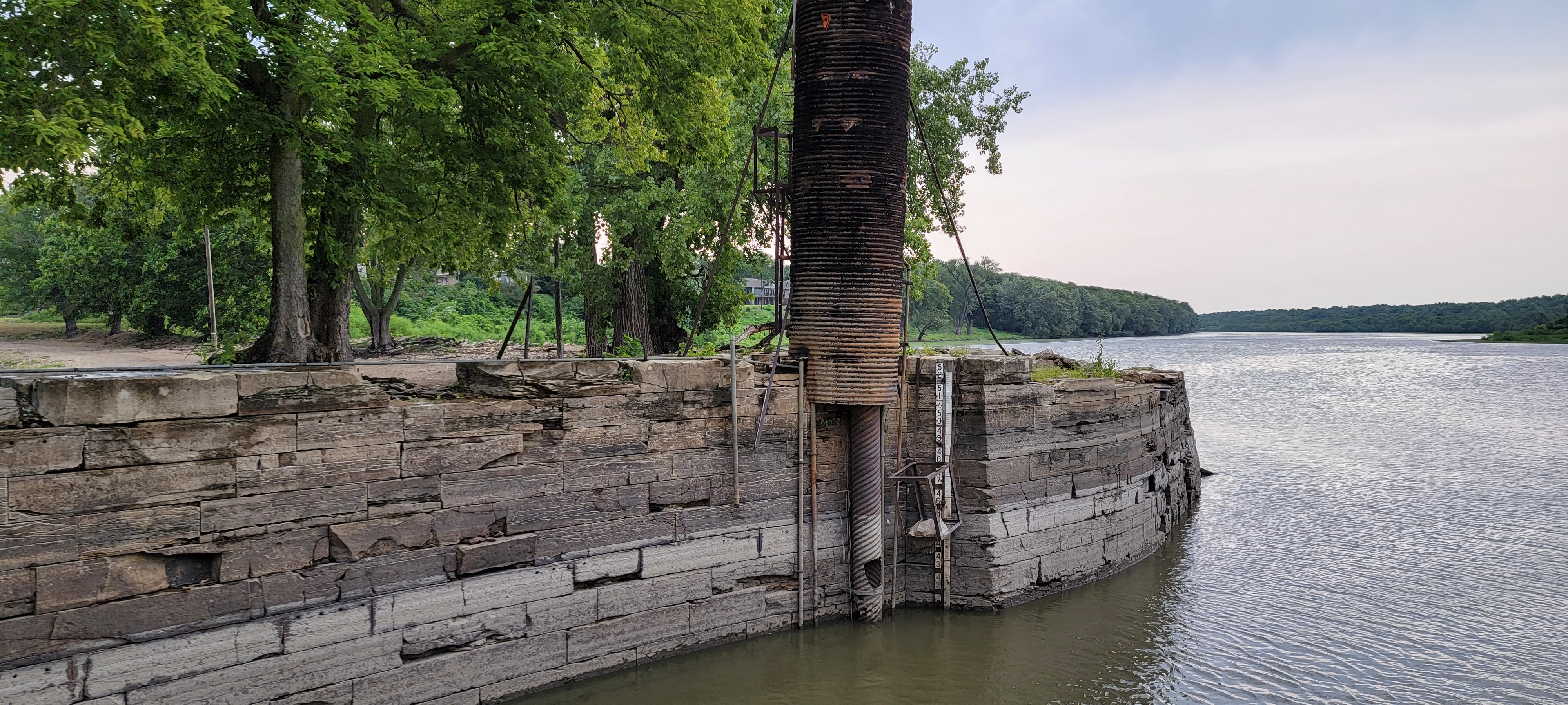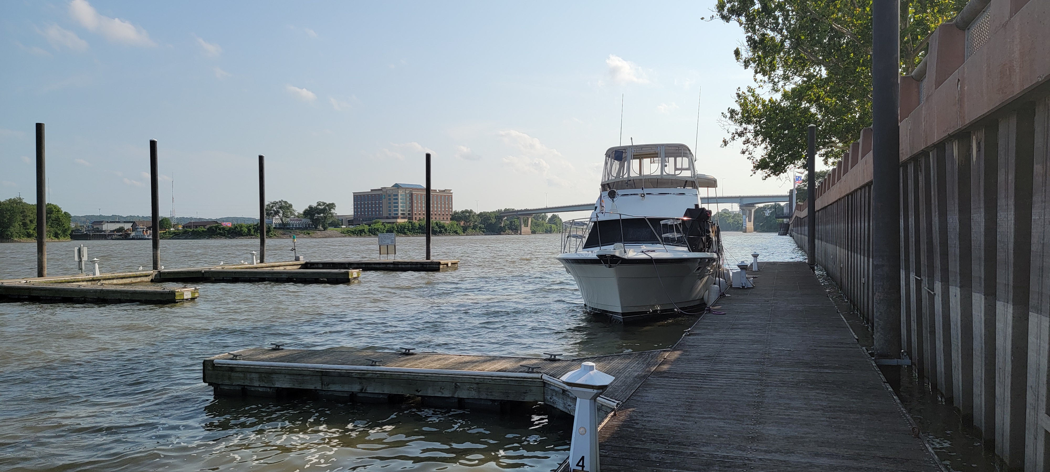 Well that was an eventful day. A couple days ago, we were in contact with IVY Club to see if their entryway was deep enough to accommodate our 4.5′ draft. That day, they were not confident it was. The concern was that it might be deep enough to get in, but then if the water level went down, we might not be able to get out the next day. So today we started with a sunrise departure from the friendly, informative, and accommodating Heritage Harbor and headed for the Peoria City docks. We really enjoyed our time at Heritage Harbor. As Owen hailed the Starved Rock Lock a short time later for a lock-through, we noticed the port engine beginning to overheat. The Lockmaster at Starved Rock Lock anticipated a 20-40 minute wait, so Owen turned off the engine while we waited. The wait ended up being 35 minutes, so bonus points to the Lockmaster!
