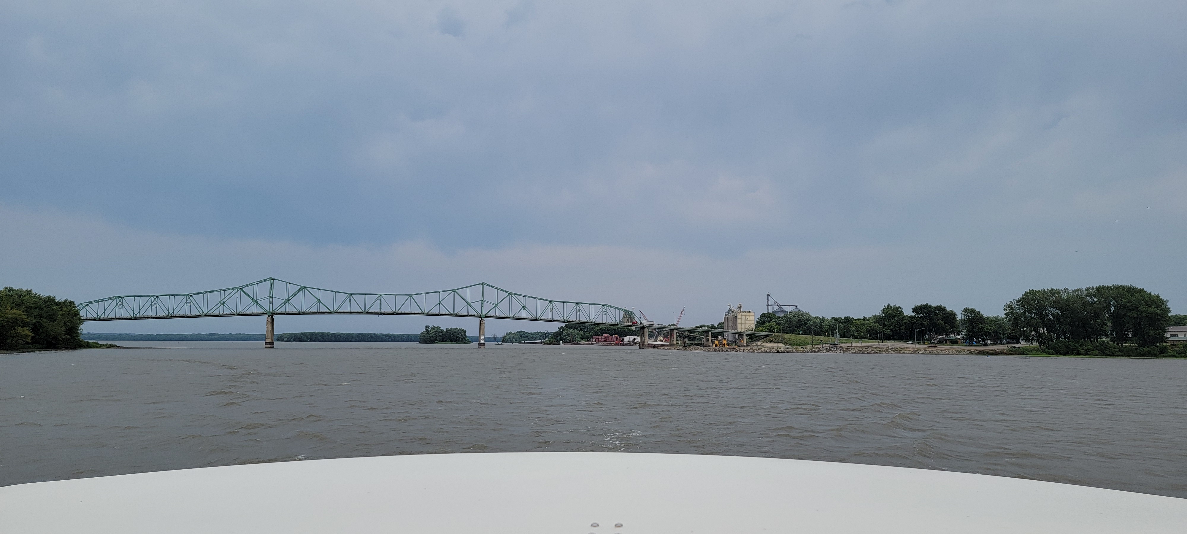 That attempt to ruin our day thwarted, we continued our trip toward Peoria. The plan was to stop at the Landings at Henry Island to top off our fuel, as that is the last stop for diesel right now until Alton. We did not know there was a severe thunderstorm between Ottawa and Henry Island. The wind picked up, there was lightning and very loud thunder, and nowhere to pull over. So we muddled through. It probably wasn’t our finest boating moment, but it didn’t get “Lake Michigan” bad, and we didn’t have any “Jesus Take the Wheel” moments. We probably should have more thoroughly checked the weather for the day, but the weather apps we looked at certainly did not show that storm.