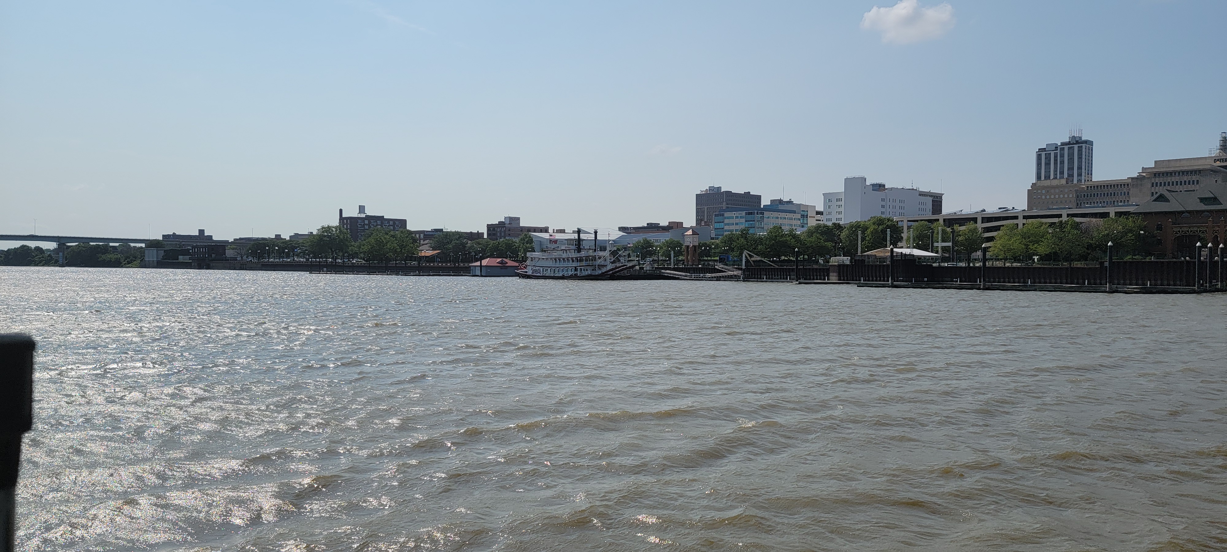 We were slightly concerned about safety overnight, but there was nothing to worry about. The docks are against a very high wall next to a park. From the park, only the top of our boat was visible, plus our antenna, and our boat was about eight feet from the wall. So if anyone even noticed it was there, they couldn’t reach it, and the hassle of having to walk down to the Spirit of Peoria (where there are cameras), down the ramp, past the fire department boat garage, through an unlocked gate, would have been too much for all but the most determined of ne’er-do-wells. We could hear people in the park in the evening and again at bar closing time, but no one was interested in us.