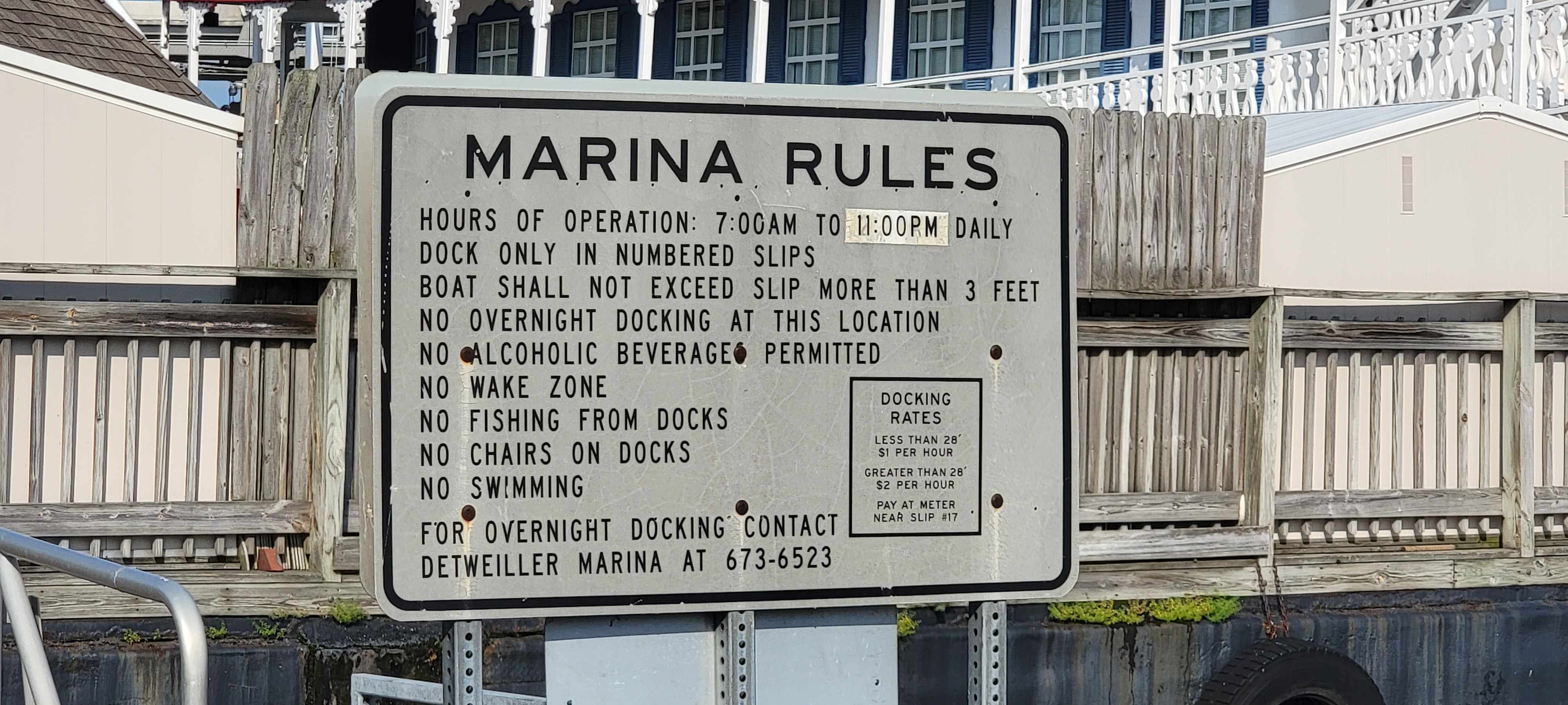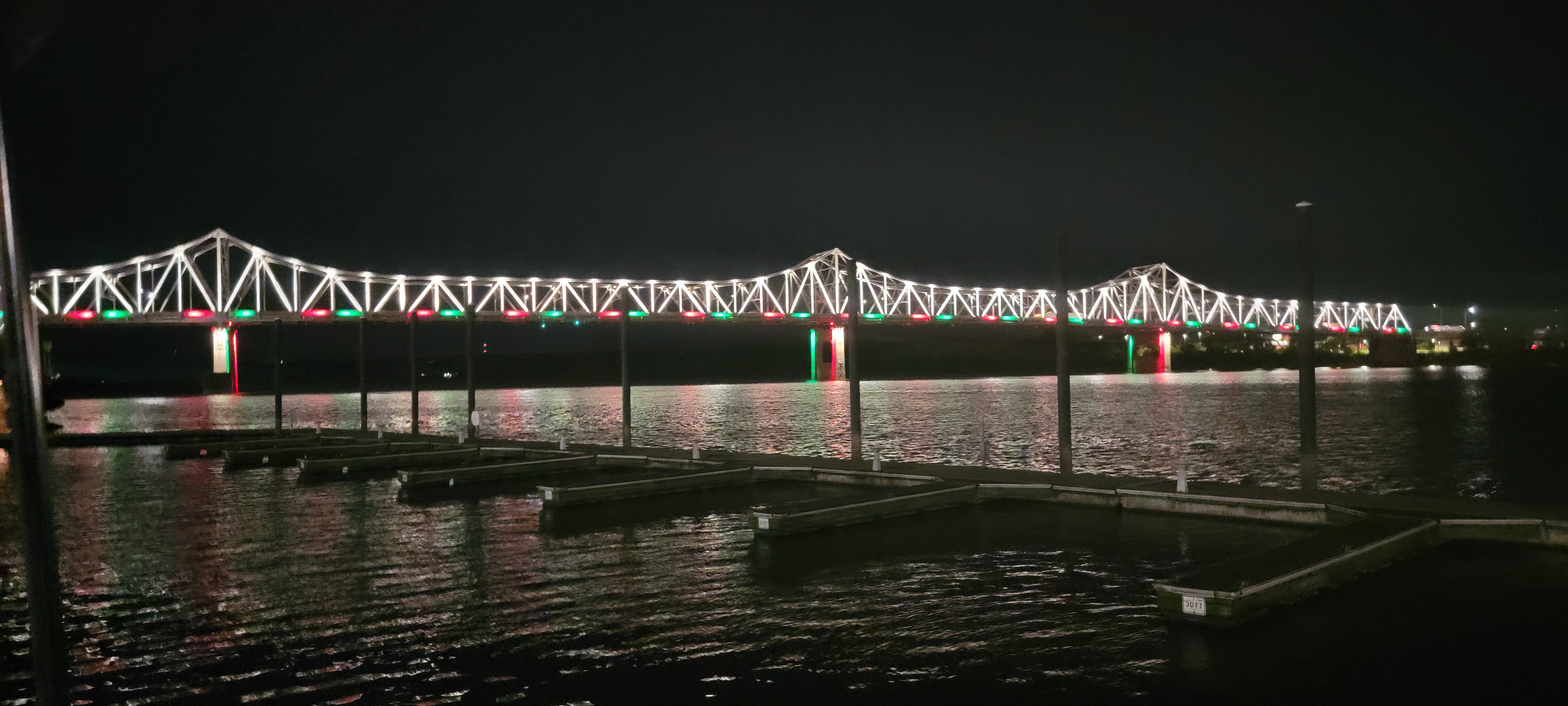 Soon enough we saw the Spirit of Peoria, and we knew our stop for the night was right behind it. There were slips for 25′ and 30′ boats, and there was an Our Dash-sized spot along the edge. We were also welcomed by a sign warning of mixed sewage. We were the only boat there. After we docked and got off the boat, we saw a sign that said the docks were closed for the winter. We were able to hook up to 30 amp power. We had heard that the power pedestals were hit or miss, and we were fortunate that the first one we tried worked. We followed the dock to the Spirit of Peoria, which provided the entrance to the docks. There are public restrooms in a park building near the entrance to the Spirit of Peoria. A sign on the building says they are open Monday-Friday during business hours (7-4? 4:30?), but we found them to be open outside those hours.