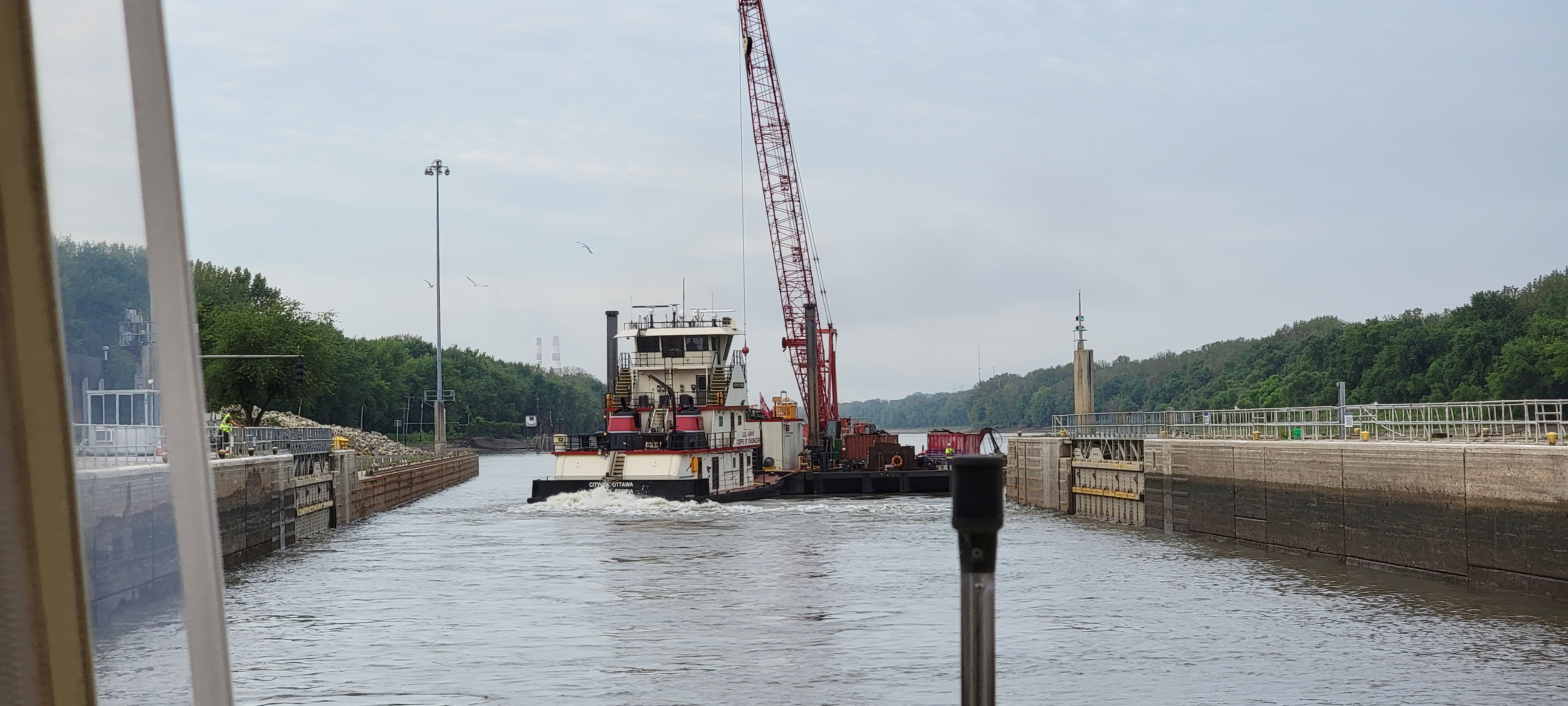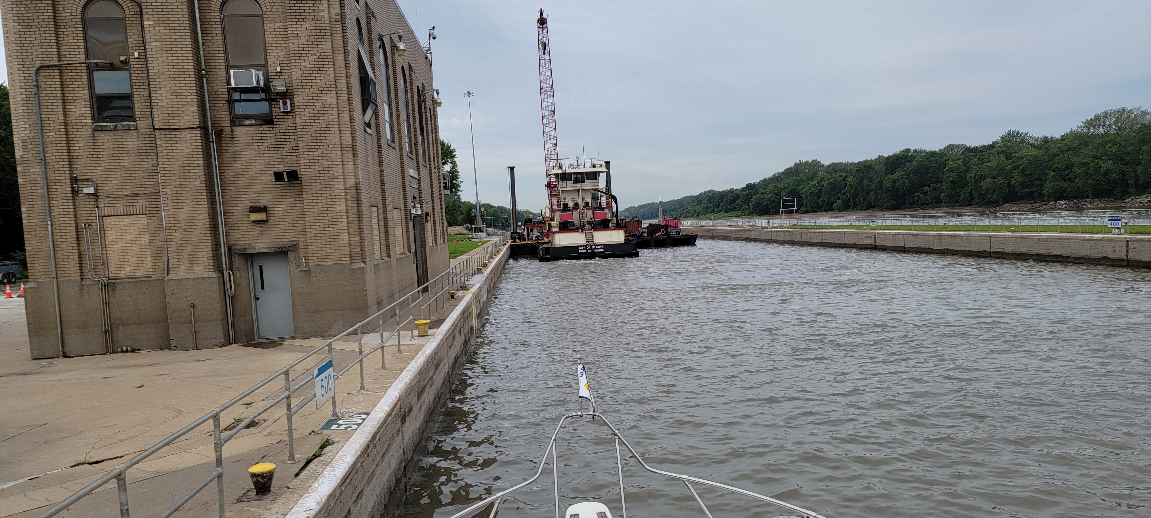 We got lucky at the Peoria Lock. When we arrived, there was a big tow in the lock heading north, one waiting behind it to go north, and a Corps of Engineers construction tow, City of Ottawa, waiting to go south. The rules are that commercial traffic has priority over pleasure crafts and Corps traffic has priority over all. So… it could have been a long wait.