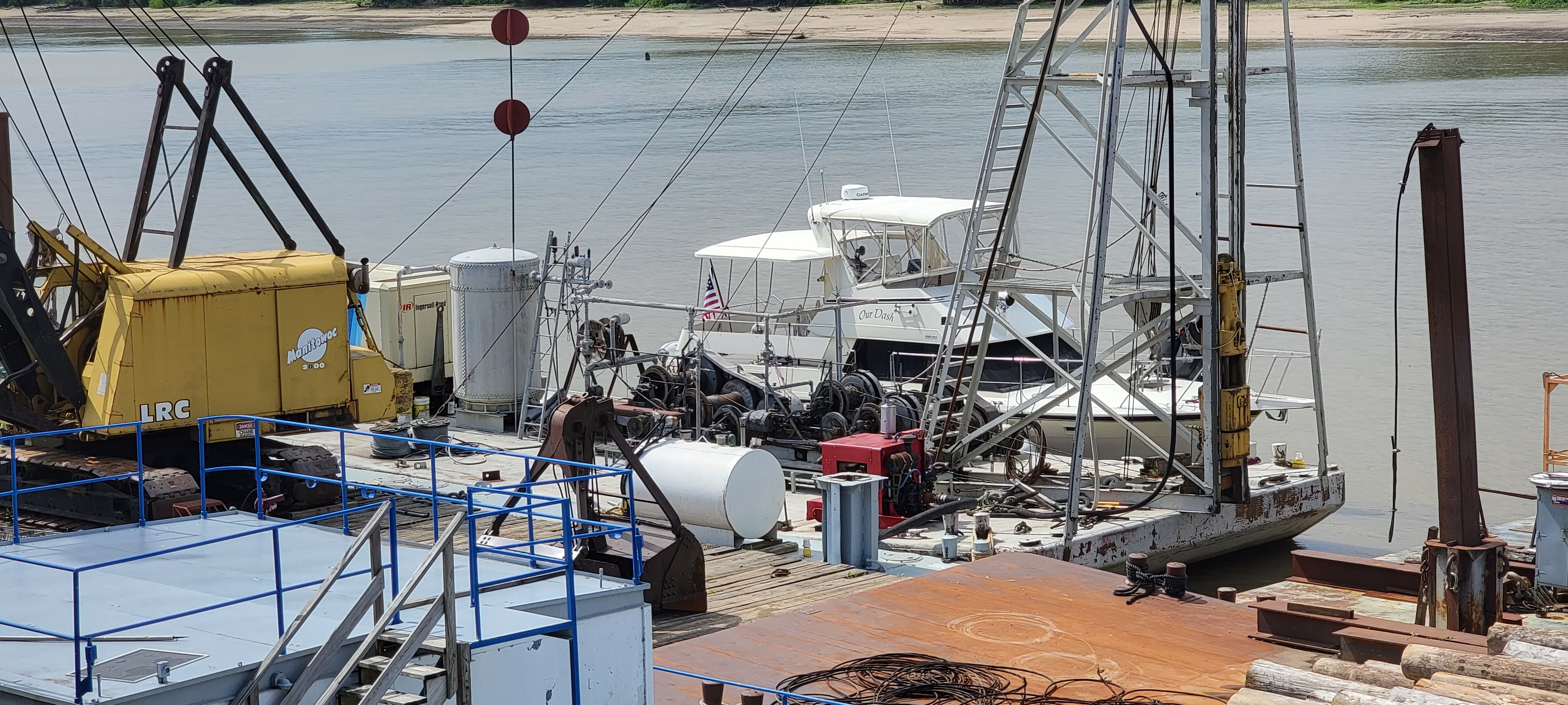 As we got close, I radioed on channel 10 and the guy told us to just tie up on the barge with the white crane on it. Um… ok.
