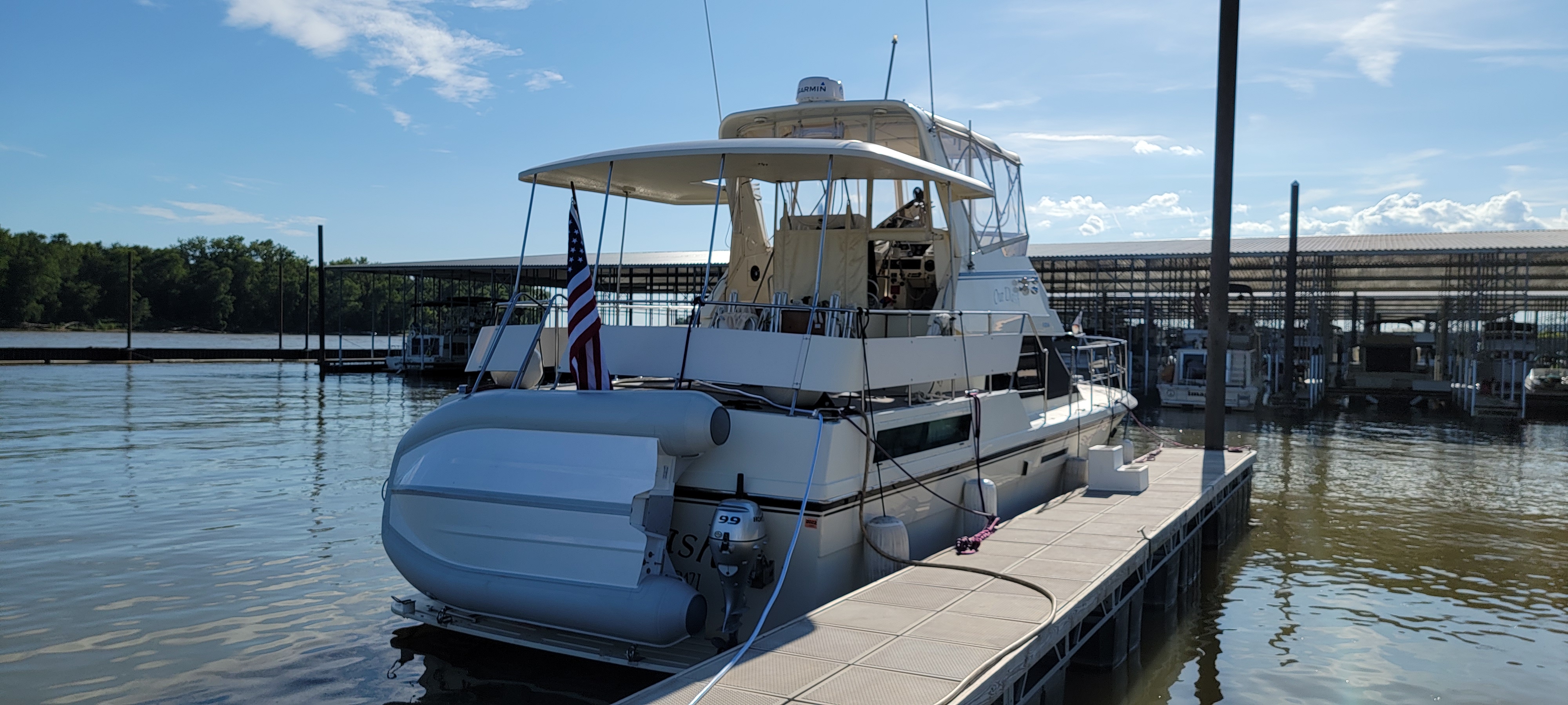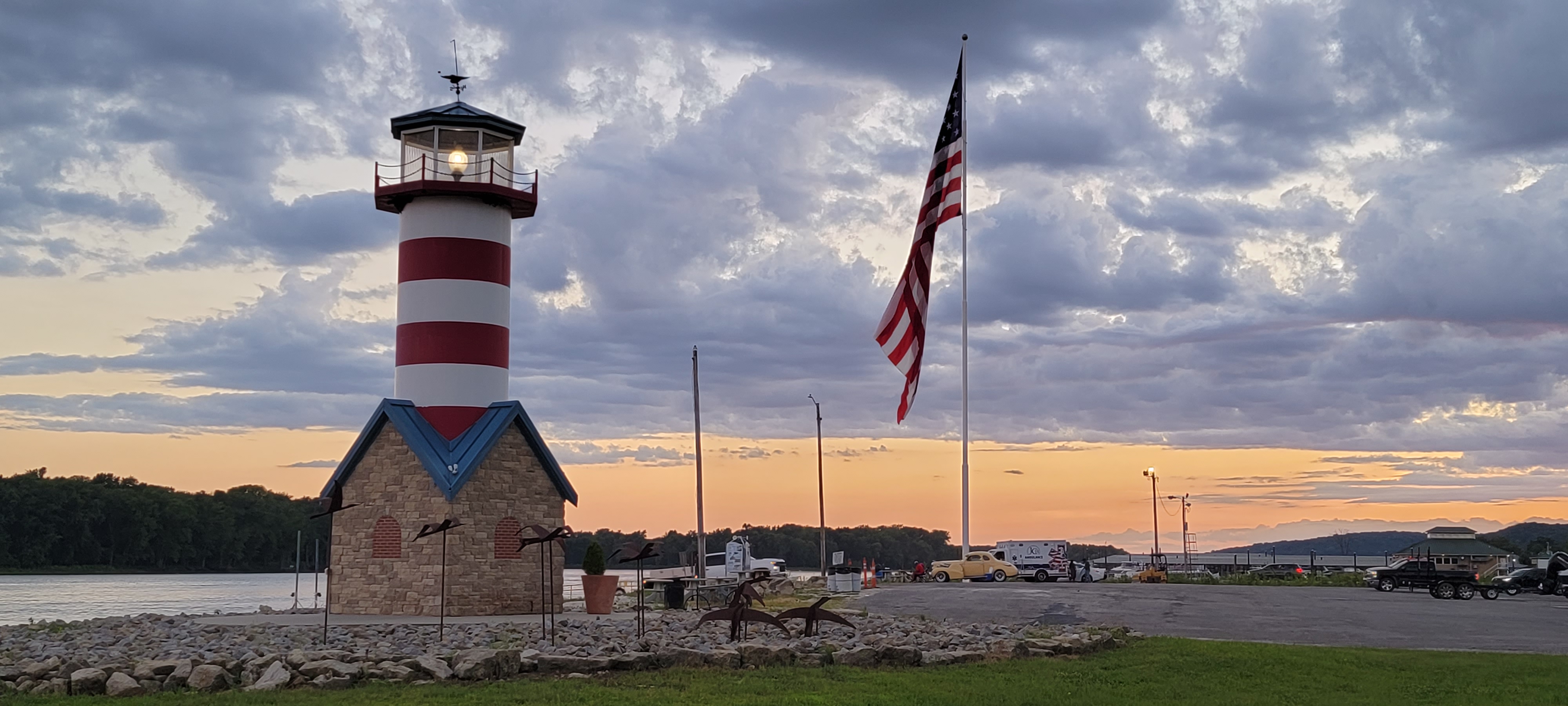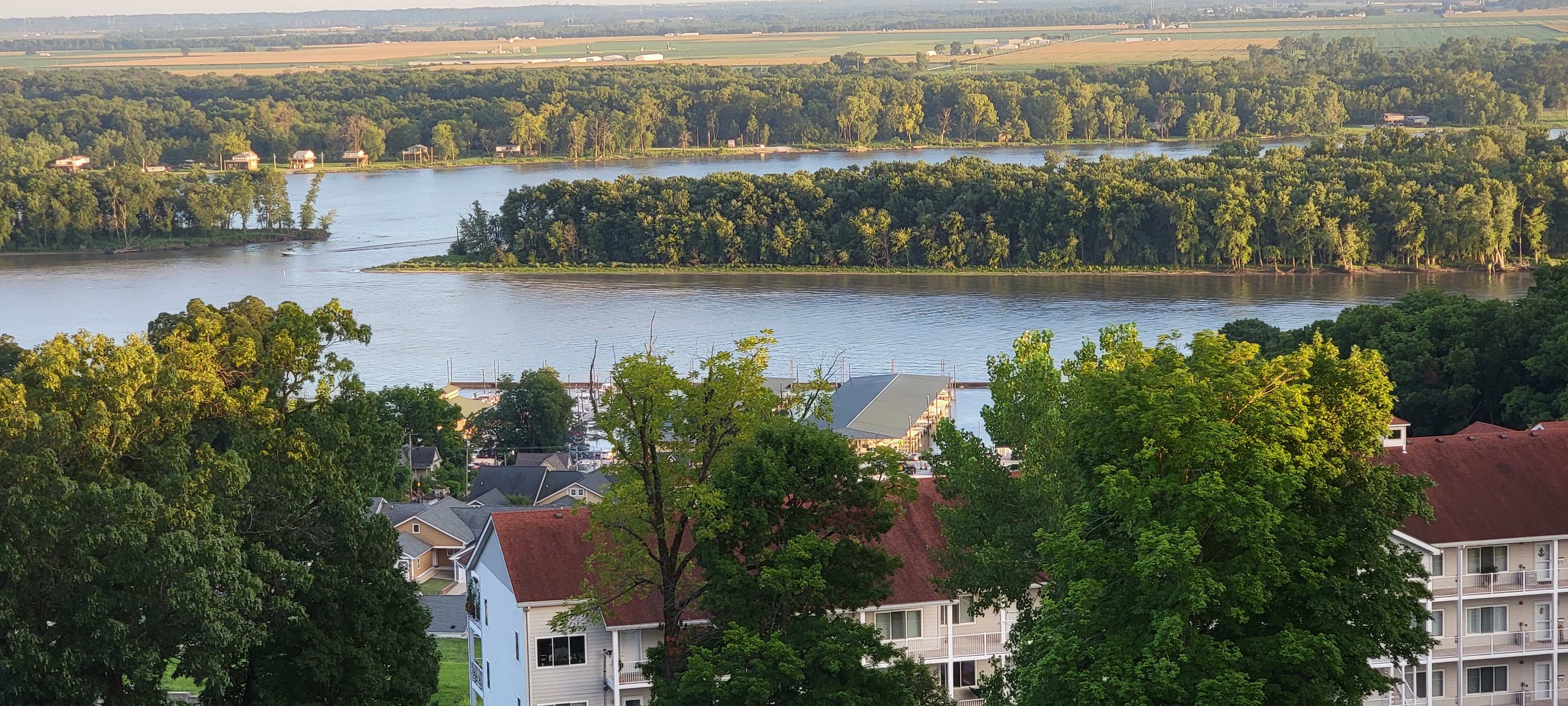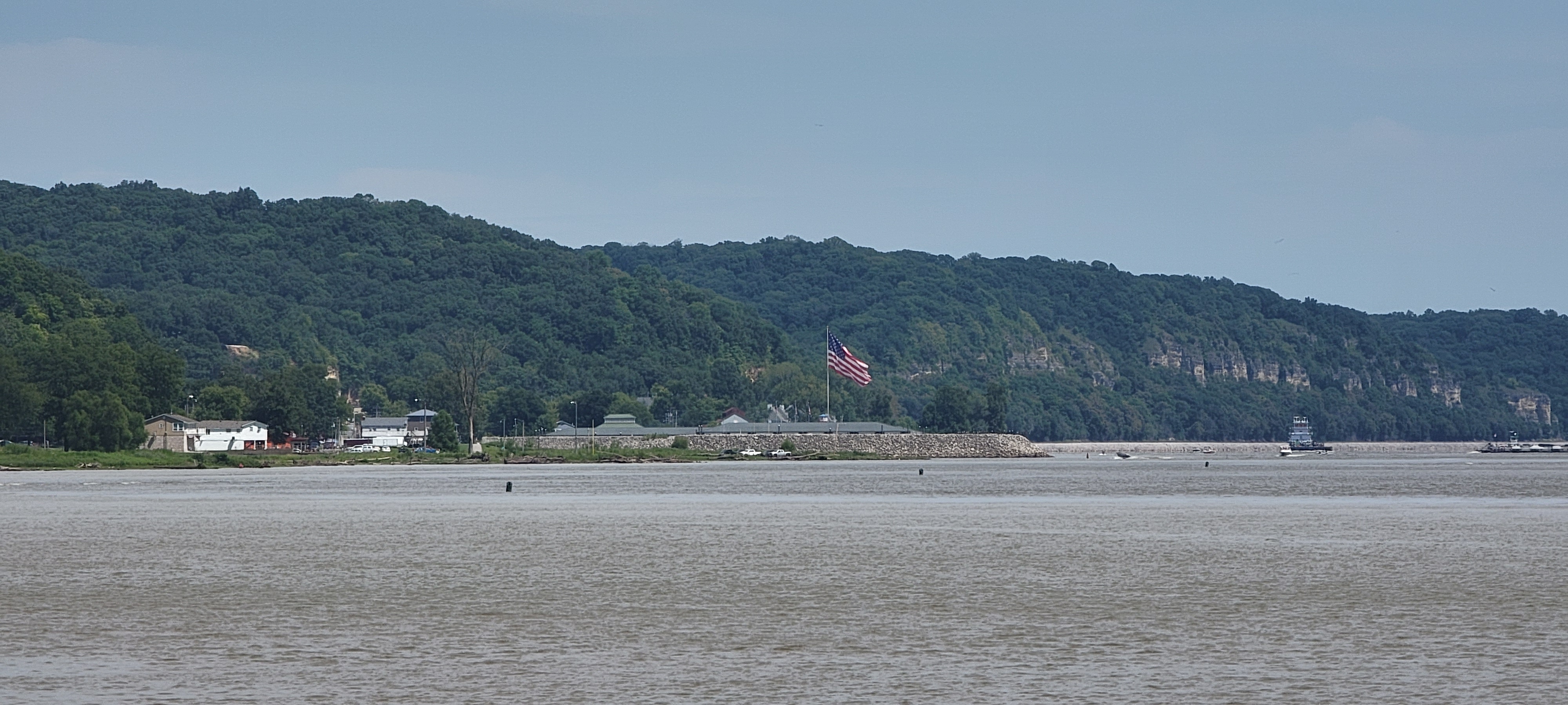 Since we left Beardstown at Mile 88 and Grafton Harbor is at Mile 0 of the Illinois River, we had a built-in countdown for our day’s journey. When we eventually pulled into Grafton Harbor, they were ready for us. We were placed at the end of a T-dock. We were glad to be hooked up to 50 amp power and have access to water for the first time in awhile. The marina is pretty shallow with just two feet under us, and we are one of the the larger boats here. Our dock appears to be the only one not secured with a gate at the end, which is uncomfortable for us.