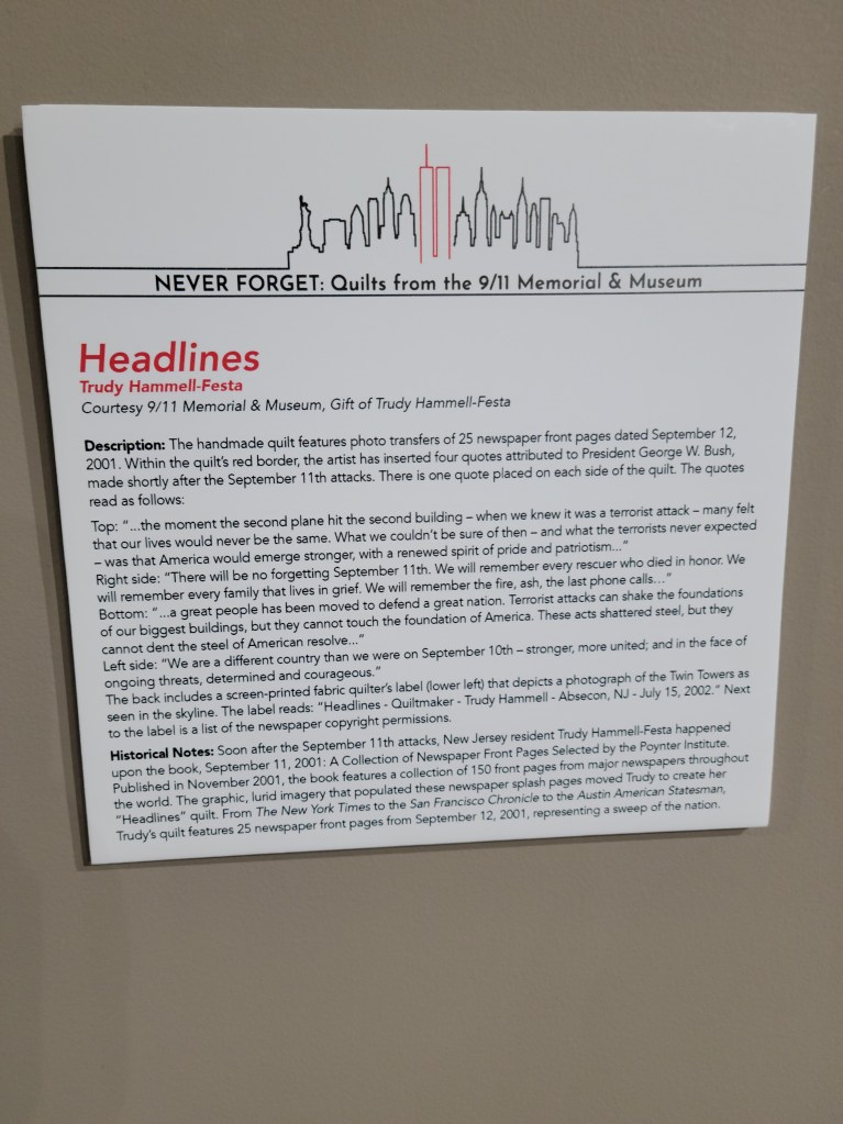 I’m not a quilter, crafter, or artist, but I know what’s pretty or thought-provoking and can appreciate skill and craftsmanship. There was a special section of the museum dedicated to Covid and one filled with quilts on loan from the 9/11 museum. One in particular caught my eye. It was a quilt with screen printed front pages of newspapers from 9/12/2001. The 25 rectangles were surrounded by quotes by President Bush in response to the event. Of all the newspapers in our country, the artist chose the cover of my hometown paper, the Appleton Post Crescent, to be included.