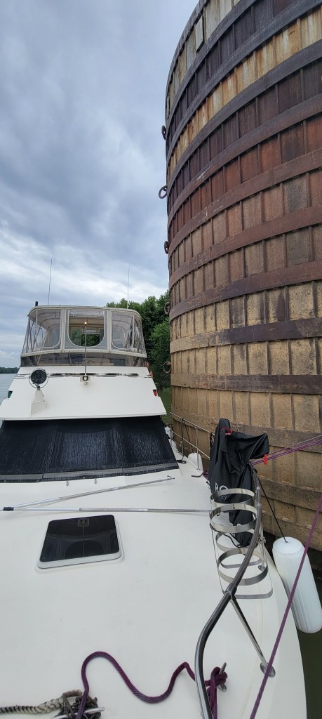 Our AIS showed a tow in the Barkley Lock well before we got there, so we thought our Lock Luck was kicking in. When we arrived at the lock, the tow was still in there. Well, mostly in but partly out. When Owen called the lockmaster to request a lock-through, the lockmaster said the tow was stuck! He didn’t know how long it would be, so we should settle in.