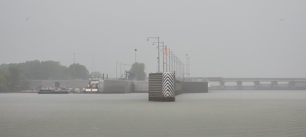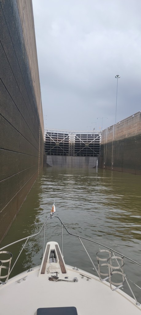 And then we saw the tow start moving out of the lock! Our days-long potential wait ended up being about an hour. (FYI, the lockmaster never indicated how long it would be. He couldn’t know! My imagination kicked in before common sense could work its way in.)