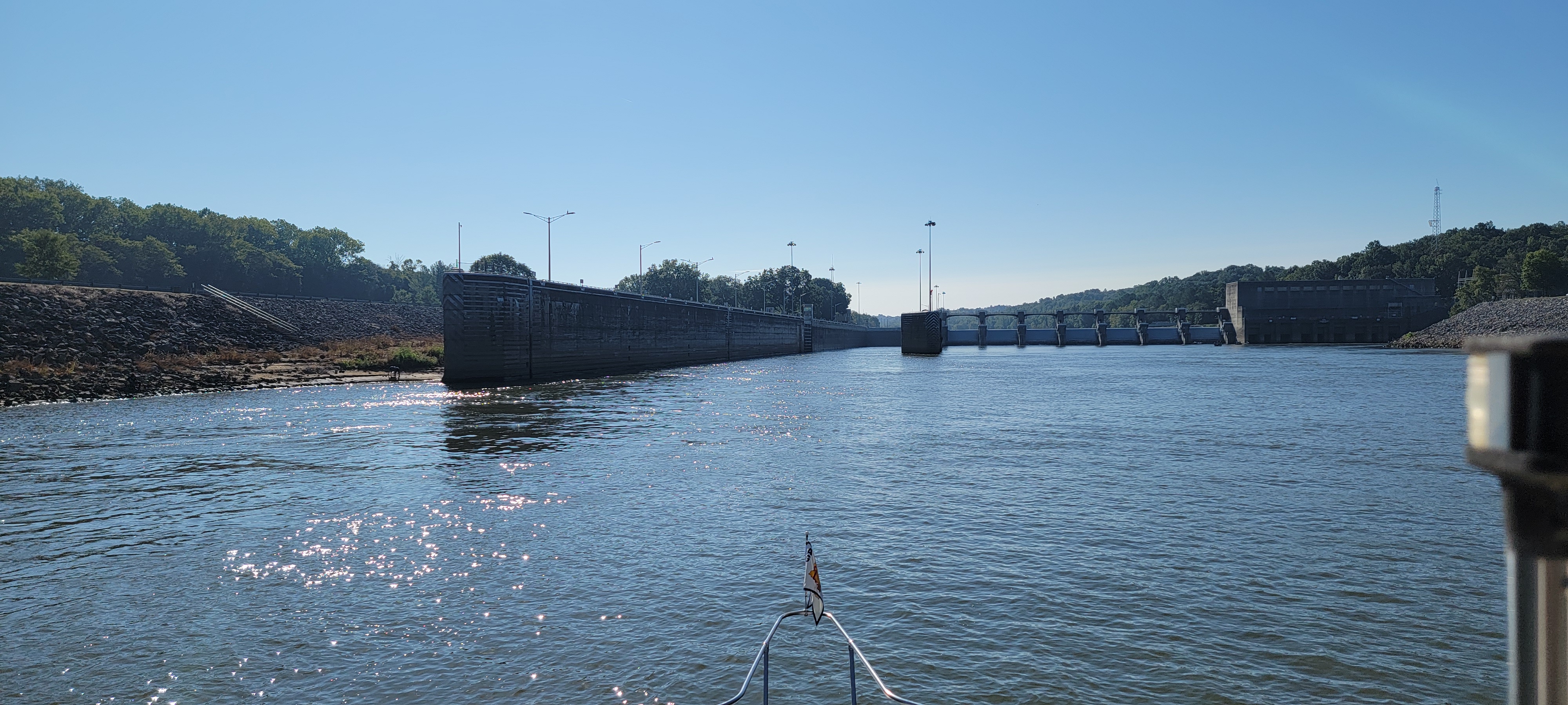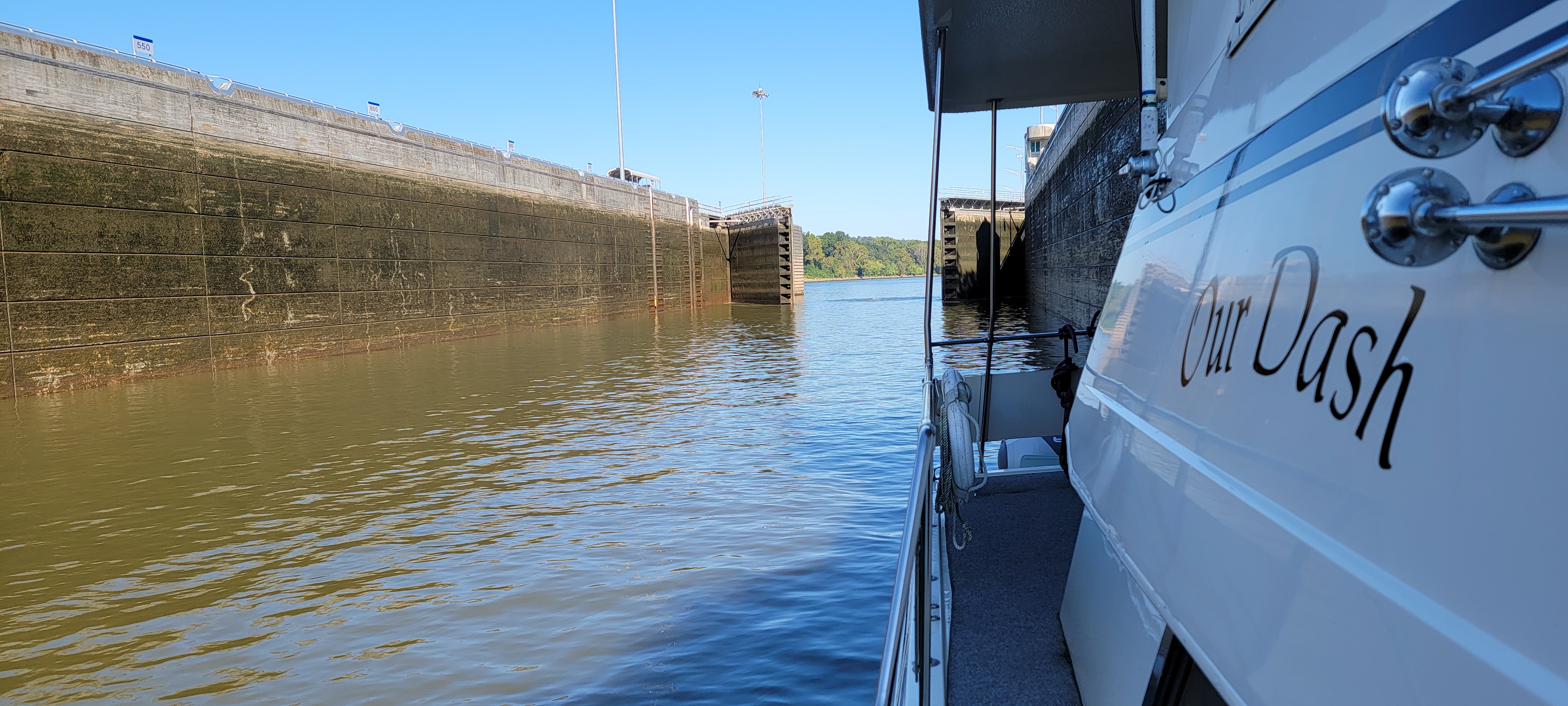 By the time we got to the lock, the fog had lifted and the tows had almost cleared. As we approached, the last tow was pulling out to go down river and we went right in behind them. After waiting a few minutes for a house boat to lock through with us, we went up 27 feet and on our way.