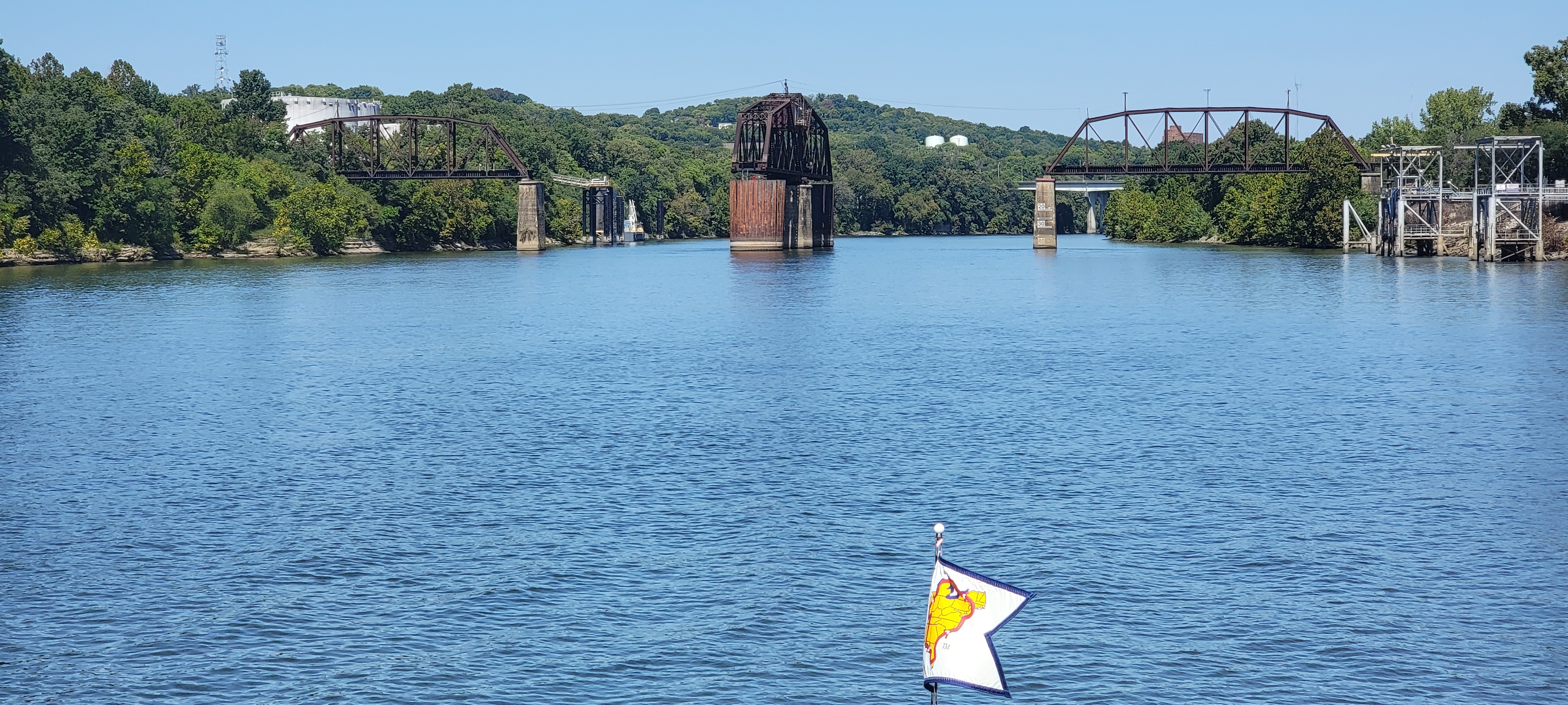 As we came under the pedestrian bridge, a tow came the other way and called us on 16. We scooted to the one whistle at his request as he passed. Once passed, we turned around and went back to dock on our port side. Unfortunately, the power pedestal we chose was dead, so we moved to the other side of the dock.