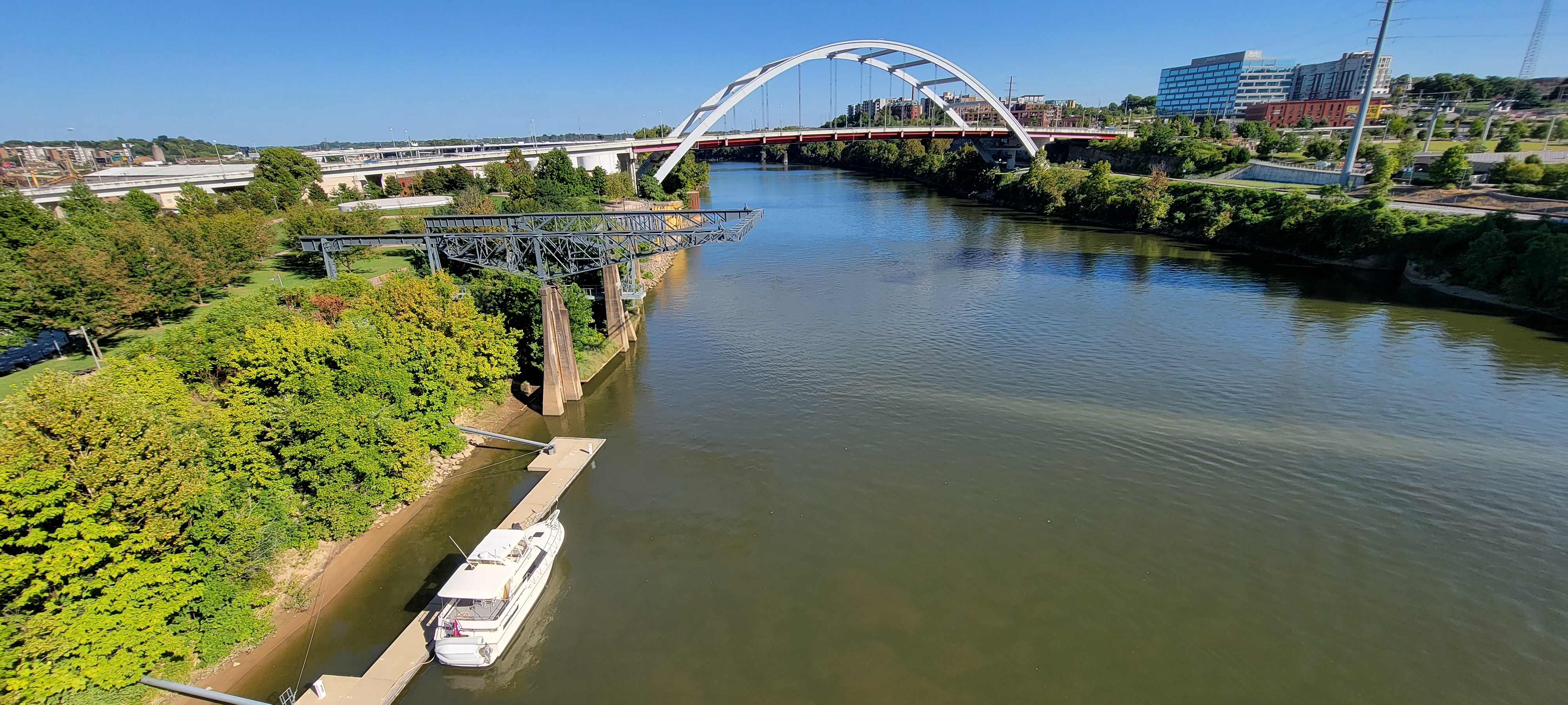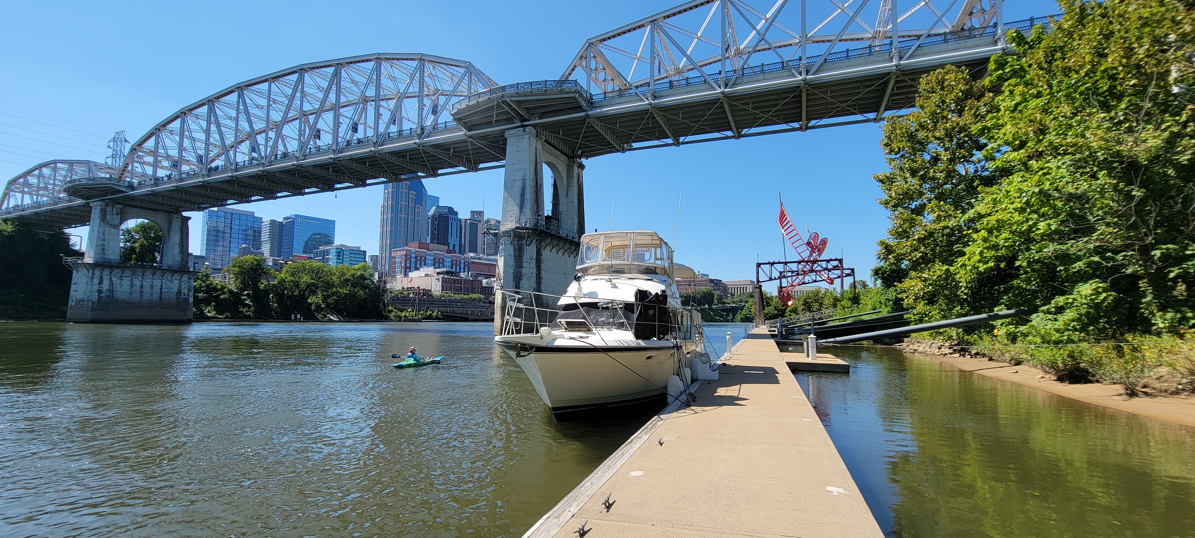 Coming into Nashville was really neat. We sailed past downtown and spied the empty Municipal dock in the right descending bank. The dock is really low, so Wendy set about putting our fenders right.