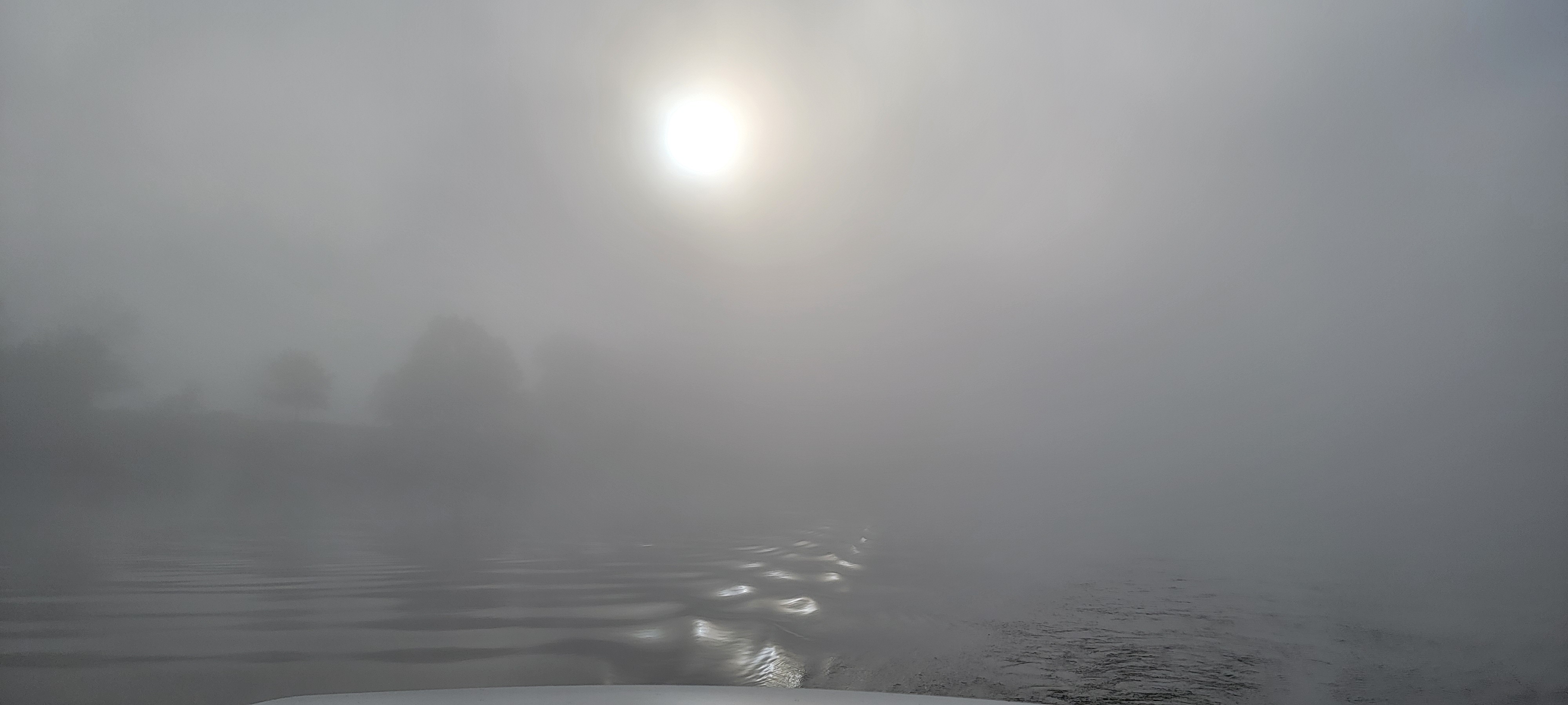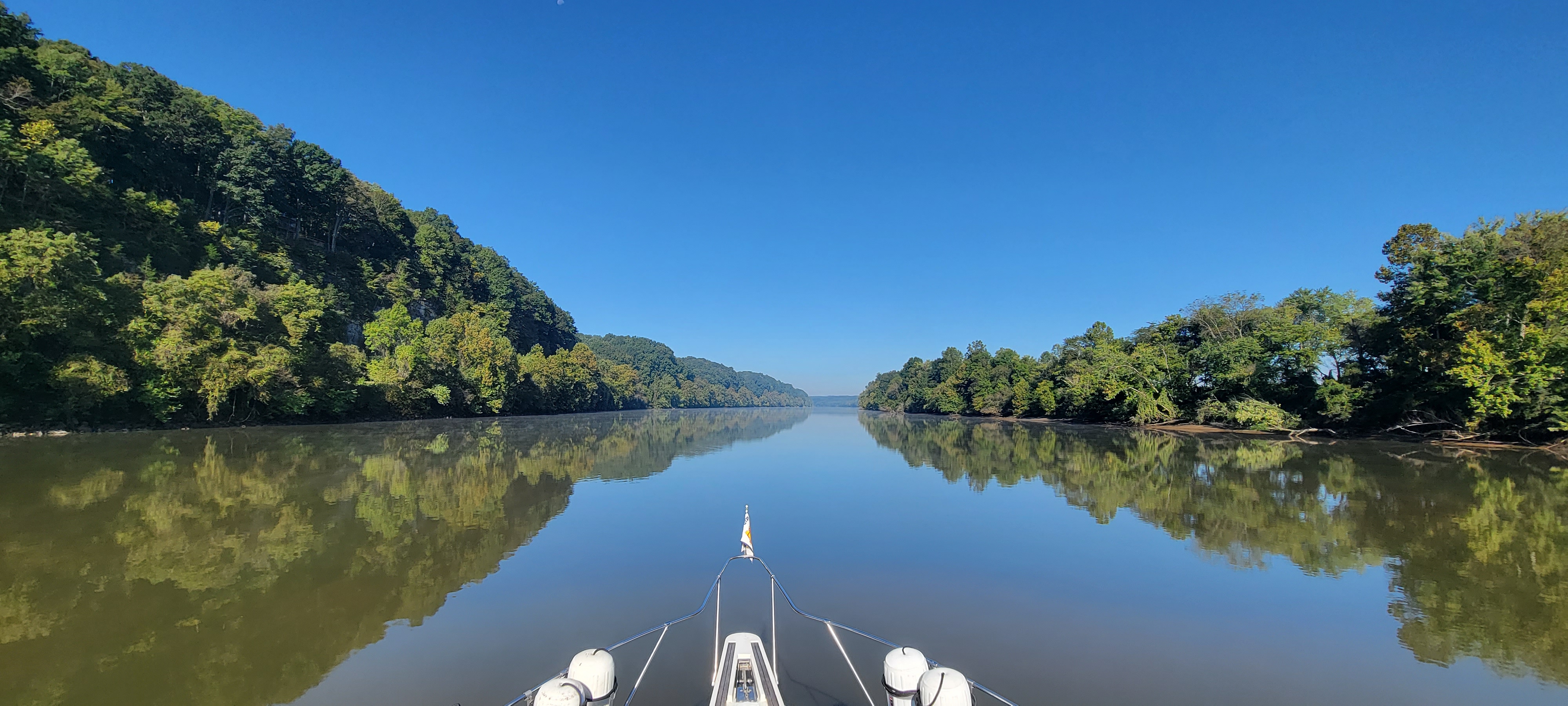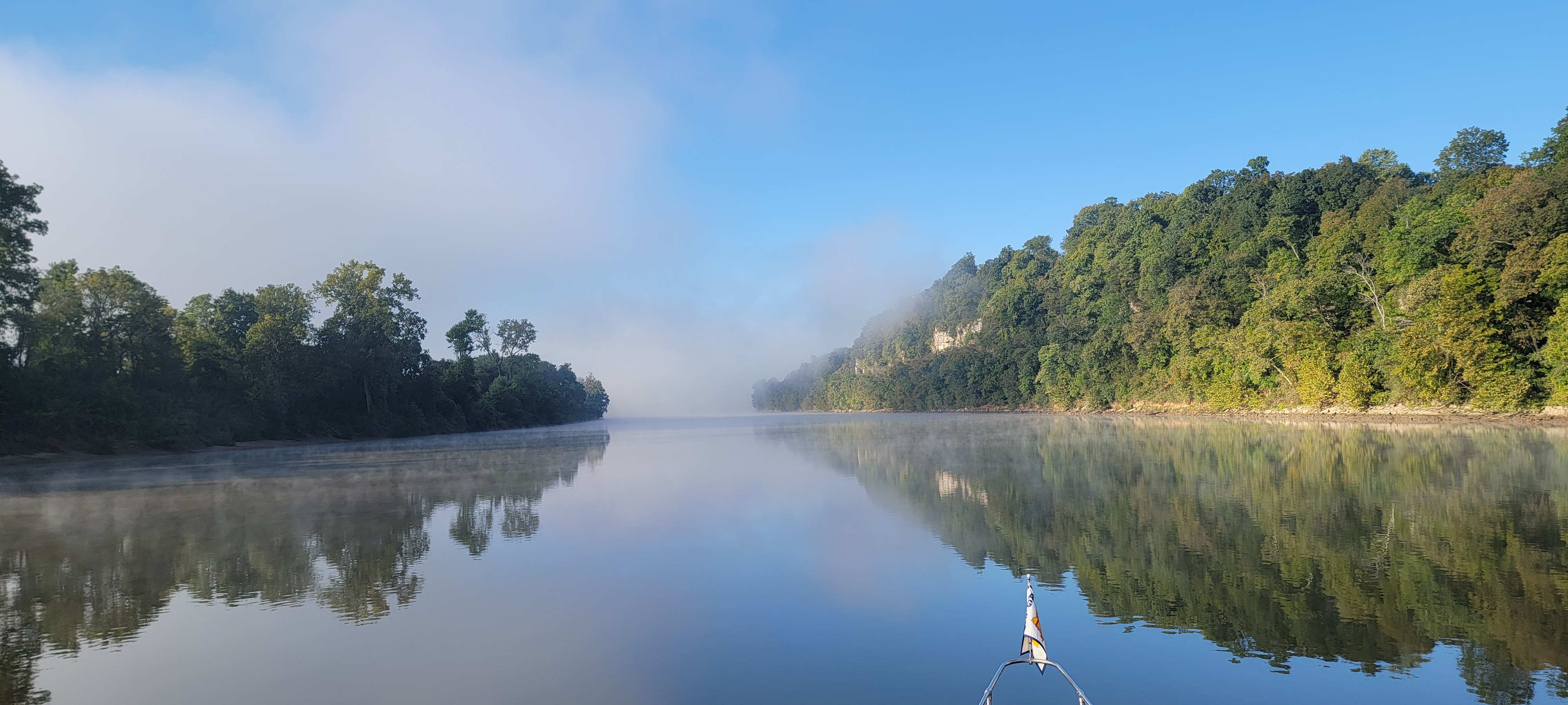 As we got out onto the Cumberland and pointed our bow downstream, we were quickly notified by Mother Nature that she was not done playing with the fog. As we went through several banks of dense fog, we turned on the light, blared the horn, and Wendy took watch on the bow peering into the inner-bowels of a ground cloud waiting for her chance to scream, “ICEBERG! STRAIGHT AHEAD!” Fortunately, there are very few icebergs on the Cumberland in September. By 0830 or so, the fog had all cleared out and we were welcomed by a beautifully calm ride.