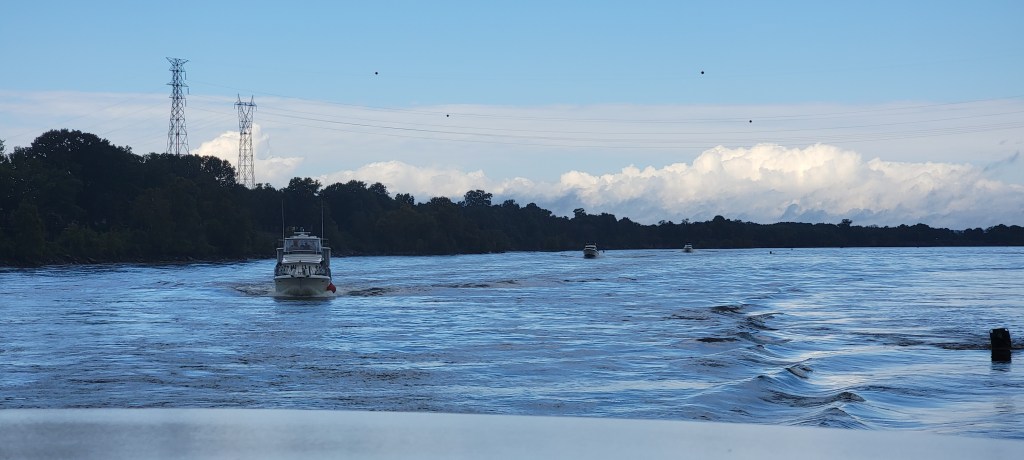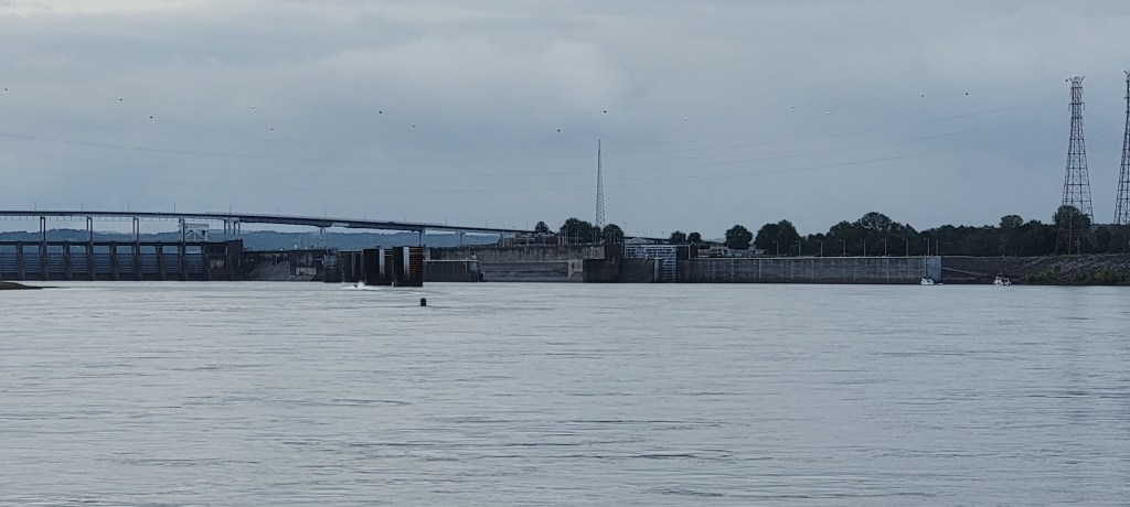 We took off out of Clifton at first light. We only had about 63 miles to go, but the Pickwick Lock was between us and our destination at Grand Harbor on Pickwick Lake. The main lock was undergoing an unscheduled repair, so they were using the secondary lock. Plus, some rain had increased the flow and we had read that the dam was letting out a strong flow. For all those reasons, we wanted to give ourselves the whole day to get through.