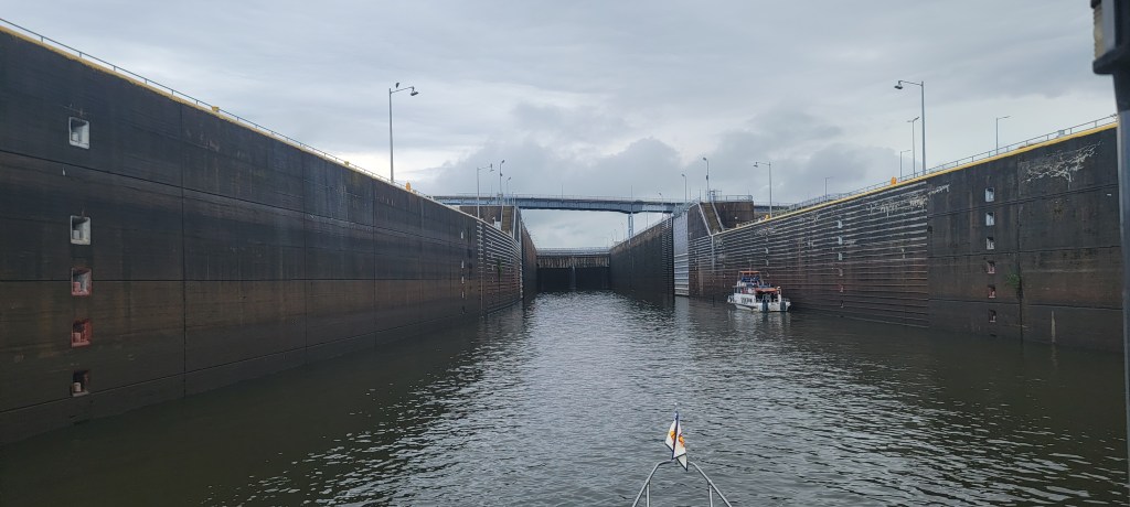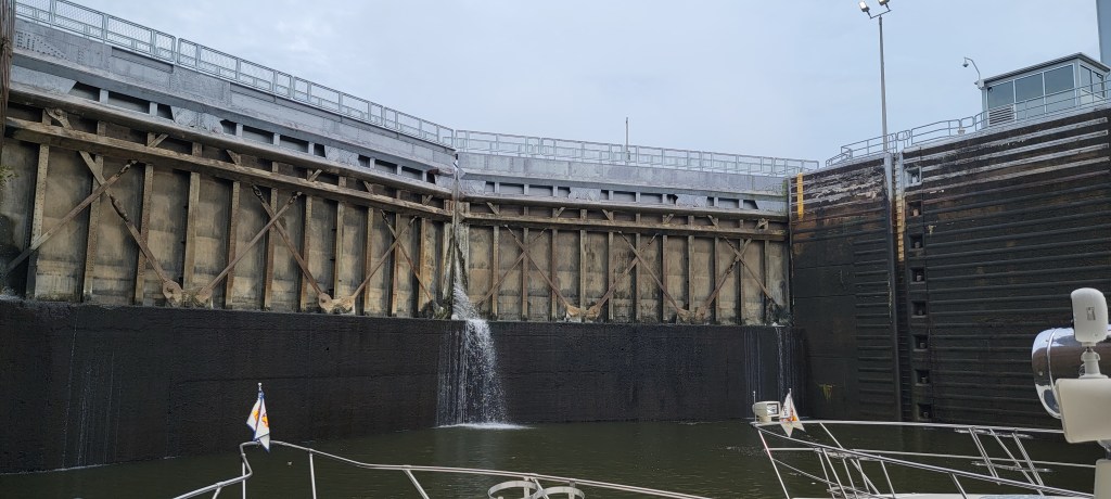 When we were an hour from the lock, we called in to let them know we were coming. By now, we had four loopers in a flotilla: Our Dash, Tick Tock, Auntie Gail, and Harmony. The Lock Master told us to keep coming. There were two people waiting and he’d try to get us through.