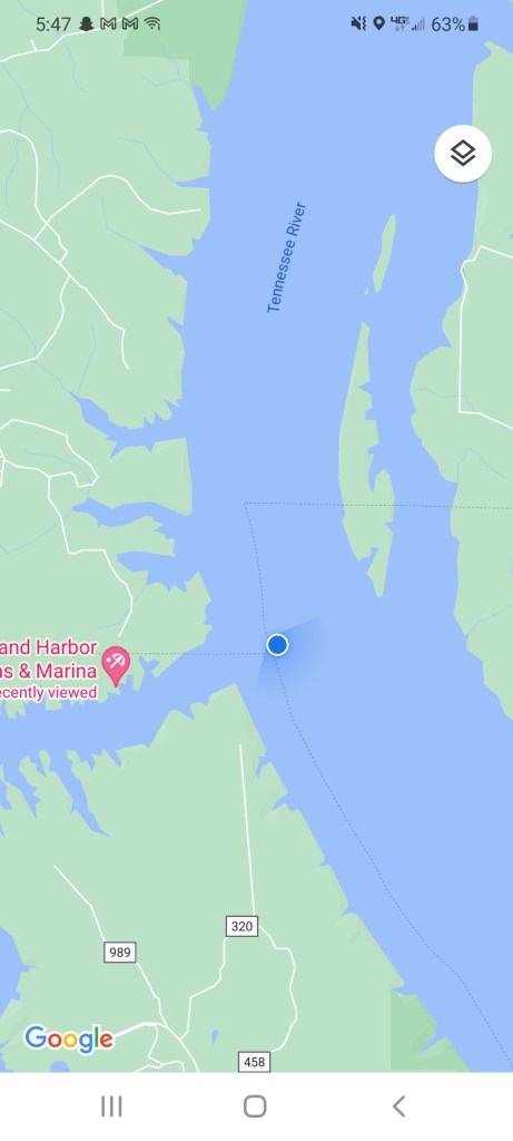 On one of our first evenings in Iuka, we took the dinghy for a spin. We went up and down the coast and across the lake to see what there was to see. Then, knowing we were near the point where the states met, we pulled up the map and took a screenshot when we were at the intersection of Tennessee, Mississippi, and Alabama. It was the boating version of Pokémon Go, I guess.