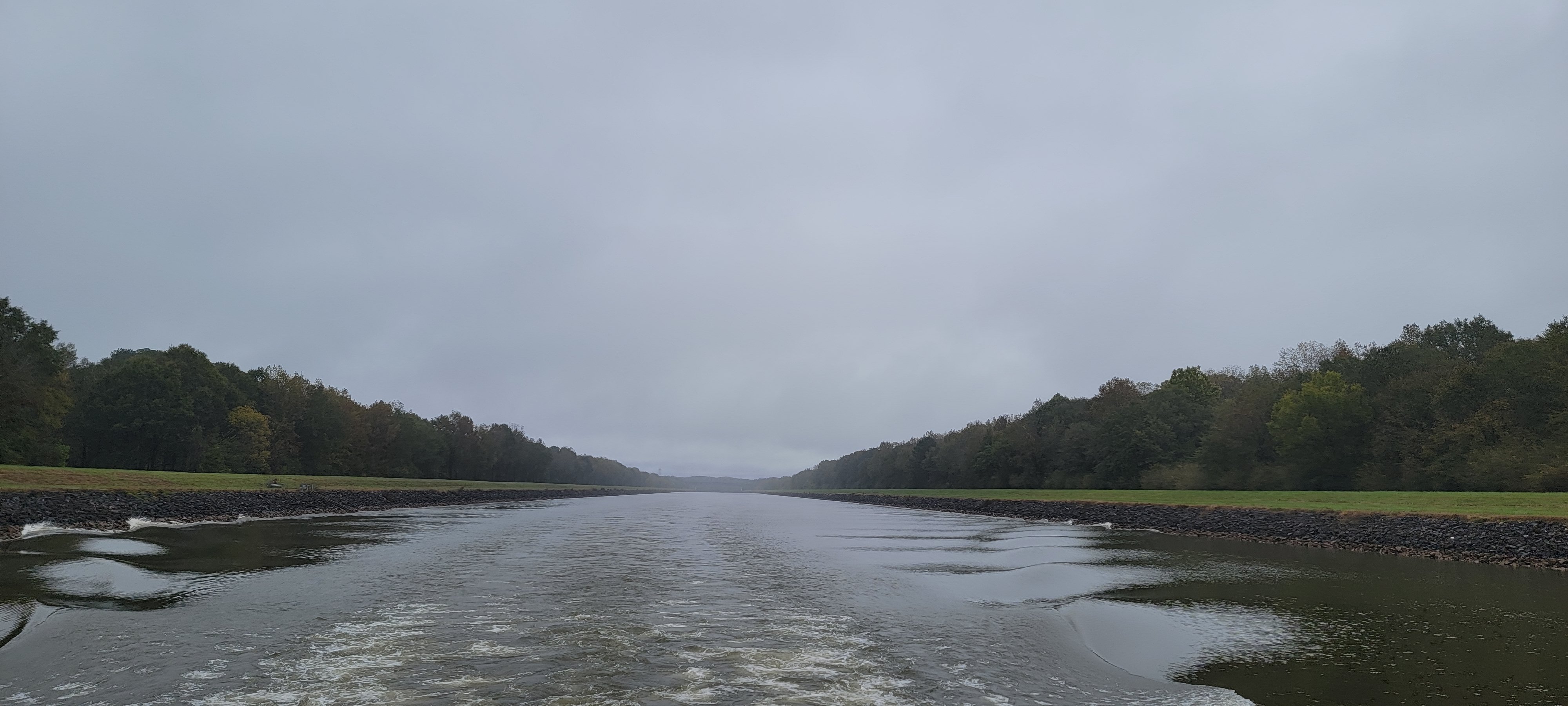 We pulled out of Aqua on a cold, rainy afternoon and made our way south. We made good time past Goat Island, through the ditch, and into Bay Springs Lake. I called the Whitten Lock and he said that he could get us right in. That would put us going through the final lock at about 5 PM – an hour before sunset – and only four miles from Midway Marina. Let’s go!