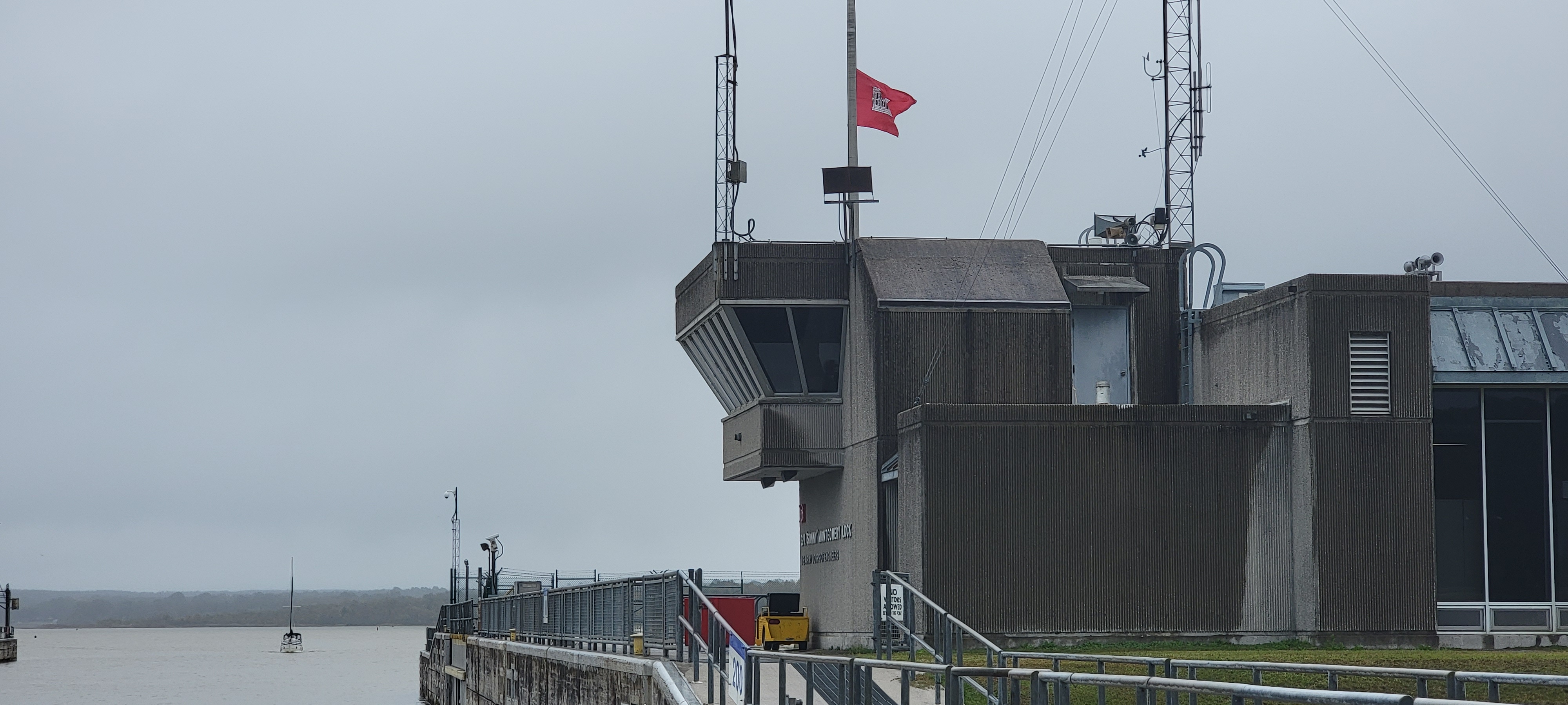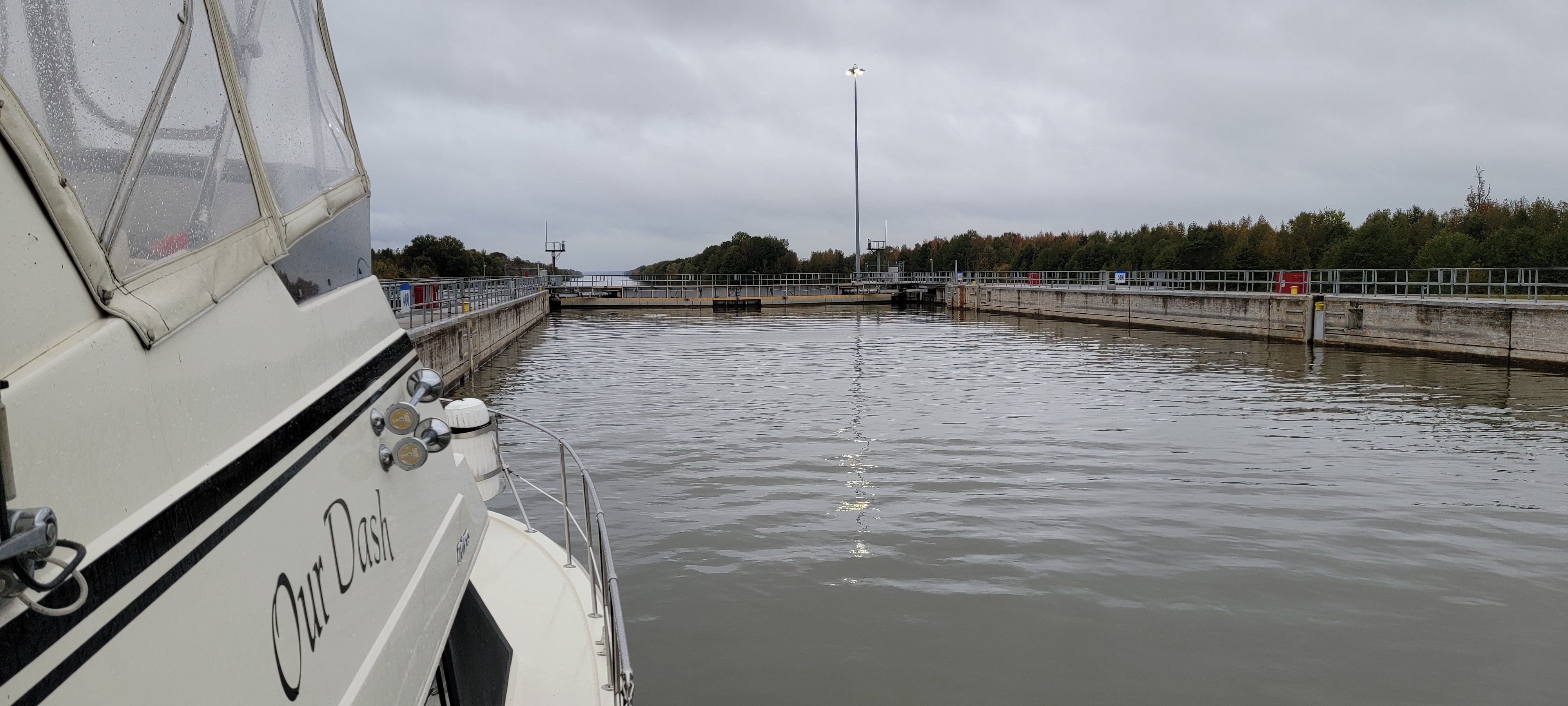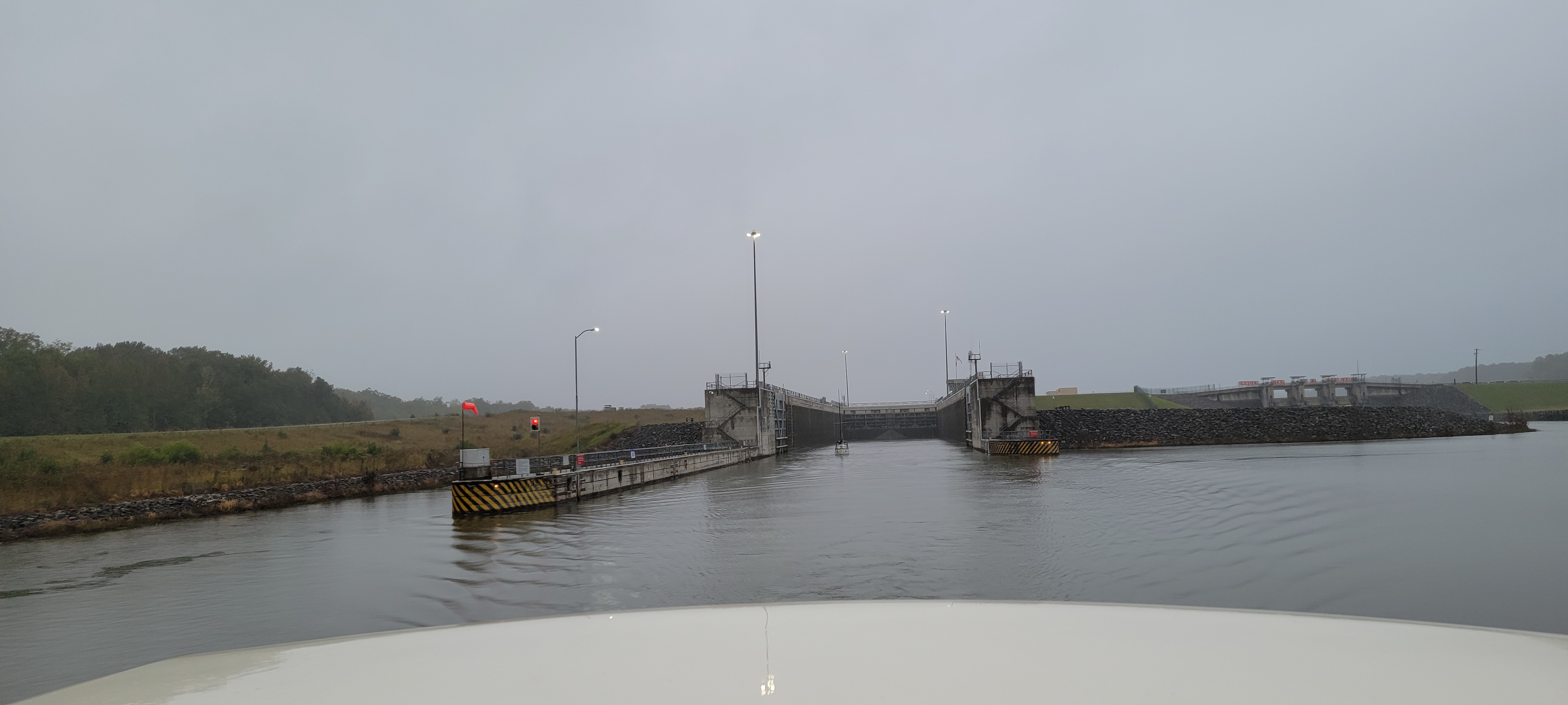 We went through the Whitten Lock without any issues other than the cold and wet. We went five miles and the Montgomery Lock was ready for us. After leaving the Montgomery Lock, we went the Rankin Lock about eight miles later. All told, it took us three hours to navigate all three locks and we exited Rankin at 1655.