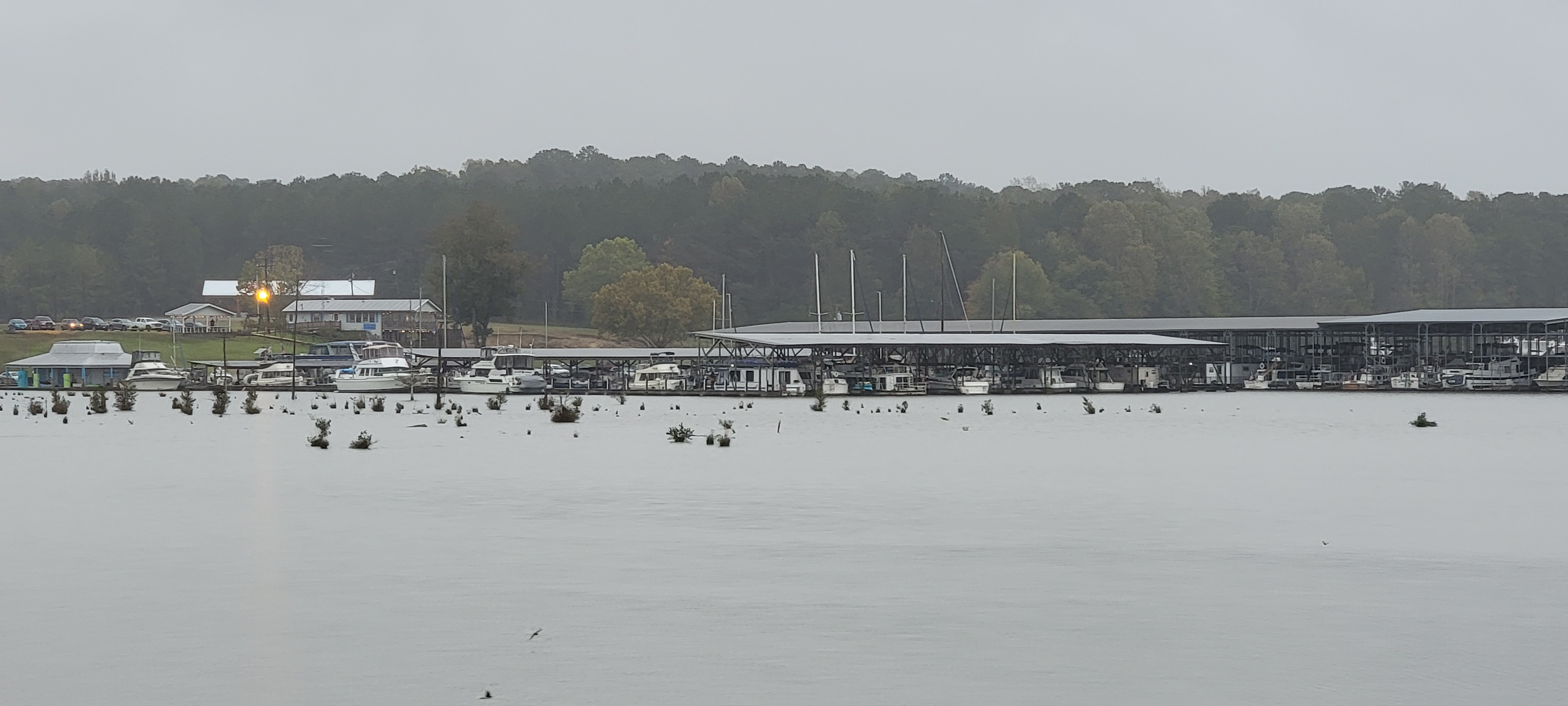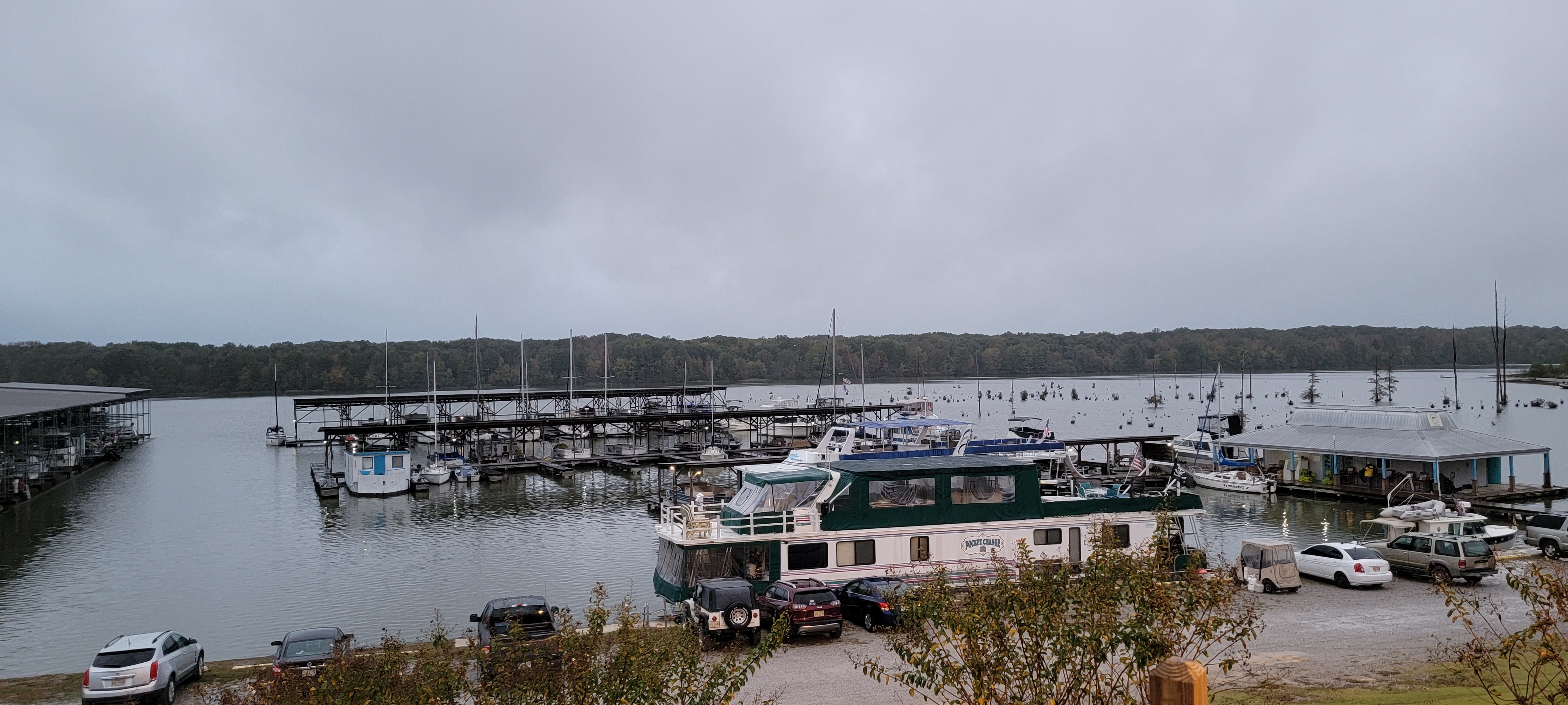 Midway Marina has an interesting approach. The marina is on the left descending bank and there is a lot of timber in the water just to the north. You have to make a 90 degree turn out of the channel and stay close to the markers. We came in, went around to the inside of the long dock, and nestled into our spot.