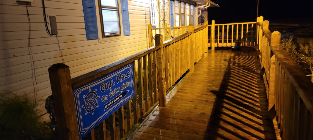 After checking in, we walked up the hill and enjoyed some shrimp and grits at Guy’s Place on the Water. Our head start ended up being 56.6 miles and three locks. That’s a pretty good head start!