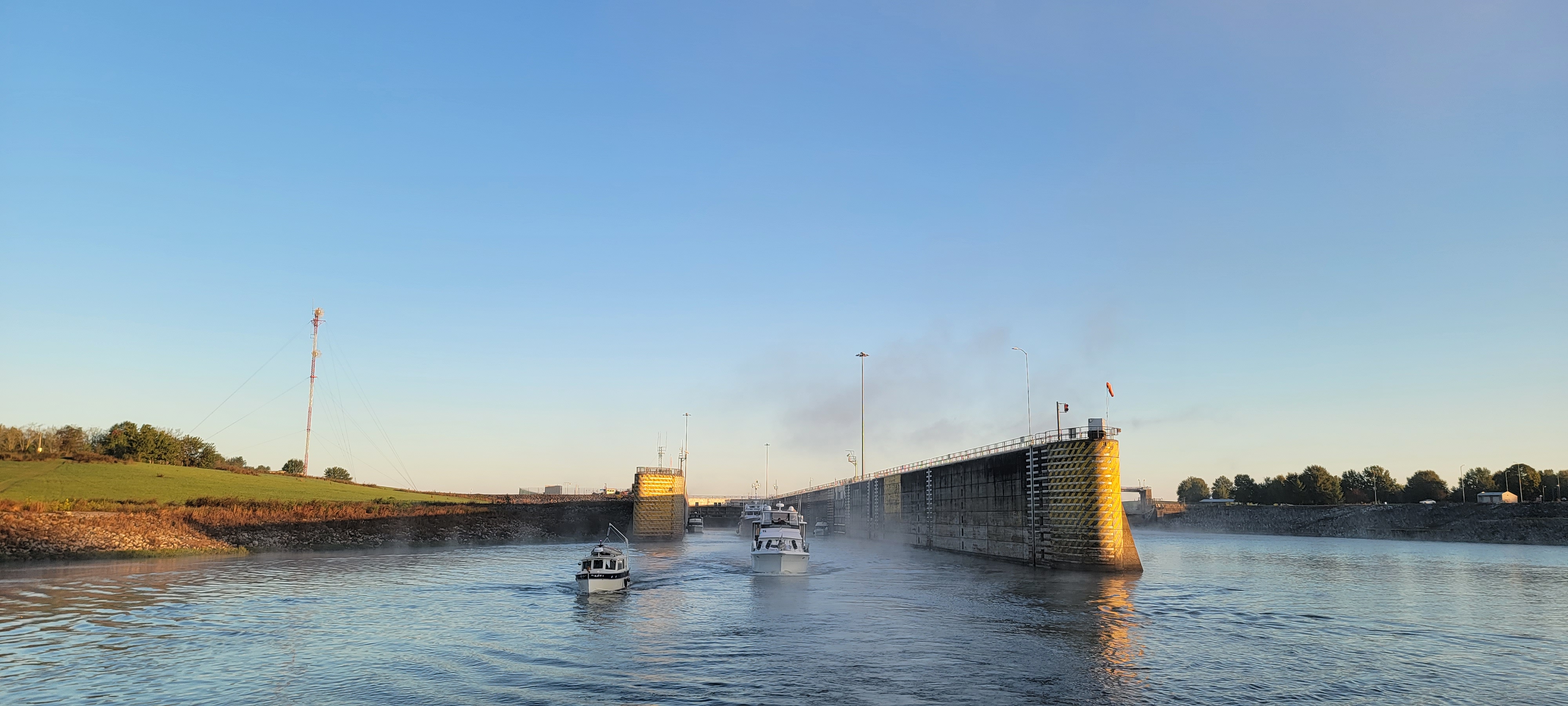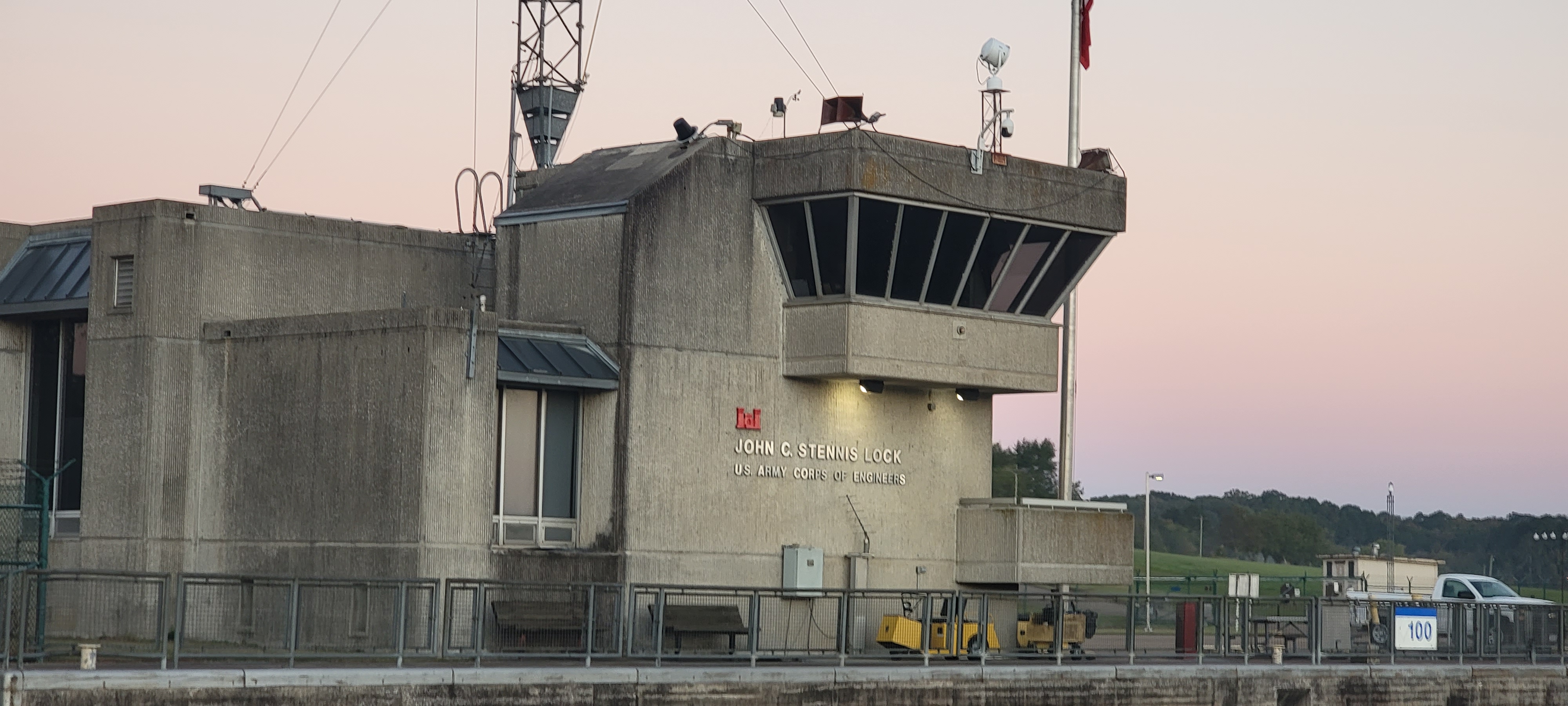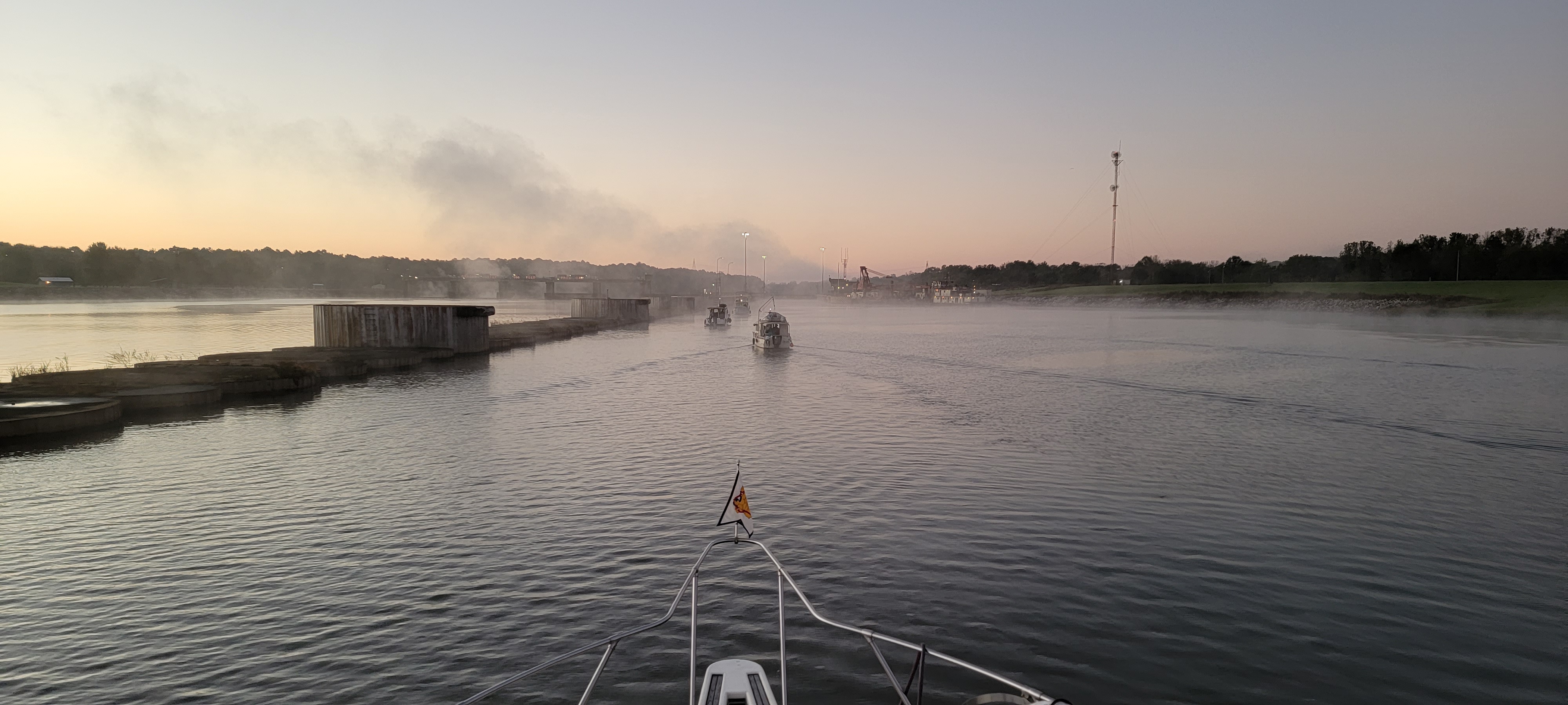 These cooler mornings sure do make pretty pictures. This morning, we left Columbus Marina at dawn with a few other boats, all of us hoping to cruise right to the Stennis Lock. Owen called the lock at 6:00 am, and the lockmaster said he thought we would be just fine arriving at sunrise. Sure enough, when we arrived the gate was open and the light was green. Our fellow boaters cruised in and tied up.