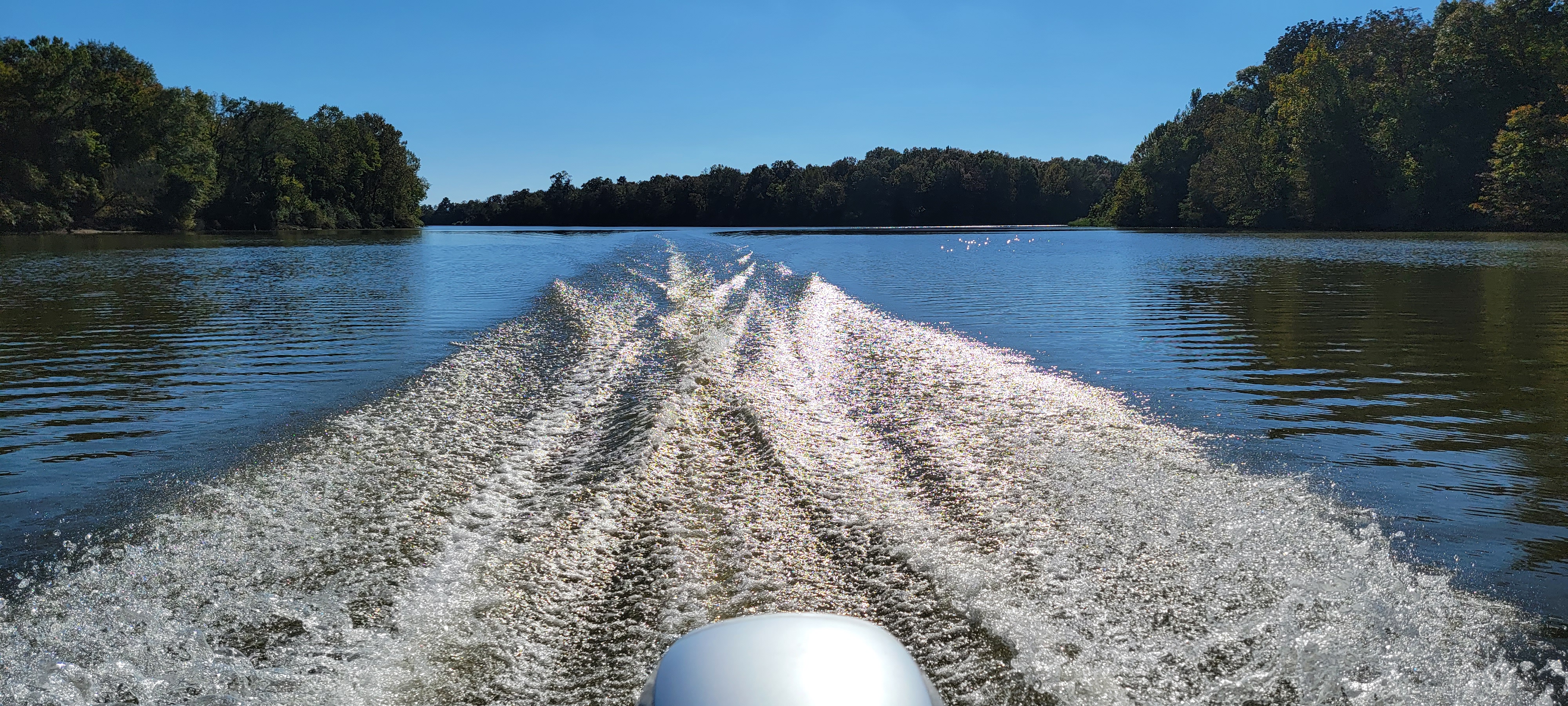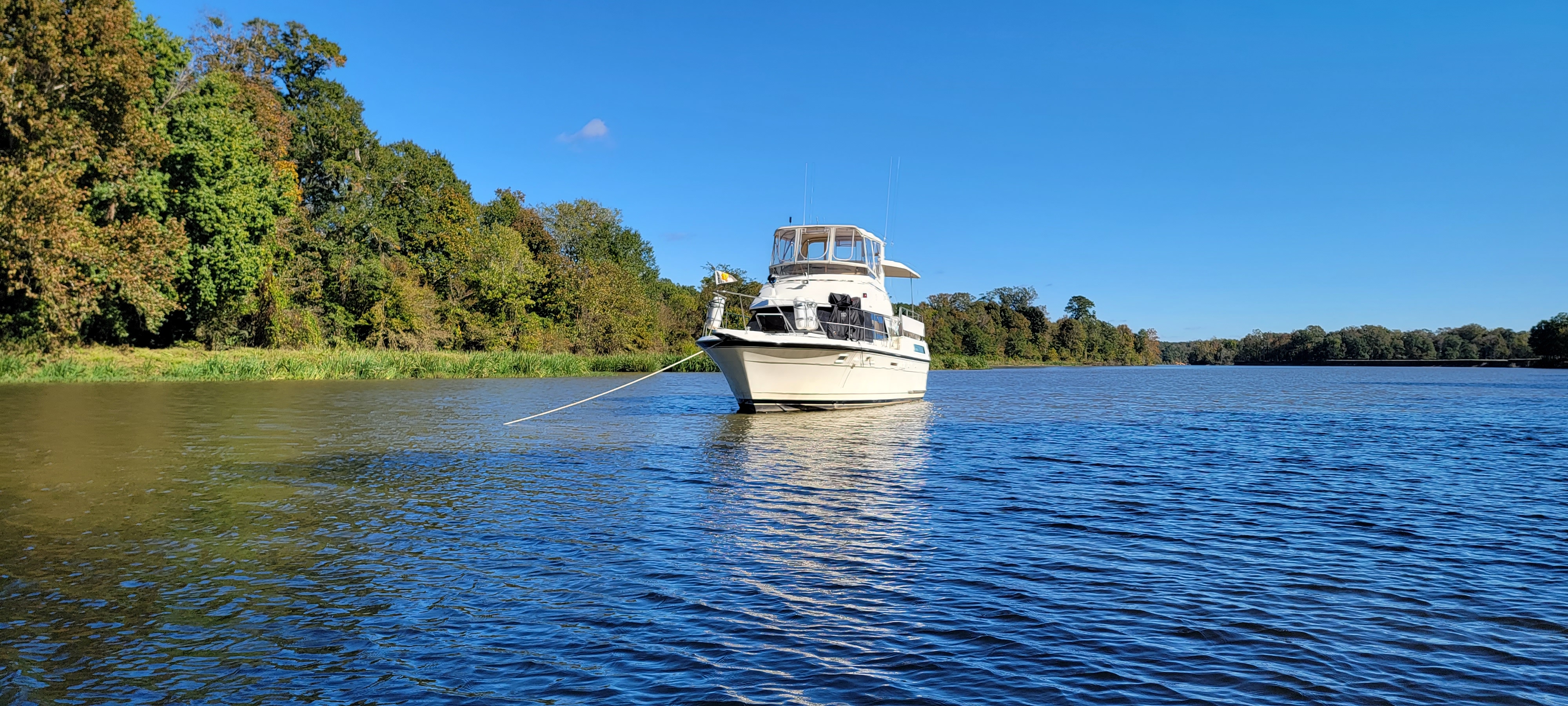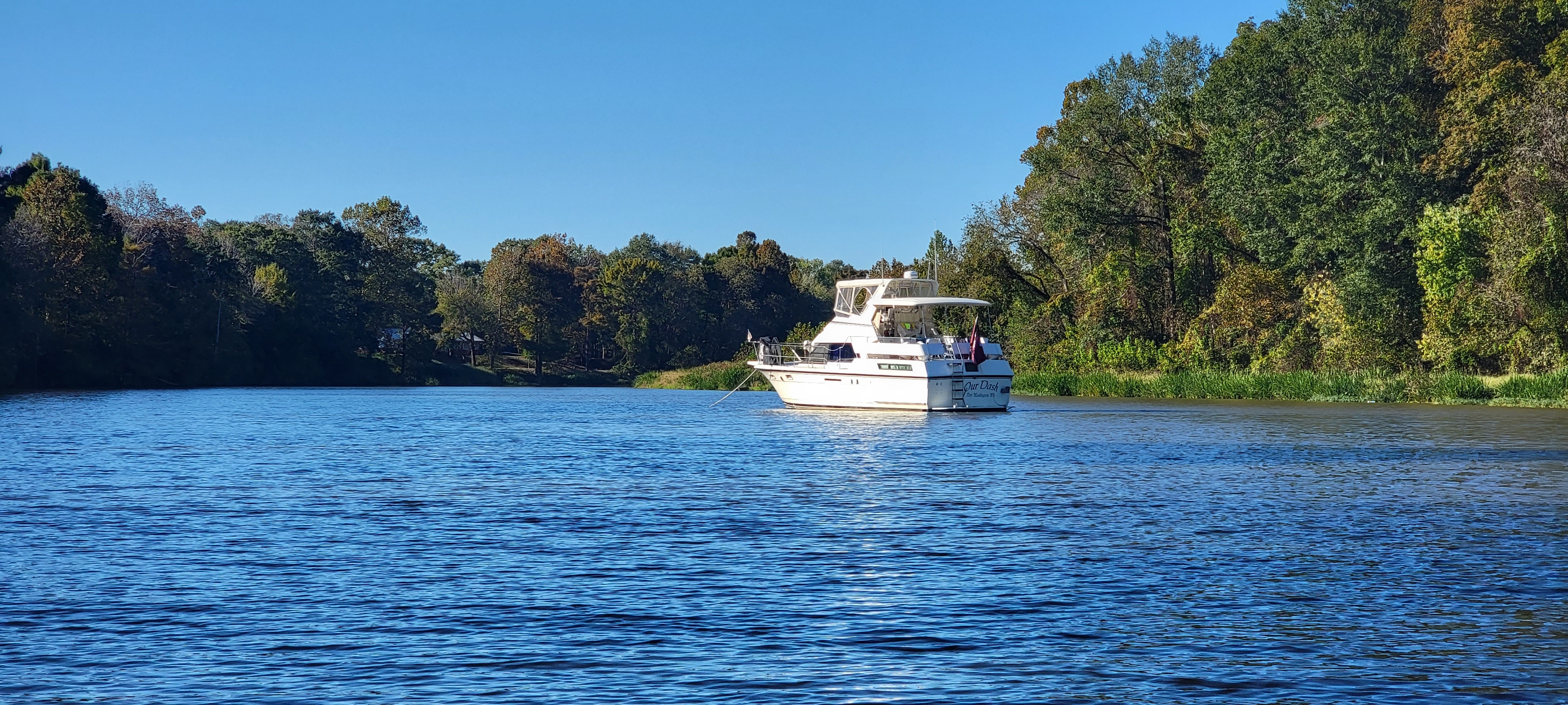 We decided that tonight we were going to try anchoring instead of staying at a marina. We peeled off from the group and pulled into the Windham Landing Cutoff. We knew from reading Skipper Bob’s Chicago to Mobile guide and from attending the Tenn-Tom route session at the Rendezvous that this was a great place to stop. We pulled in, picked our spot, did our investigatory figure eight, calculated the rode we needed, and dropped our anchor.