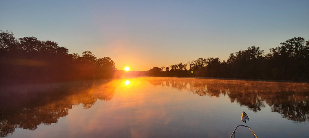 We awoke to the blaring alarm – thankfully not the anchor alarm – in the pre-dawn. I made some coffee and stepped onto the back deck to see the first rays of the sun creeping to reclaim the sky from the waning crescent moon before. The air was crisp (about 45 degrees) with a light breeze. The quiet occasionally punctured by the pop of a twig or splash of a fish as the wildlife stole the last moments of protective darkness. It was beautiful.