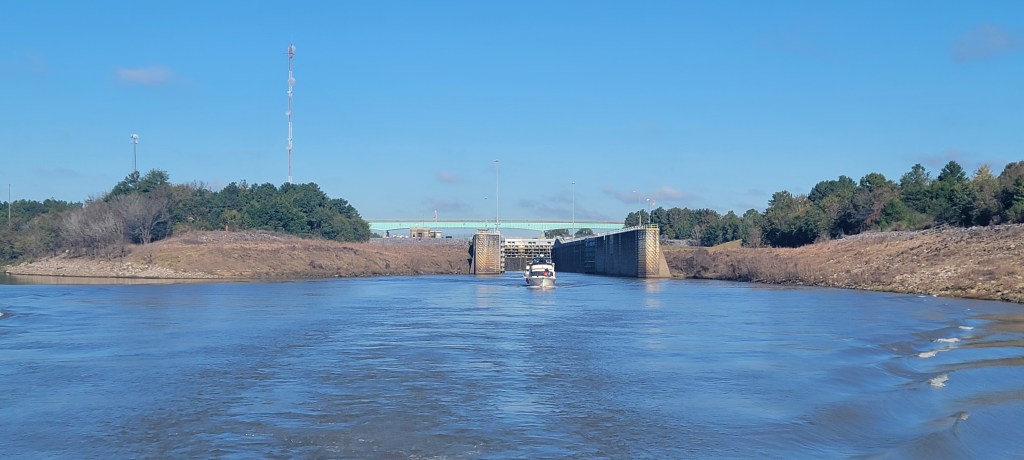 When we arrived at Kingfisher Bay Marina in Demopolis, we fueled up and found our slip. There is a daily captain’s meeting / docktales at 1600 every day to prepare to go through the Demopolis Lock in the morning. We arranged to lock through with seven other Loopers at first light.