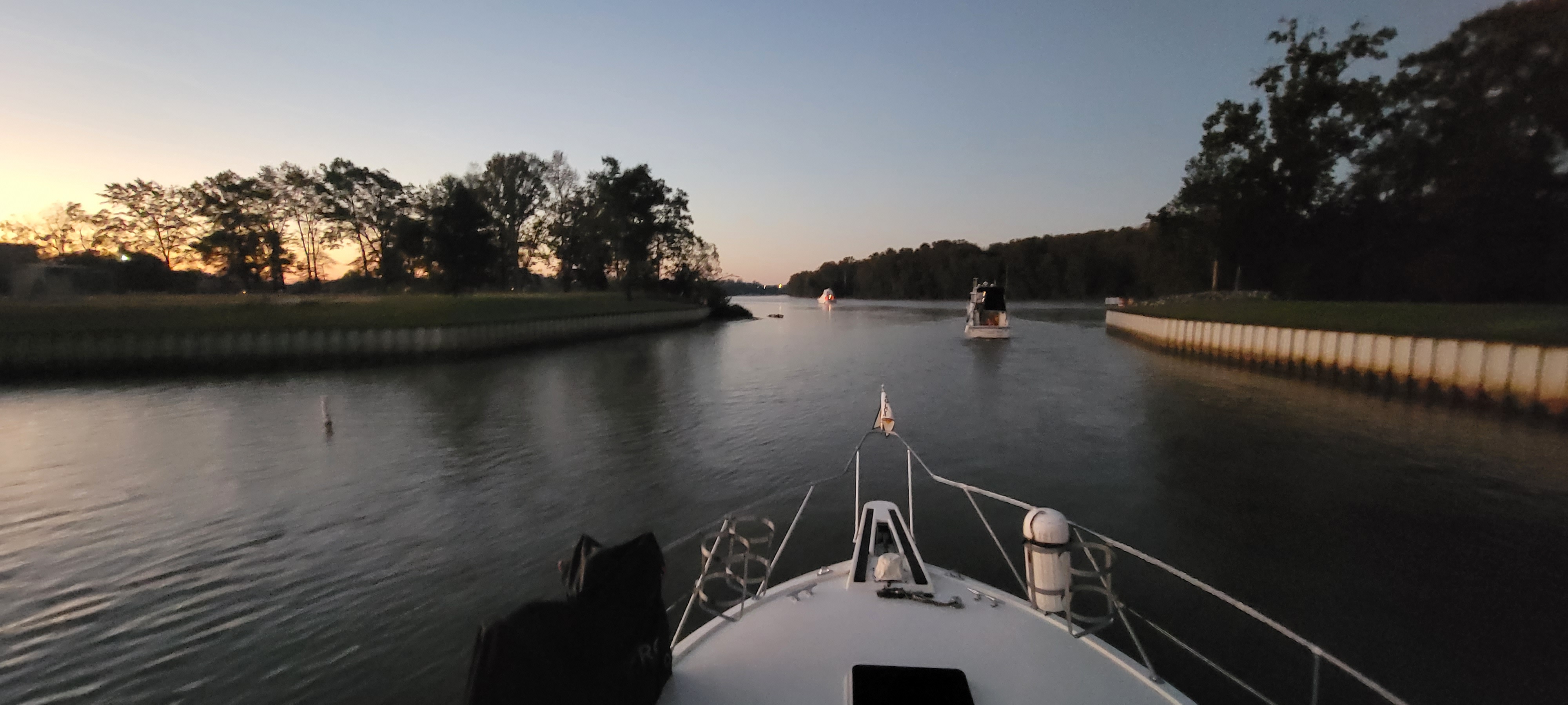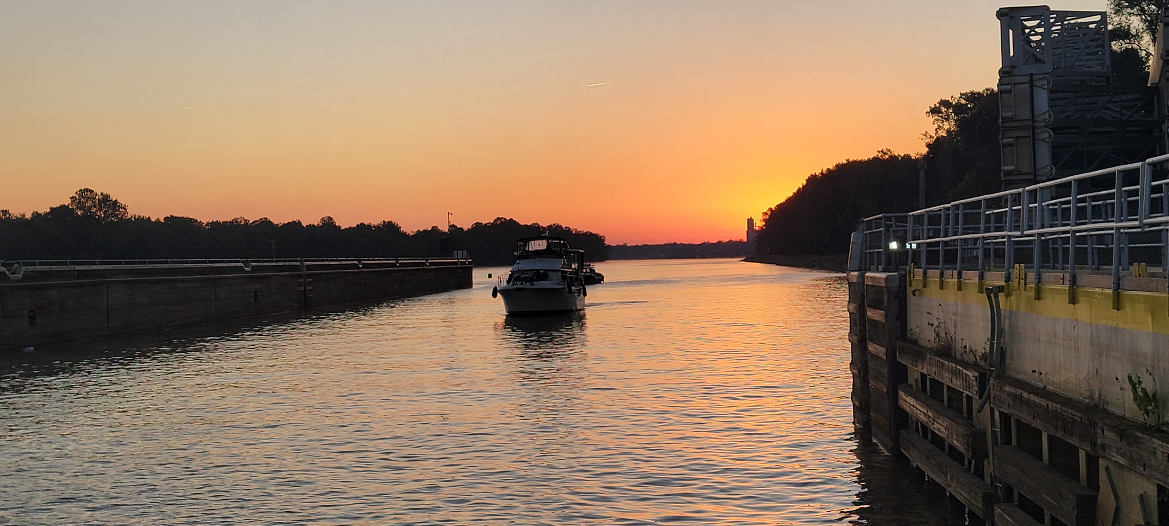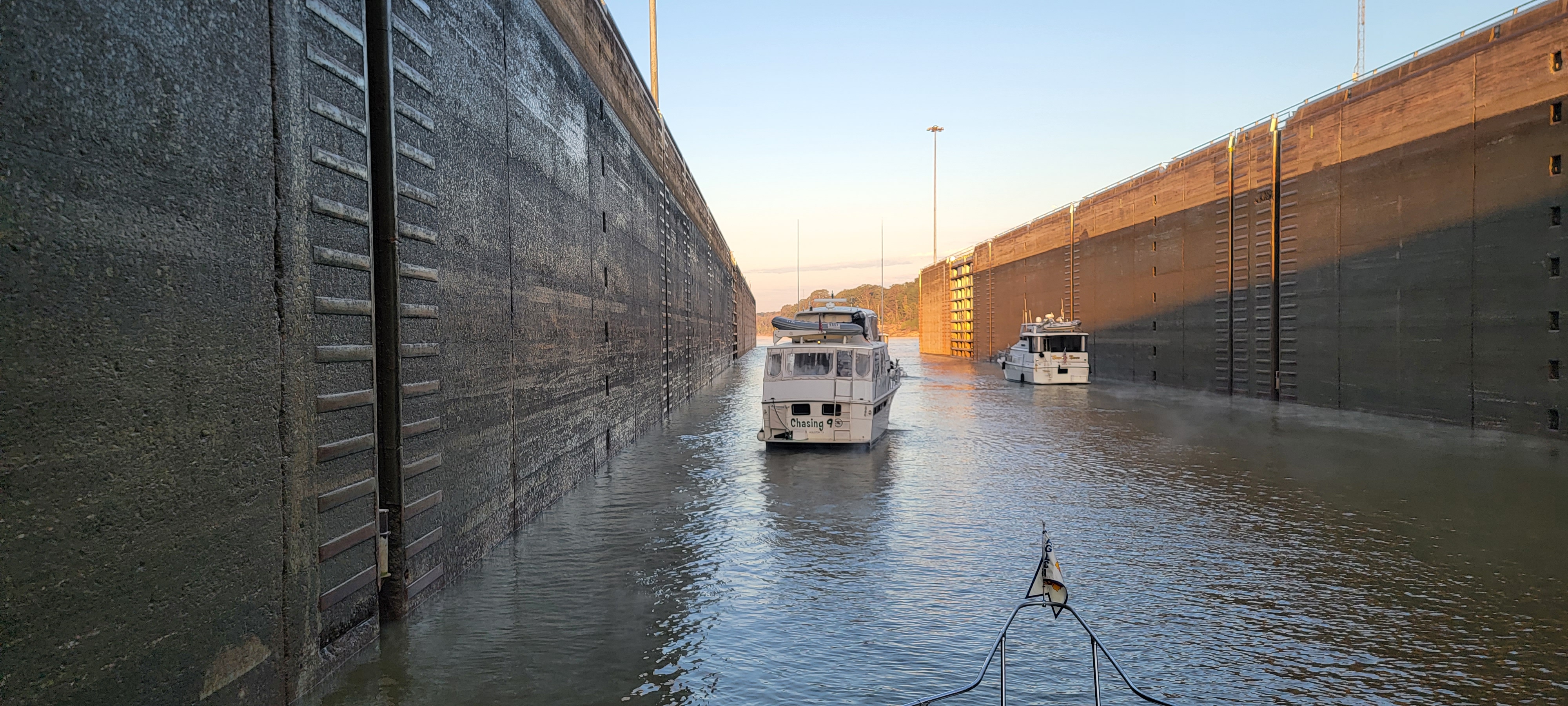 Exiting the marina was busy, but fun. 14 boats found our way out of the entrance and headed the three miles to the lock. When we arrived, the lock was ready for us. There was a bit of confusion at the lock, so we ended up in that pin on the port side. That gave us a good vantage for pictures.