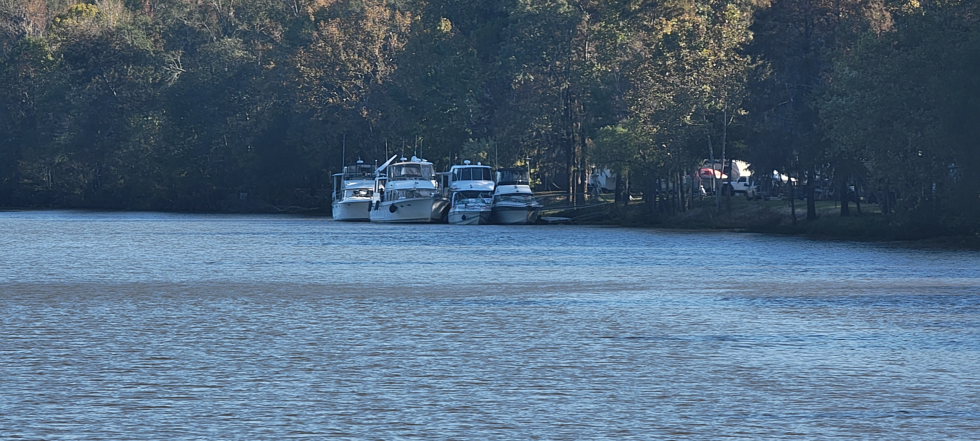 Bobby’s Fish Camp is just that… a camp for fishing. It has a single dock that fits two, maybe three, boats. But then boats can raft up together as deep as they want. When we rounded the bend to see it, there were three boats on the dock rafted three deep. We got in close to chat and we could have rafted to make us the fourth deep, but decided to anchor instead.