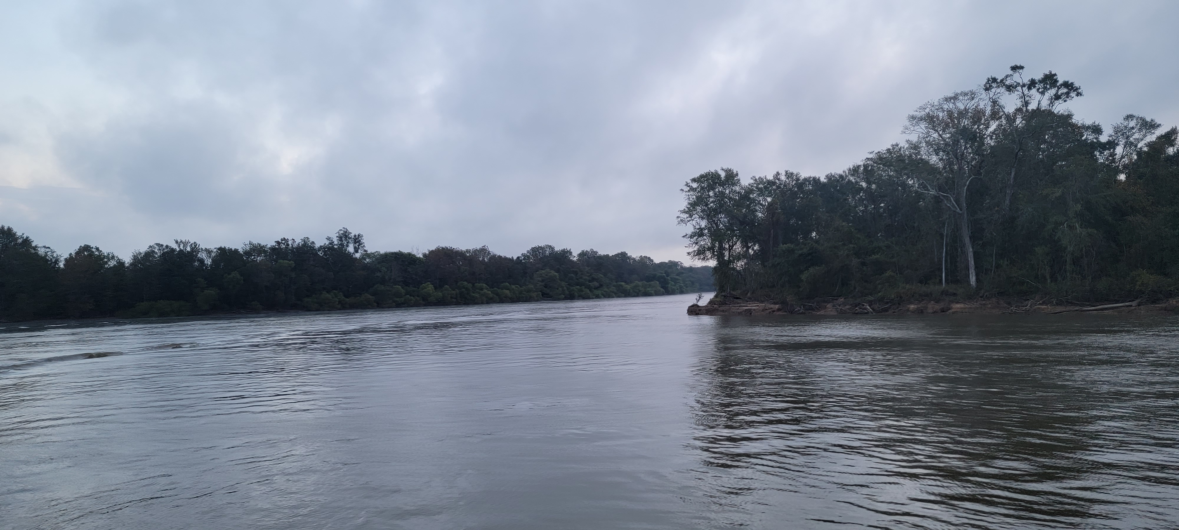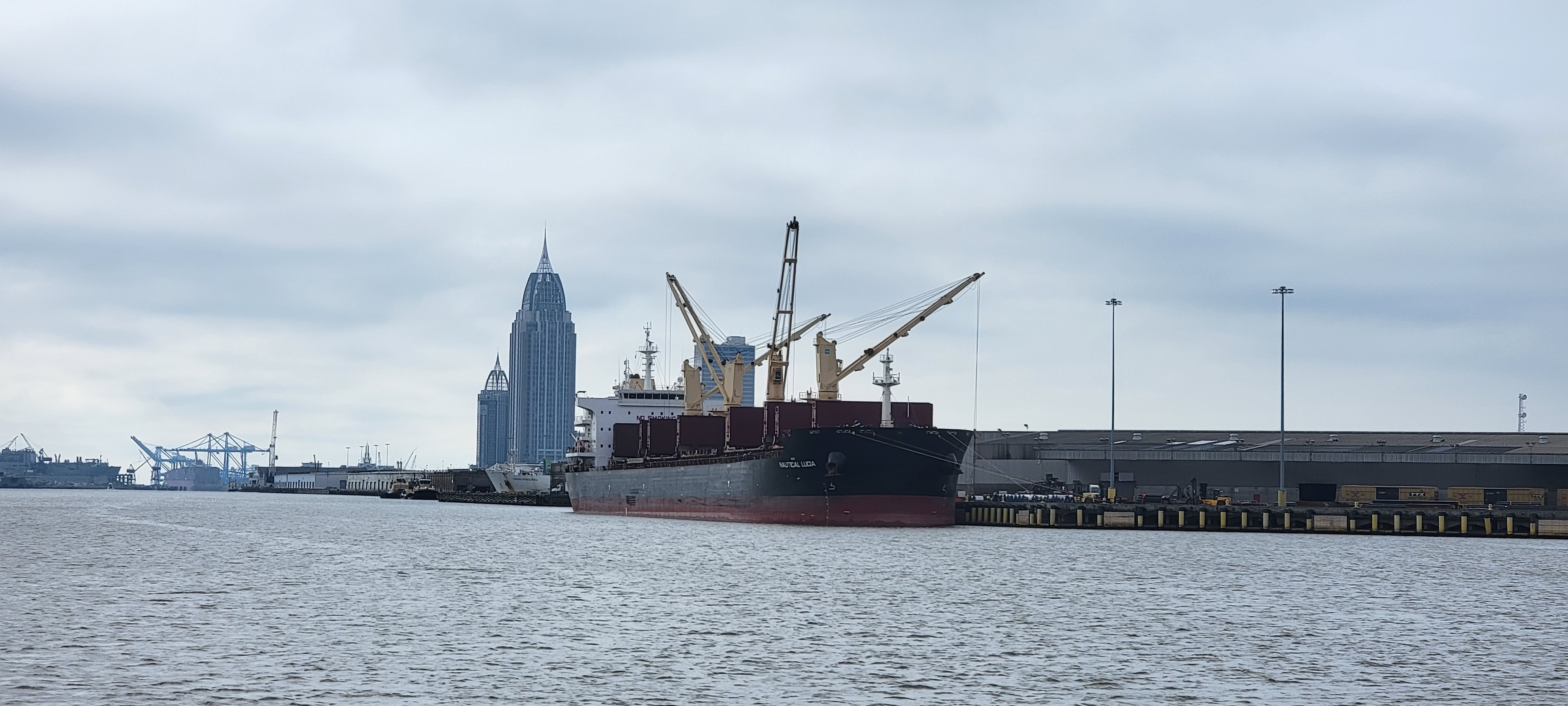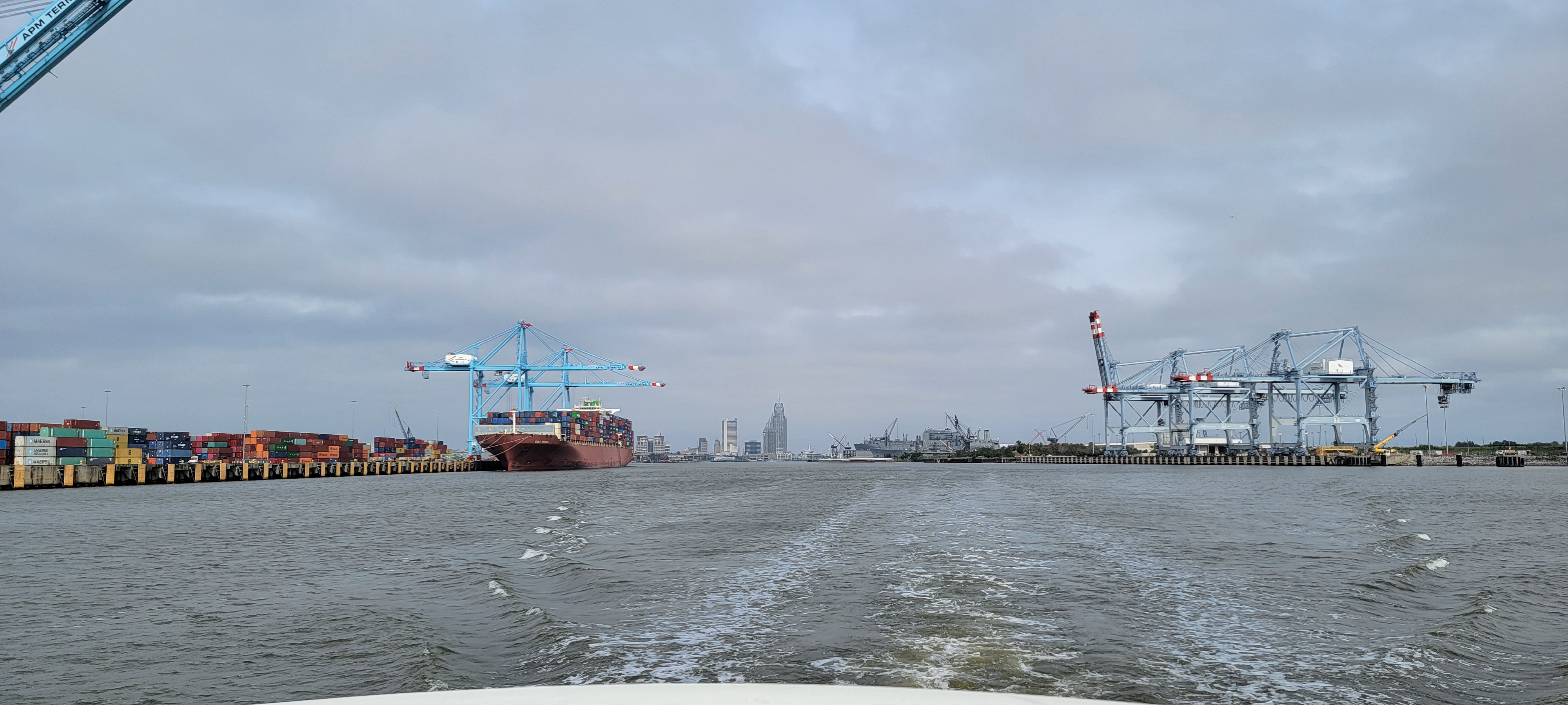 The drive down the Mobile River was a study in changing climate and fauna. We began to smell the air getting saltier. The shoreline slowly filled with ground palms and flattened out. The commercial traffic became heavier as we approached our nation’s twelfth largest port (by tonnage).