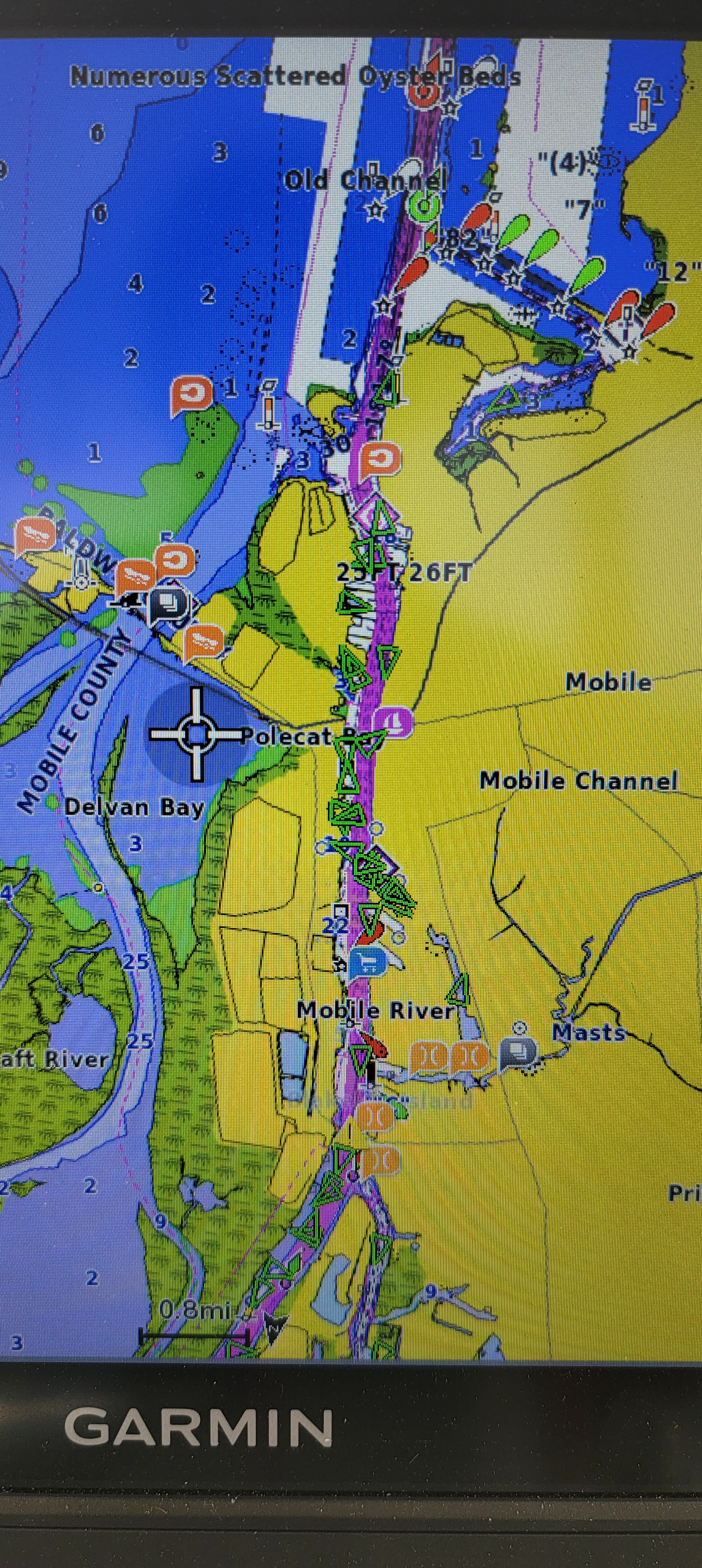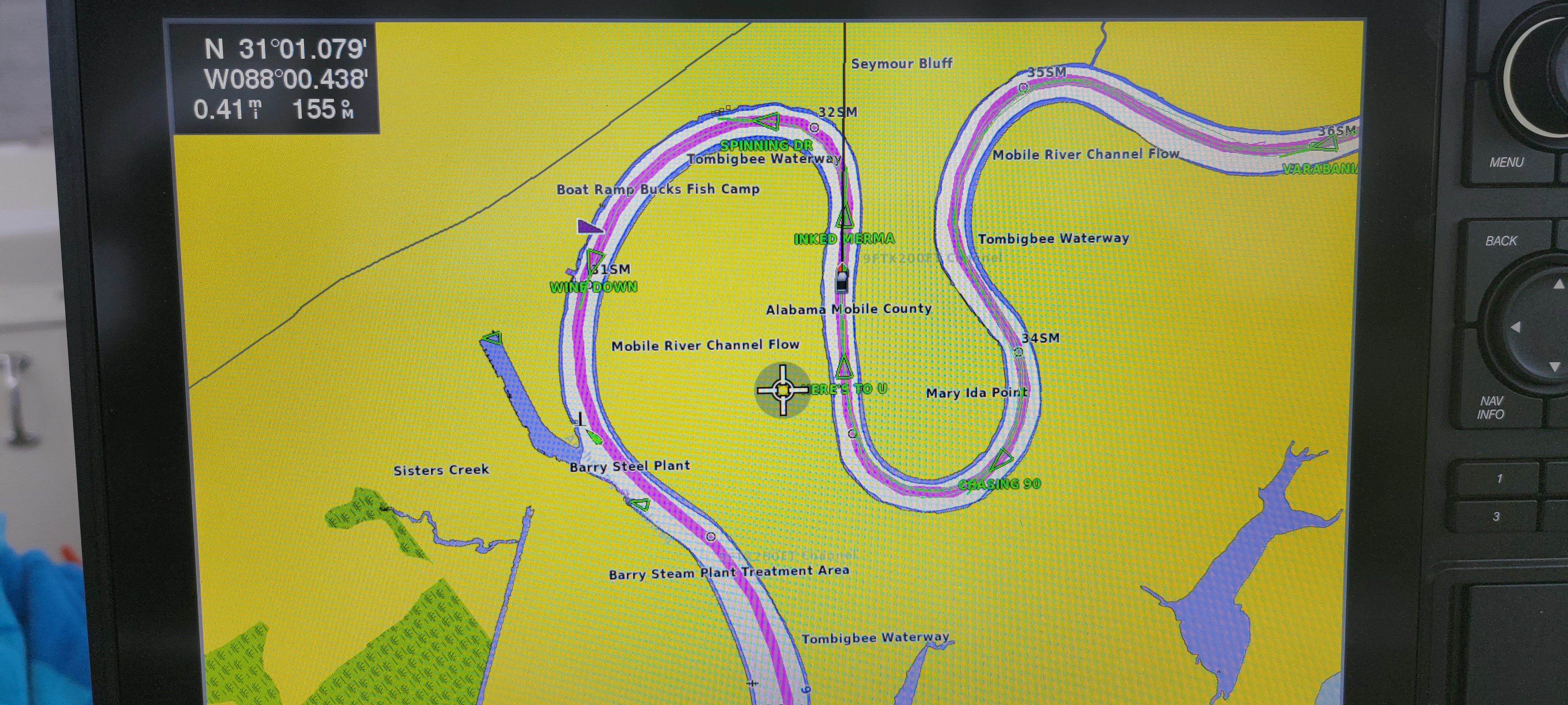 Here’s the thing about Mobile Bay… it’s shallow… shallower than you think. We were near low tide with a north wind pushing the water out of the bay, so it was really shallow. And it doesn’t take much wind to whip up waves quickly. When we turned the 120 degrees into the channel, those waves were now on our beam and we were rolling. The Dog River channel is only about 100 feet wide. In a blowing sea in a 40 foot boat, it seemed like it was 10 feet wide. Meanwhile, even when we were in the channel, we were showing as little as 5.5 feet of depth.