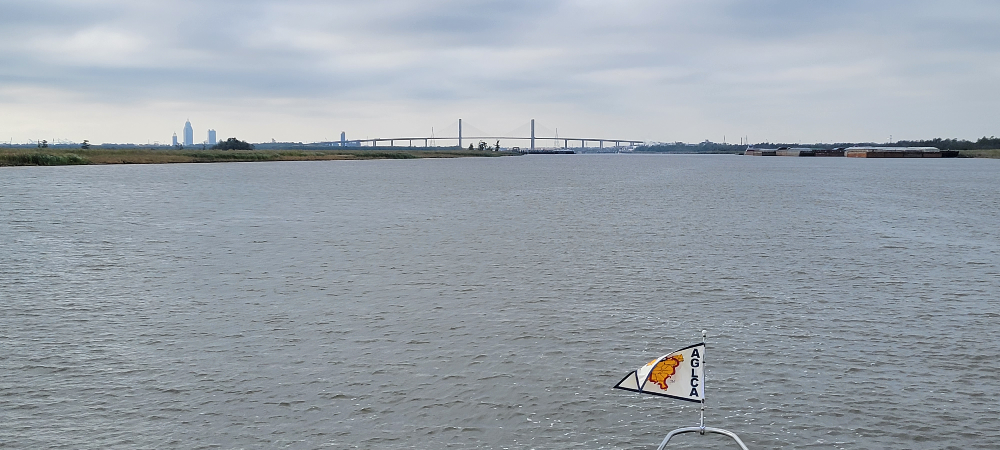 In a channel that seemed too narrow (it wasn’t), the huge 650 foot Star Hidra passed on the two whistle at 14 mph on its way into port. As we neared the channel to cut across the bay into Dog River, the north wind picked up a bit and we were feeling three foot swells on our stern.