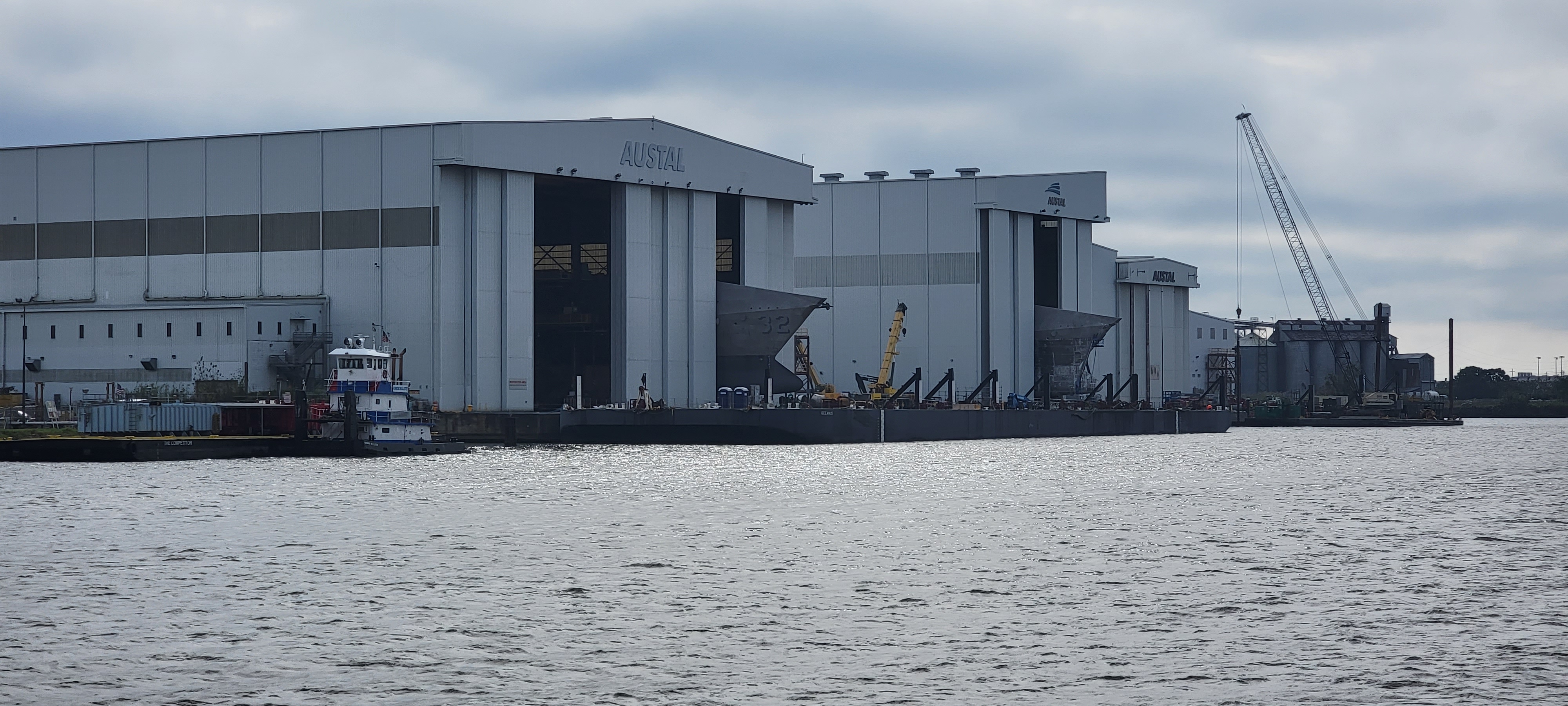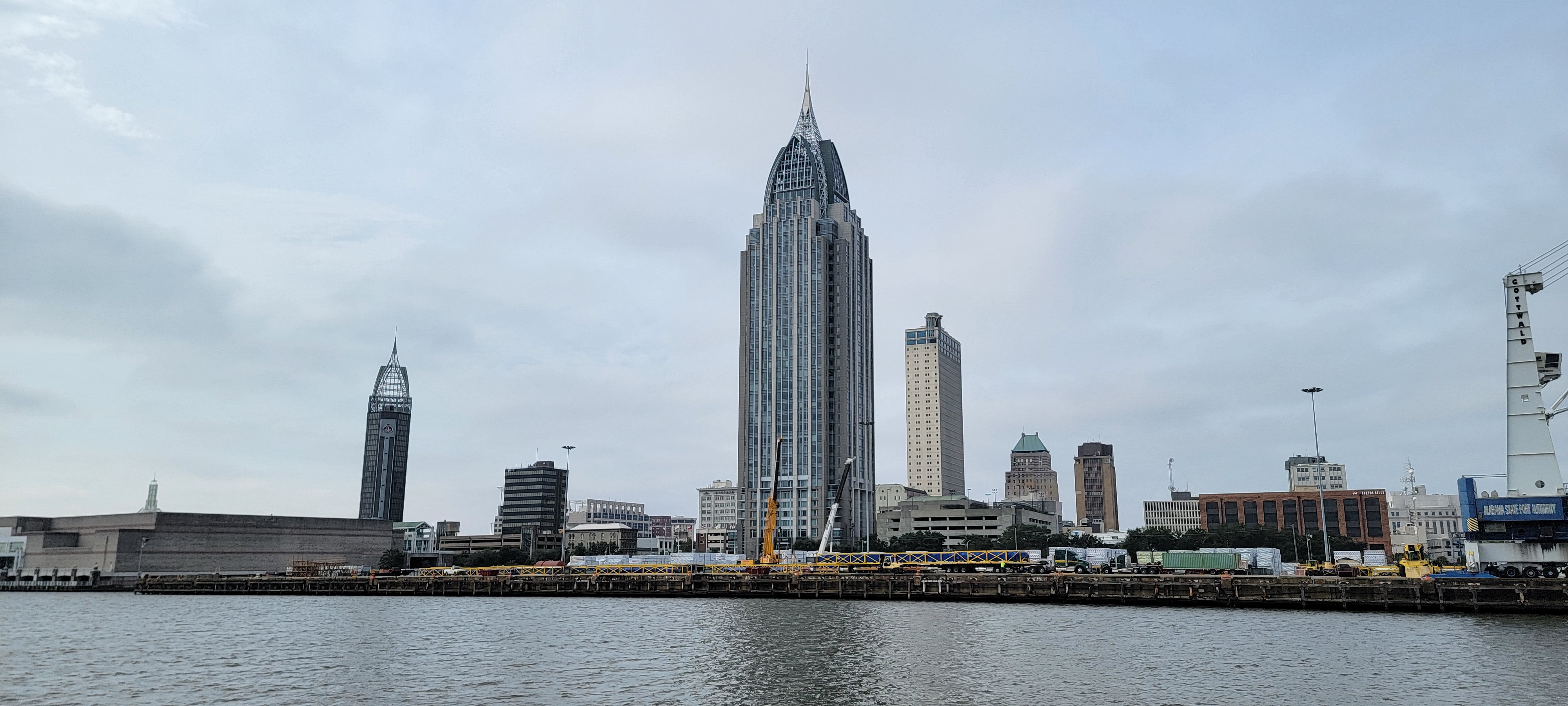 Going through downtown Mobile was a treat. The waterway was bustling with workers moving barges, loading cargo, building ships, repairing ships, and a million other tasks. The cruise terminal looked underused, but perhaps those days will return again soon.