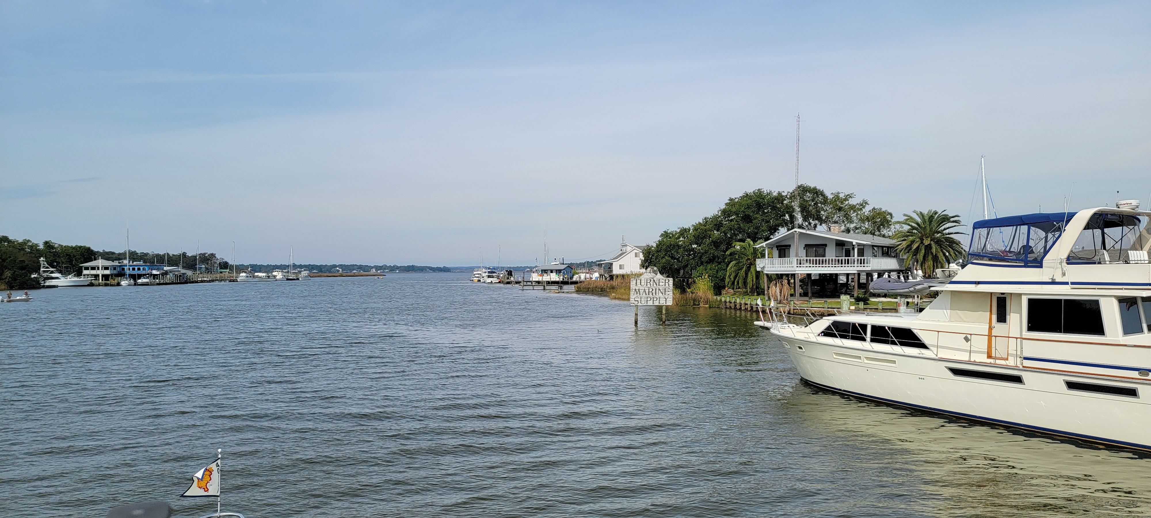 Thankfully, it really was one of those times when the boat was perfectly fine, but the crew was not. We tried some different speeds to see if it would help (it didn’t), but it was an unpleasant few minutes. As we approached the mouth of Dog River, it smoothed out and we prepared to enter Dog River Marina.