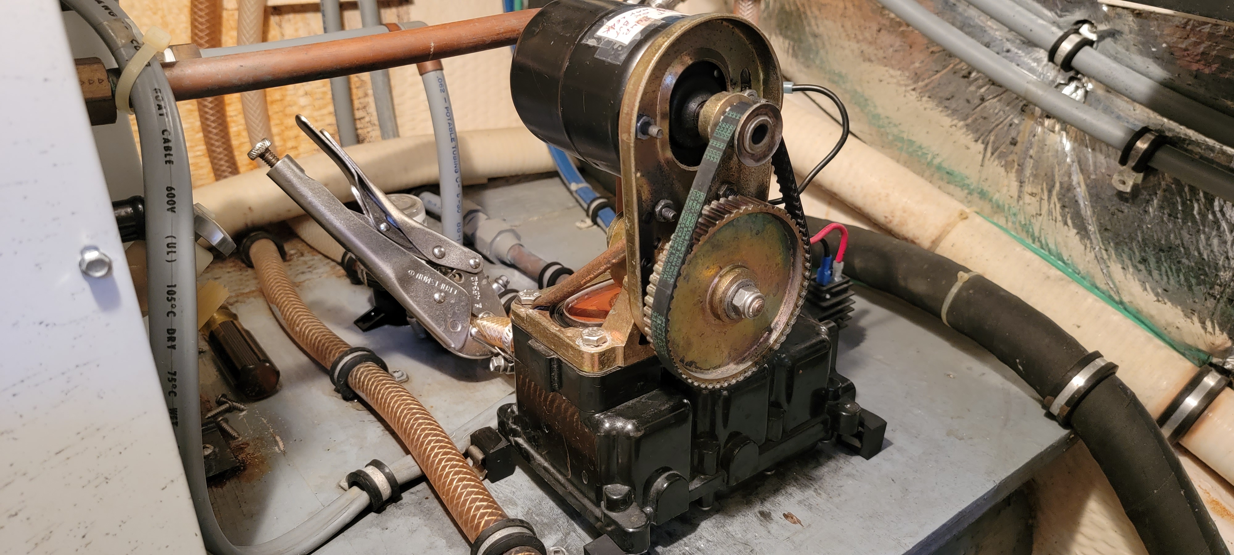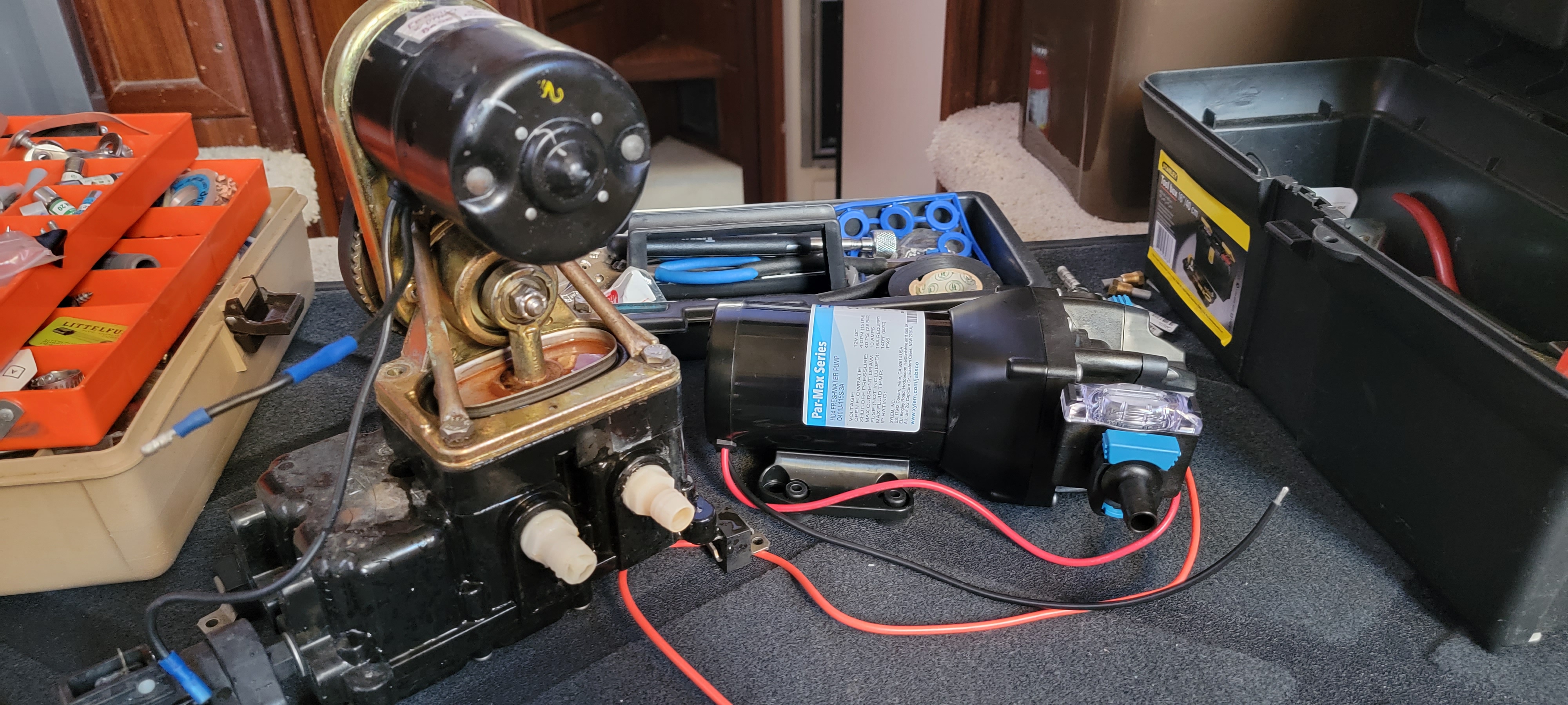 The old pump is a Jabsco 36900-1000. It’s an old model but still available if you want tho shell out $700 or so and wait two weeks. Yeesh.