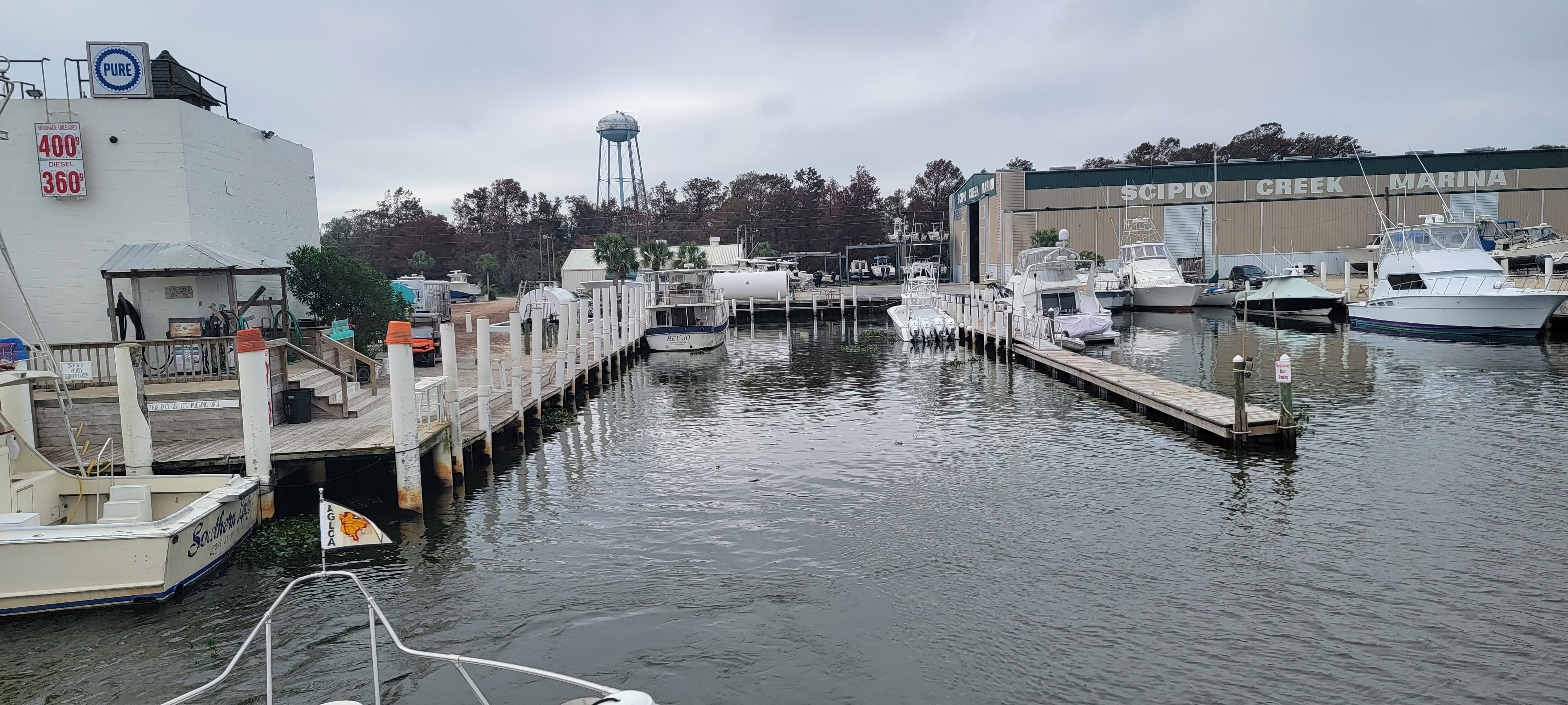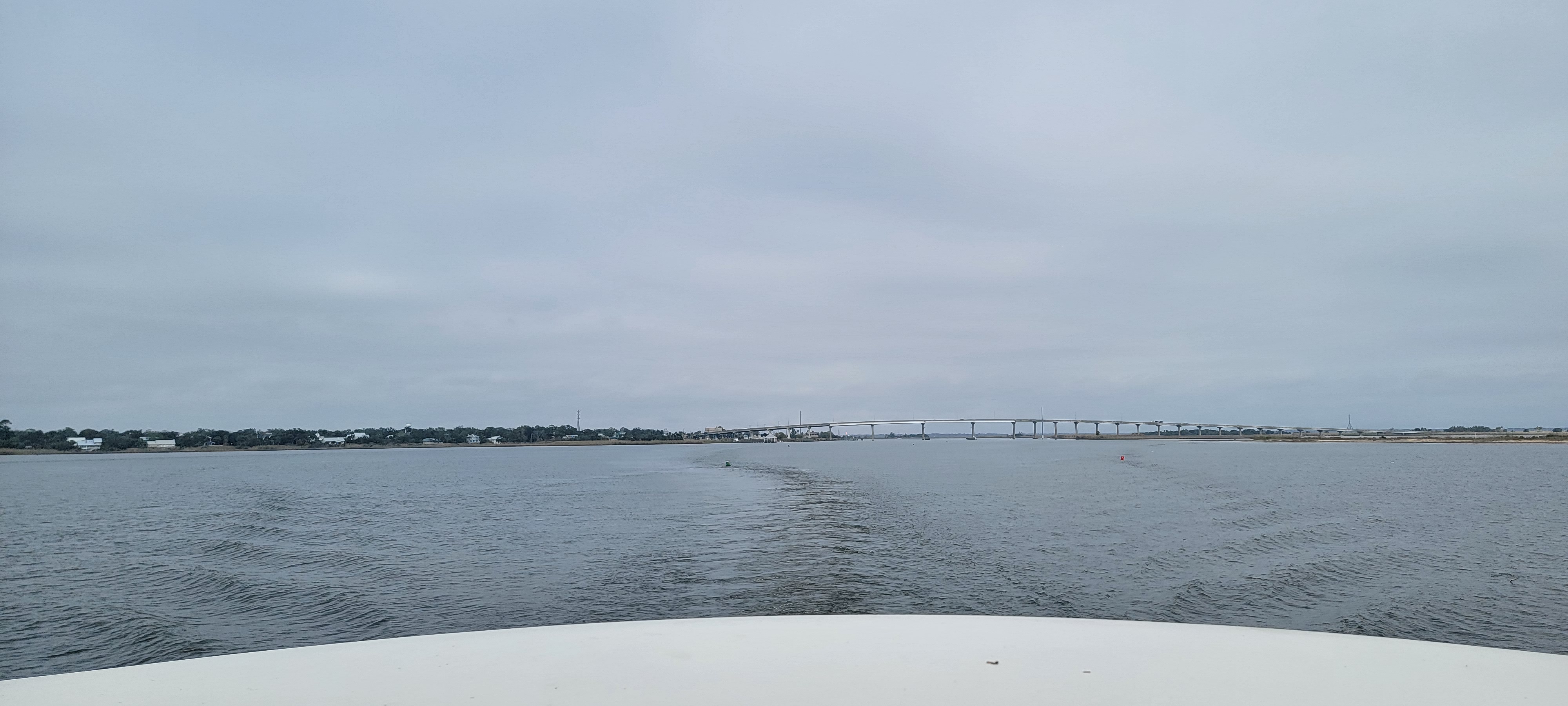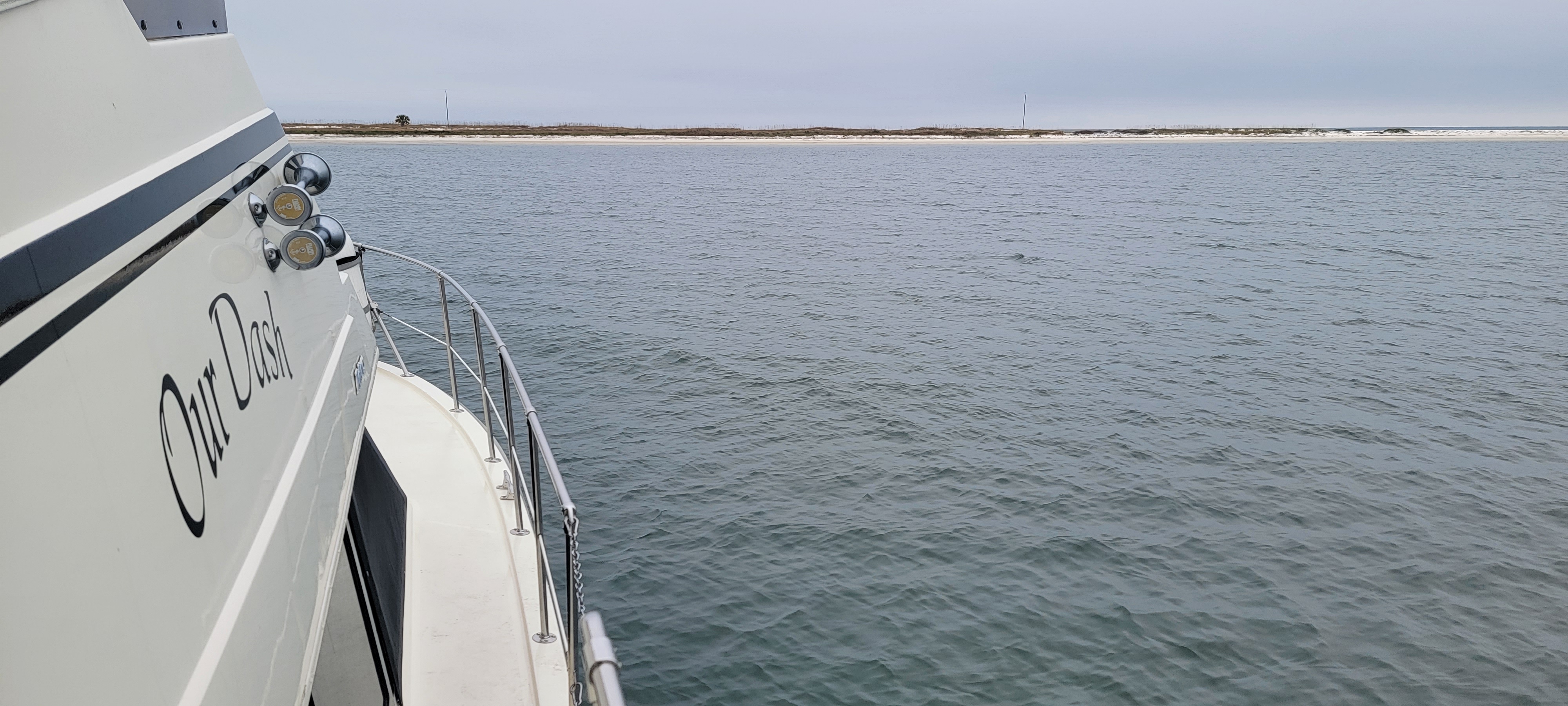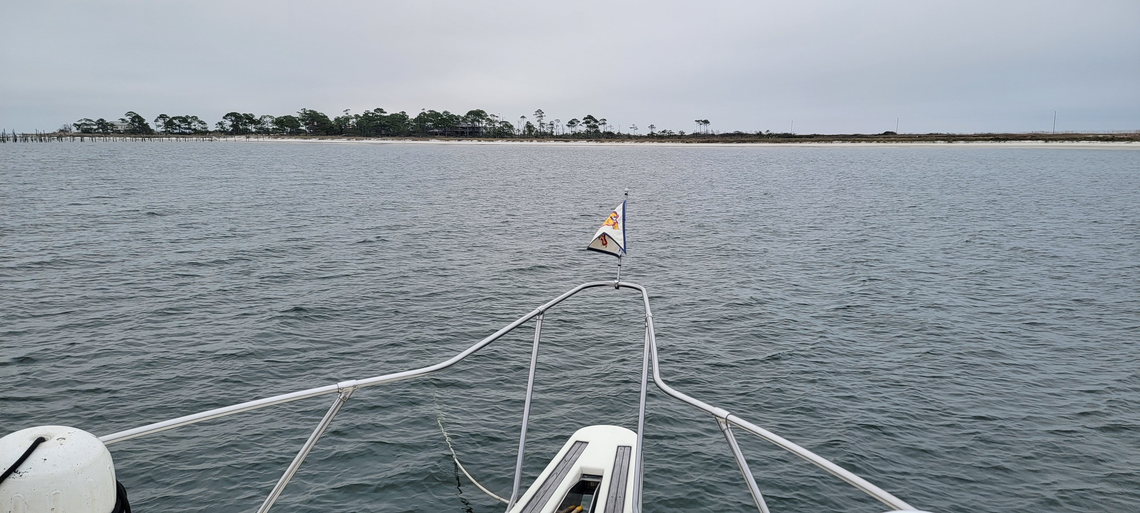 The problem was that we were still in a marina in Apalachicola – not Carrabelle. So… we did math. It is 206 miles from Apalachicola to Clearwater – just south of Tarpon Springs and has better anchorages for us. Our Dash easily has that range, but not at speed. At 9 or 10 mph, it has a range of about 400 miles. At 20 mph, it has a range of about 130 miles. Going slow gives us range, but also makes the timing a challenge.