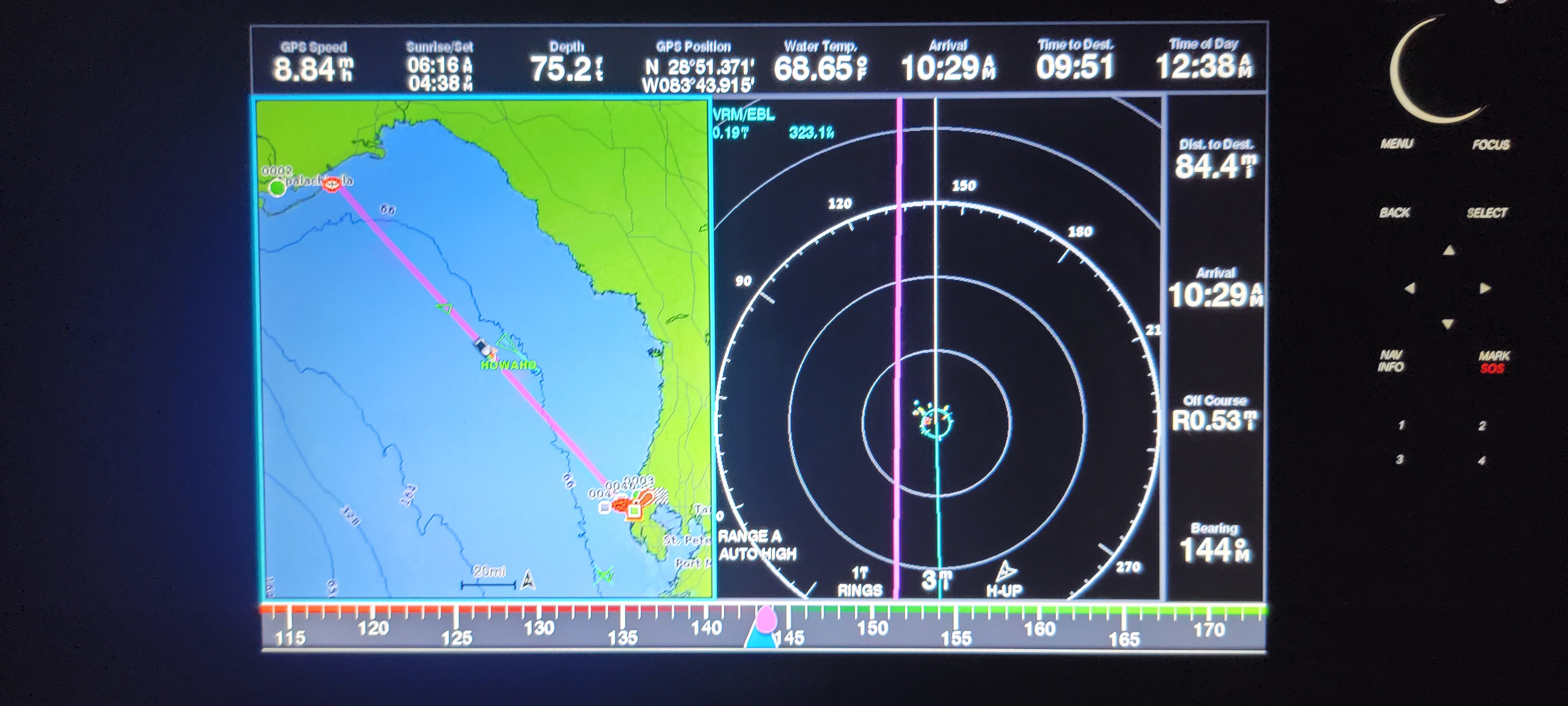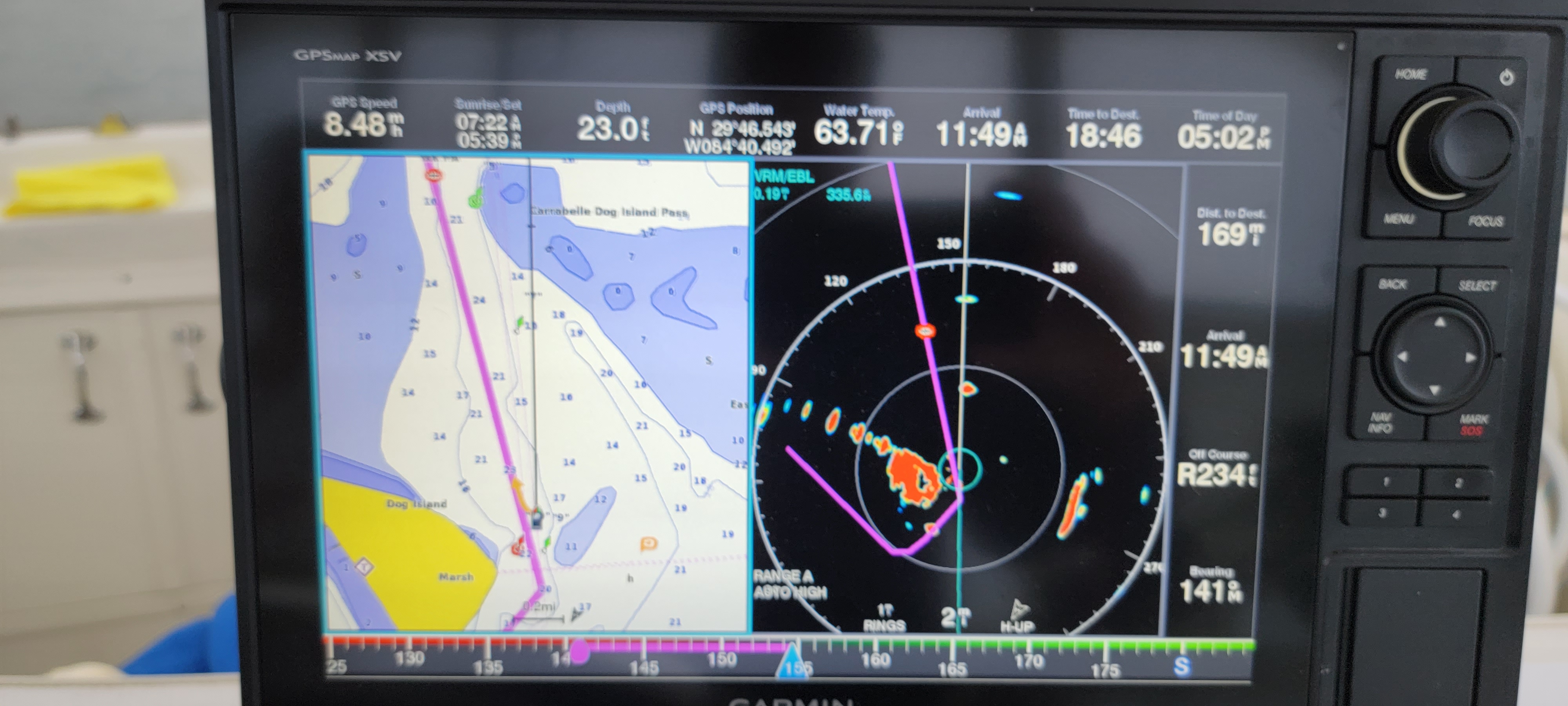 We took turns taking short naps and manning the helm. We watched a couple of movies, listened to music, ate, and generally passed the time while keeping a sharp eye on the radar and the infamous magenta line (the line that marks our route).