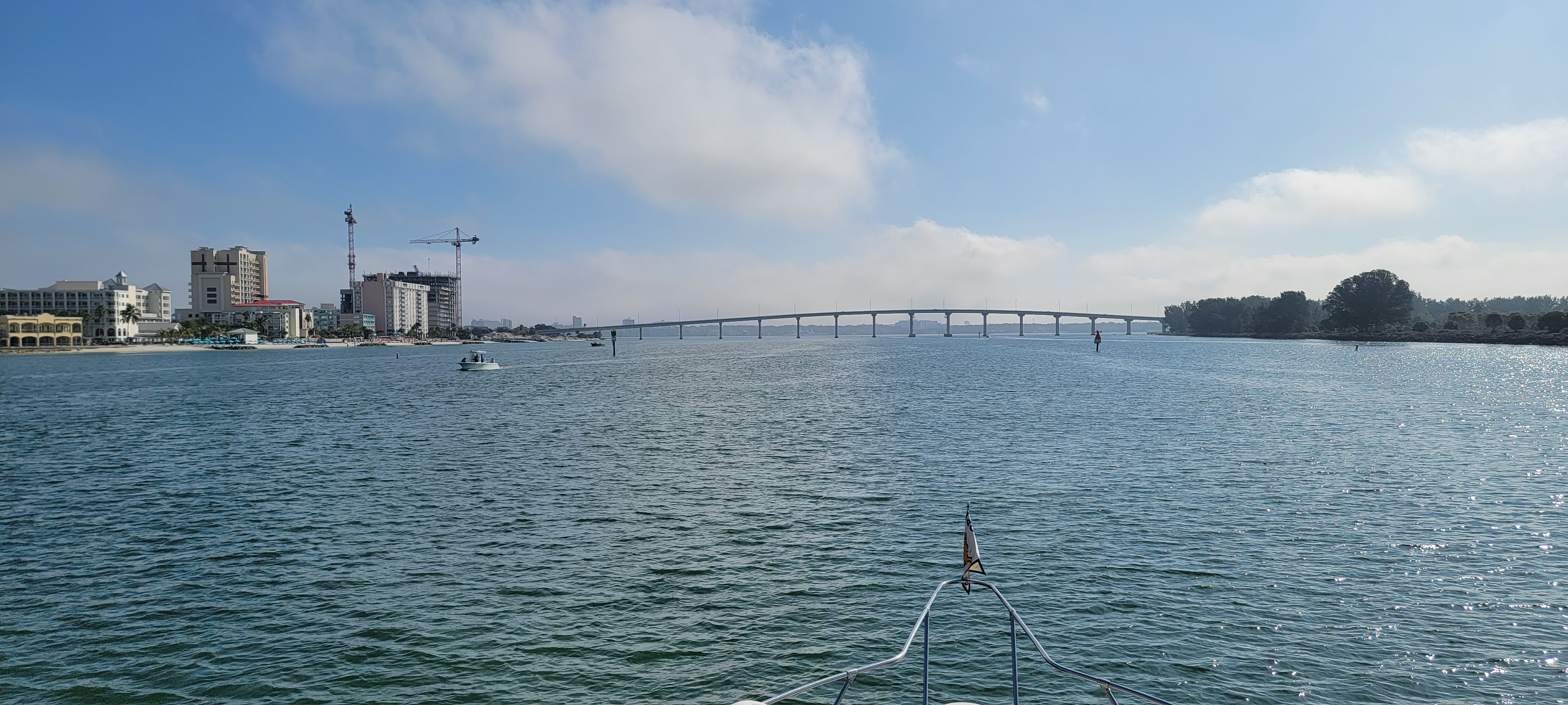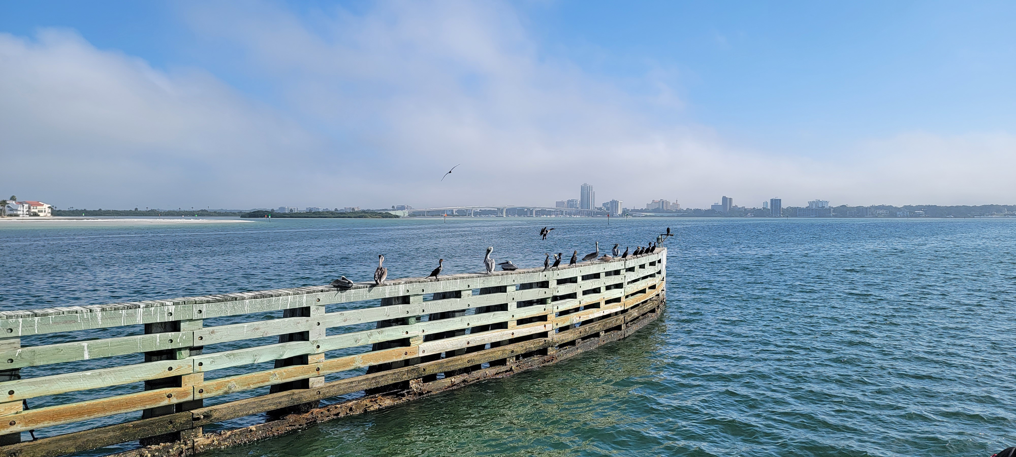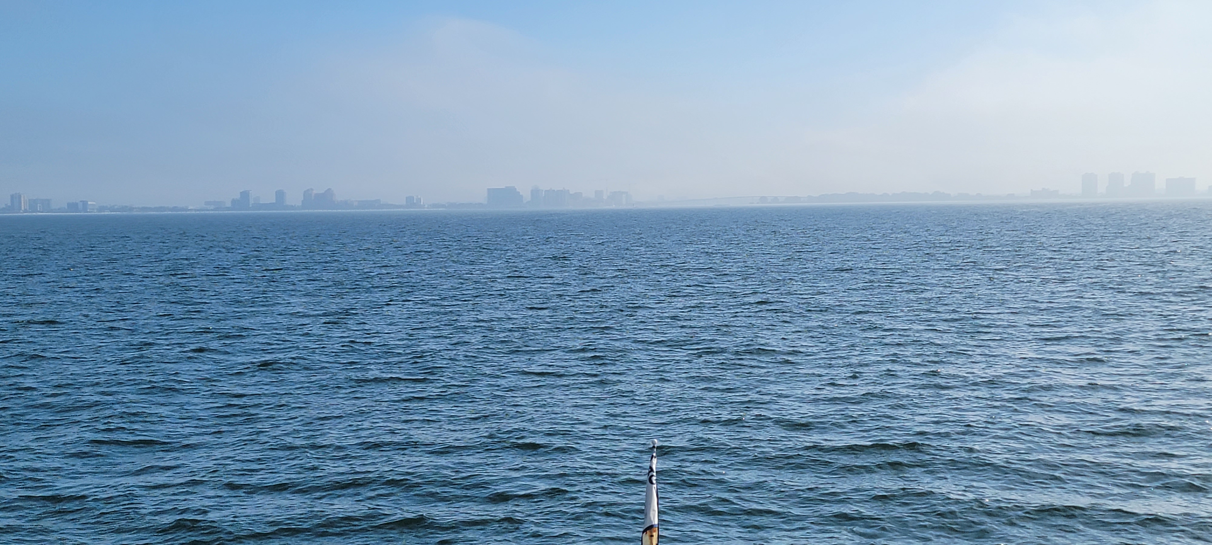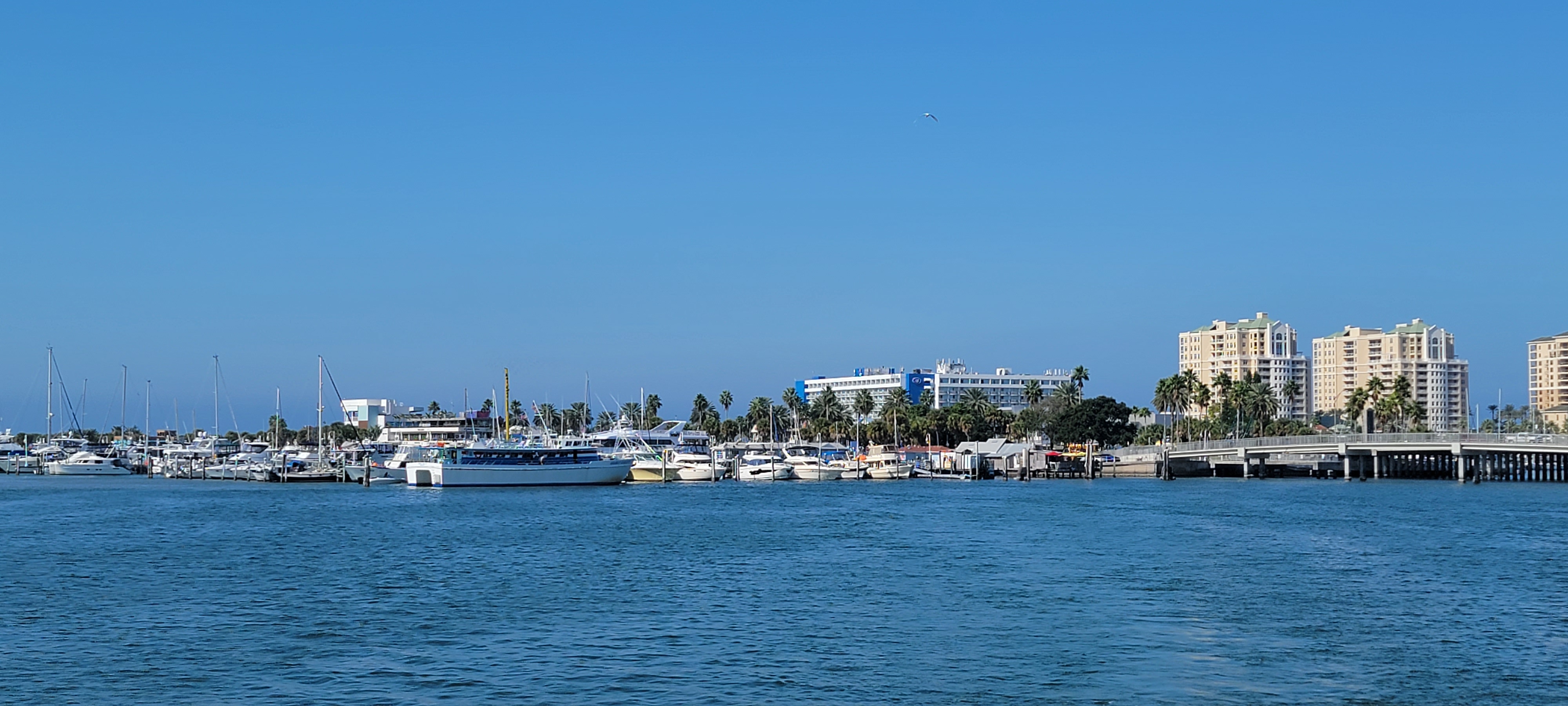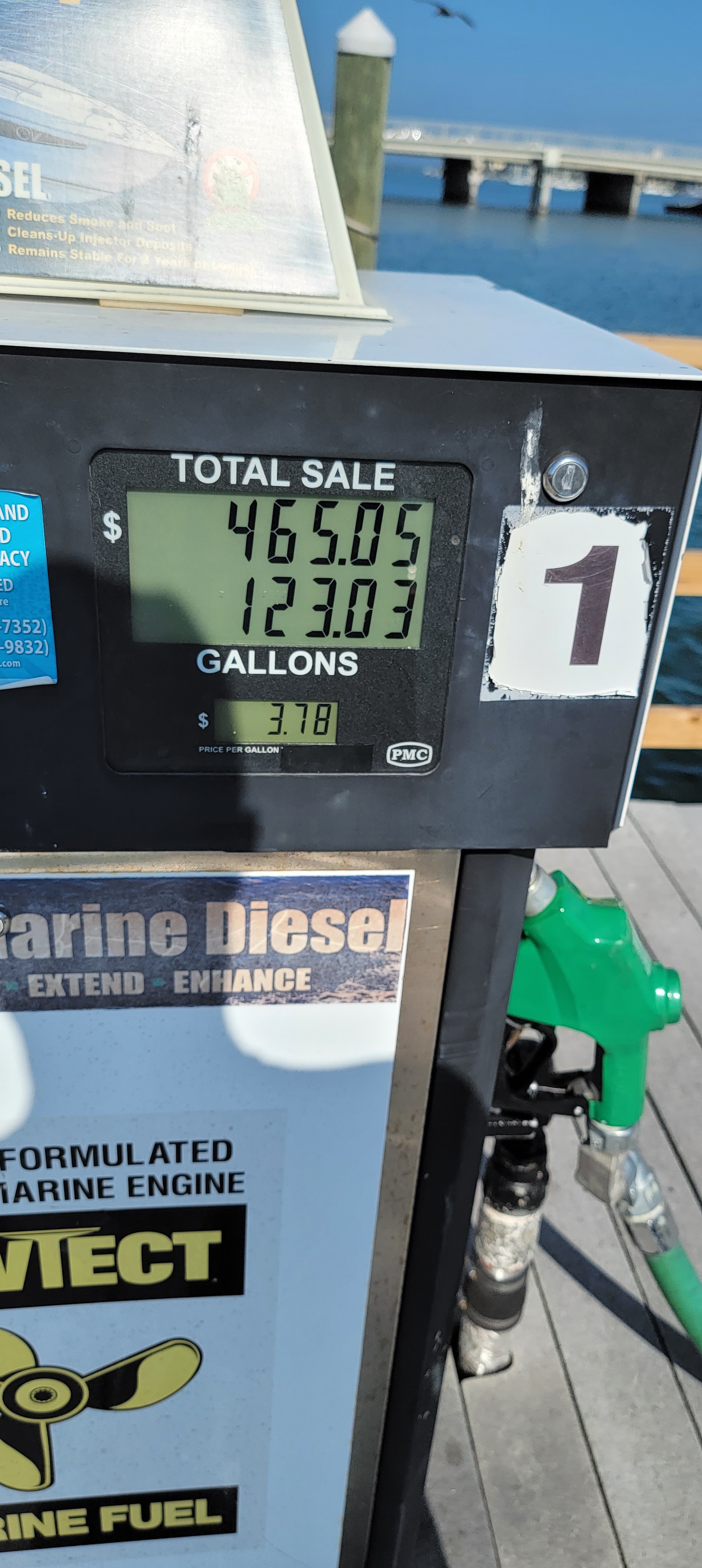 As we neared shore, the fog cleared and we were able to enjoy watching the buildings rise out of the water. We went through the inlet and around the corner to Clearwater Municipal Marina for fuel. After waiting a bit for the dock to clear, we filled up with 123 gallons of fuel! For 206 miles! Going slow sure makes a difference in the mileage!