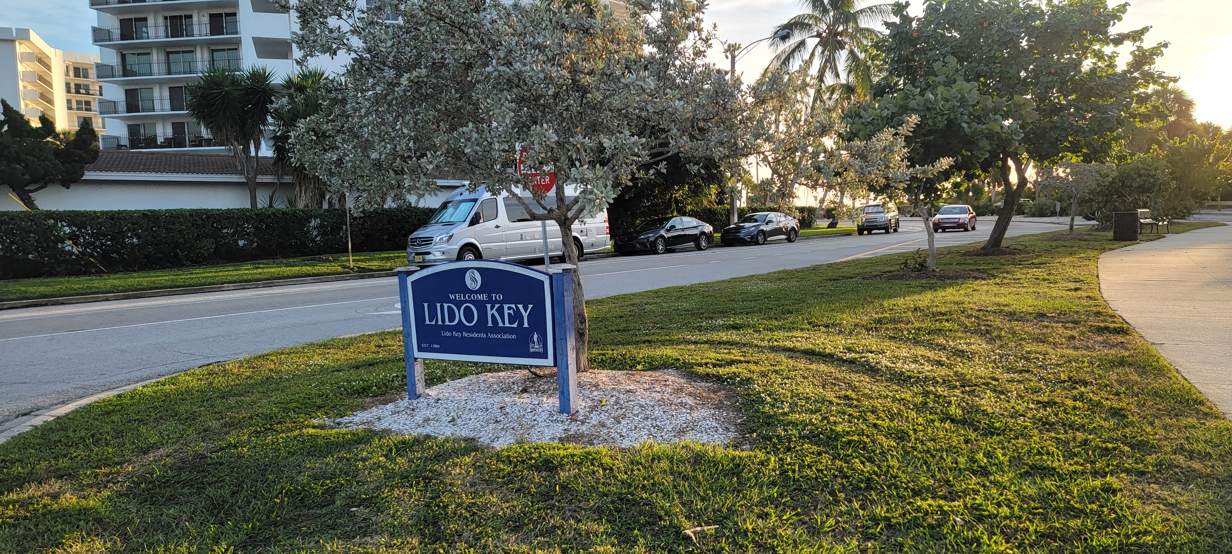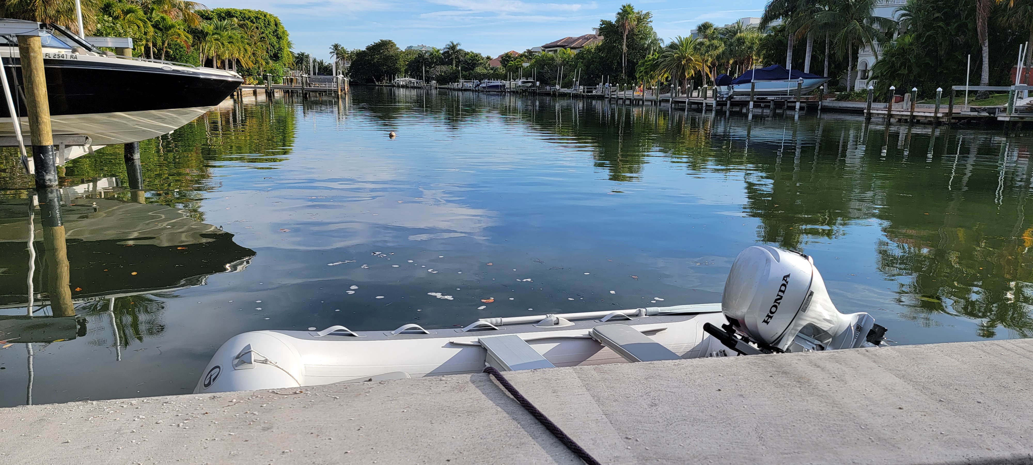 Once we were certain it anchor was set, the dinghy came down and we headed to the beach. There’s a small canal the cuts through Lido Key so that it’s just a very short ride at no wake to get there. Owen tied the dinghy to the line palm trees along the wall at the end of the canal. From there it was a very short walk to the beautiful beach.