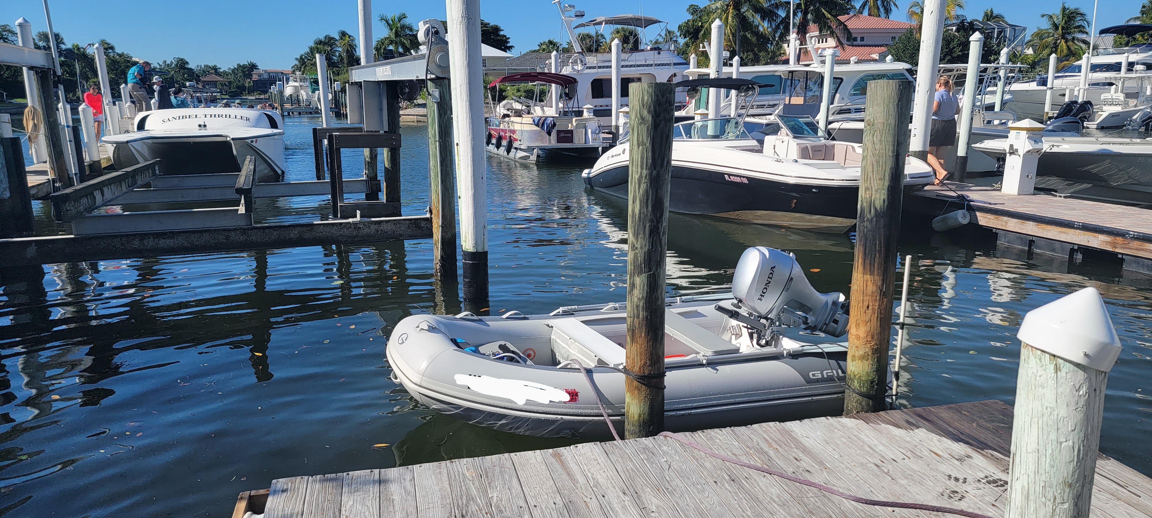 So we took the dinghy about 4.5 miles to Sanibel Marina, where the friendly person said we could pull up to their dock for lunch.