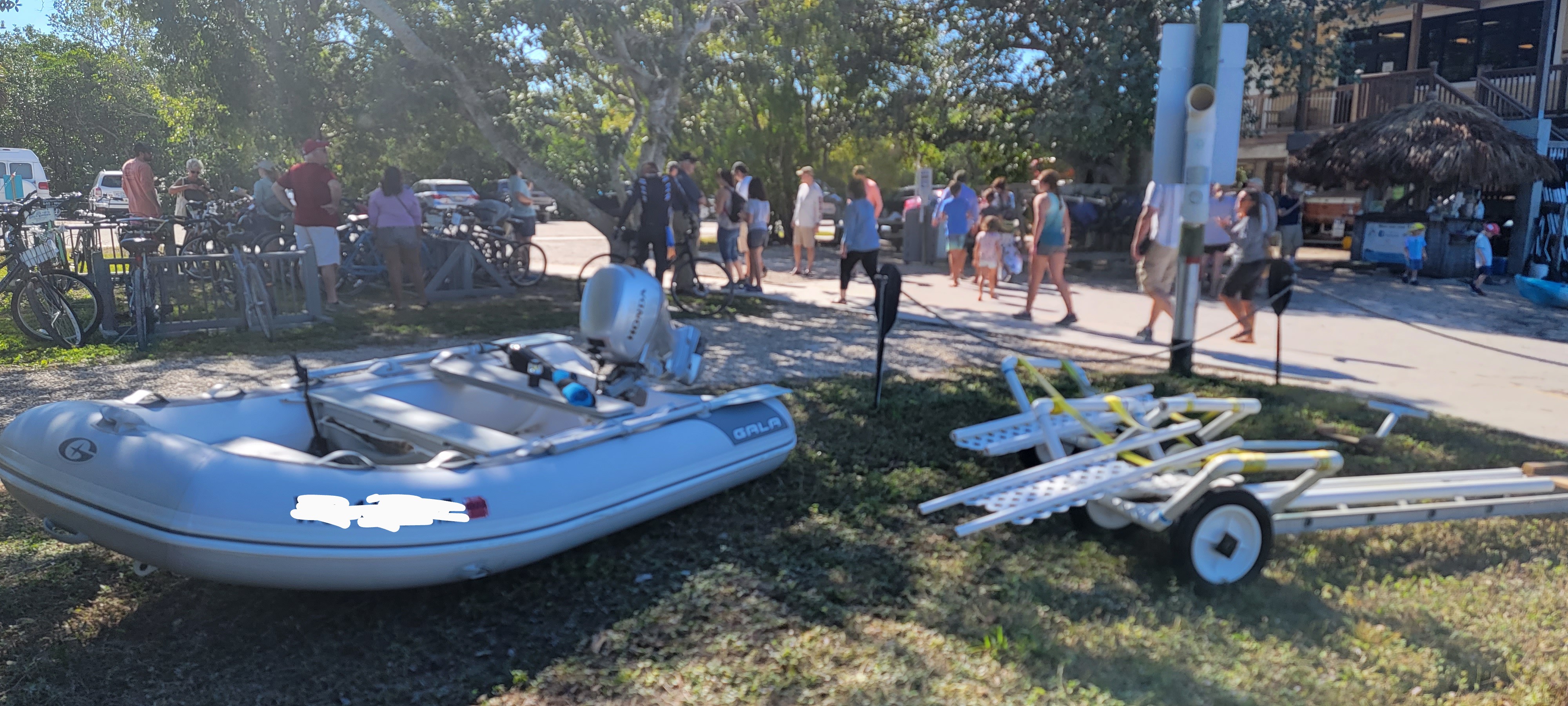 This morning, I called Tarpon Bay Explorers and asked if we could bring our 10 foot dinghy to their dock so we could rent bikes from them. The answer this time was yes, BUT we had to be able to completely remove our boat from the water and put it on the grass. We could not dock or beach.