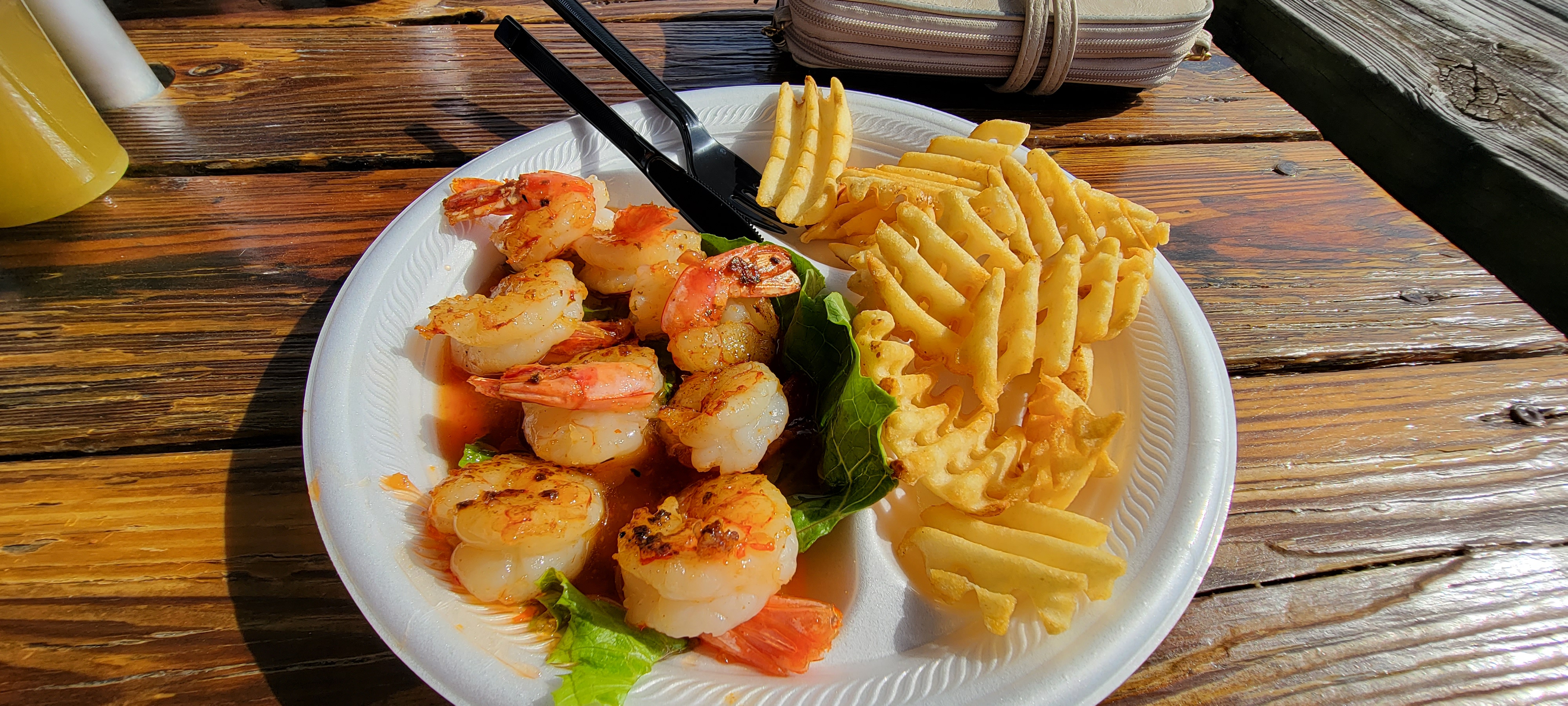 We ate at other places in Fort Myers Beach, too. Nearby, we at at Bonita Shrimp Cafe, where the mimosas contained a LOT of “mim” and a splash of “osas,” if “mim” is champagne. The grilled shrimp was fantastic and better than the fried, in our opinion. We had a bird who joined us for lunch and had no fear whatsoever.