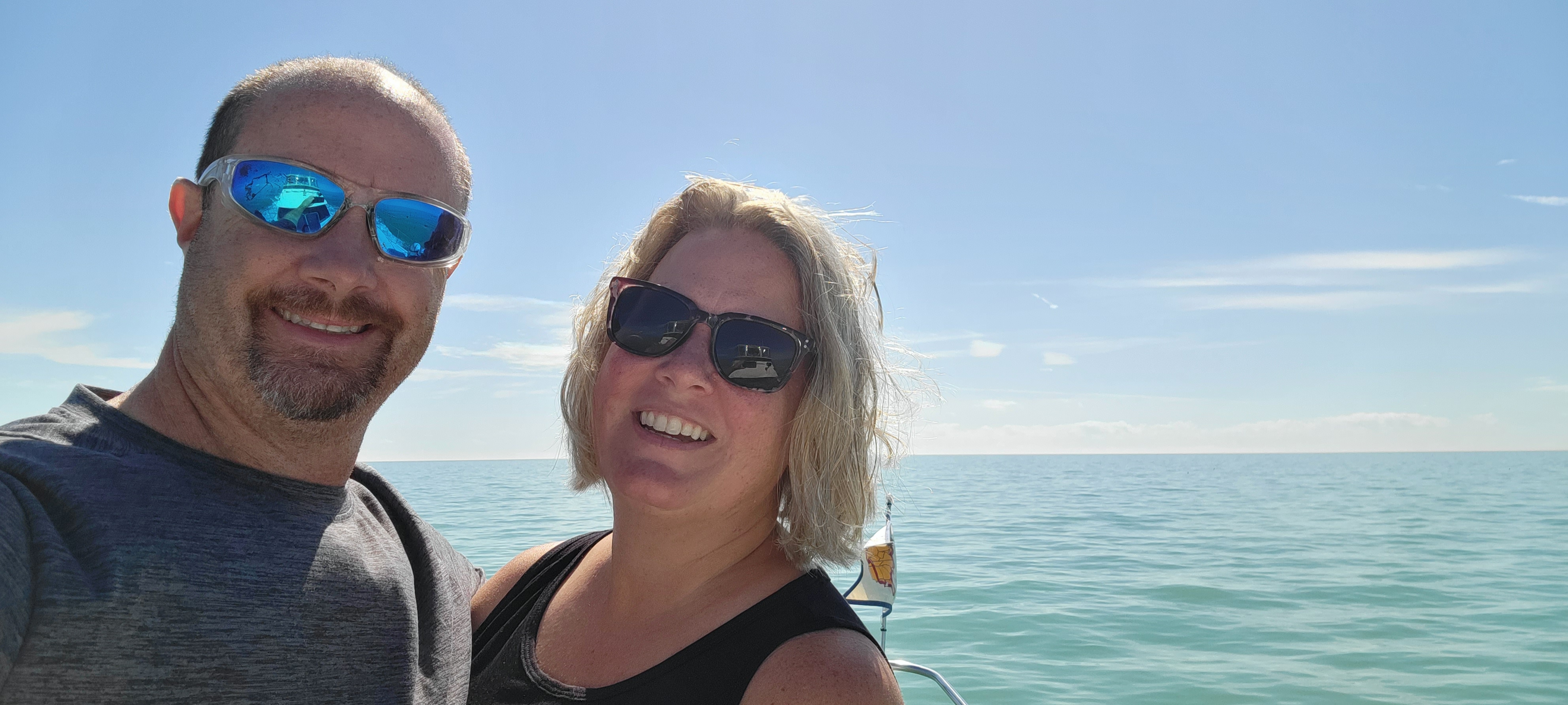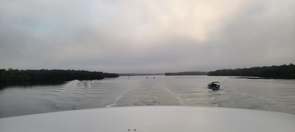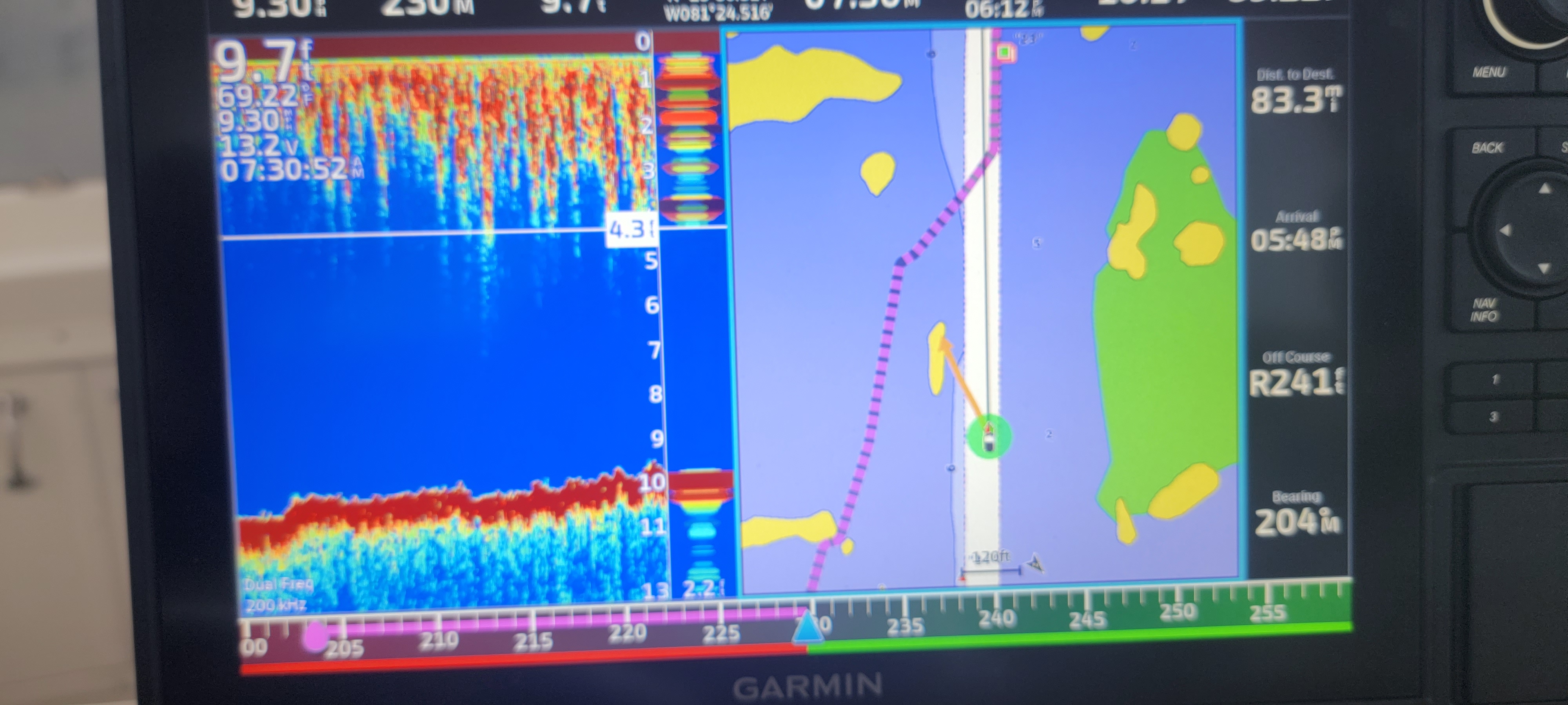 We left at high tide, which was conveniently at sunrise, and tentatively followed our path back out into open water. There were a few nail-biting moments, but Owen has learned, for better or worse, to just turn off one of our depth finders. One of them blares like a car alarm when the water gets shallow or a tiny fish passes under the sensor or there is grass on the sea bottom. Owen was already carefully watching our monitor and other depth finder. He didn’t need the piercing alarm cutting into the quiet morning, too.