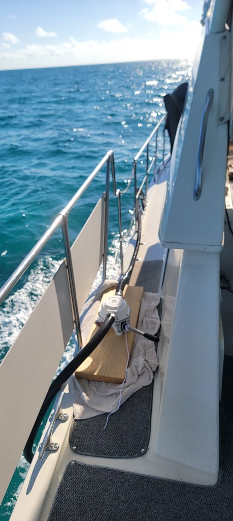 I bought a manual pump on Amazon, attached it to a 30 inch 2×10, clamped on a couple of hoses, and viola! Manual pump out. As we were traversing the beautiful turquoise waters of the Great Bahama Bank, I hooked the whole thing up to our waste tank and pumped that crap overboard. It worked like a charm. After flushing it, I stowed it away for the next time.