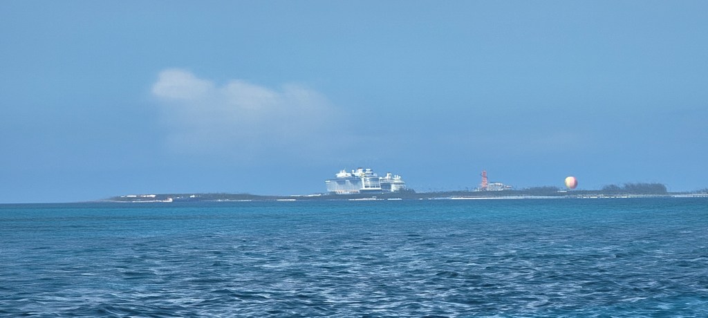 As we approached Great Harbour Cay, we could see two Royal Caribbean ships at their private island of Little Stirrup Cay (Coco Cay). Great Stirrup Cay is right next door and is the private island for Norwegian Cruise Lines, but nobody was there. Coco Cay looks like an amusement park with rides and fun stuff all around. During our time at Great Harbour, we often saw two RC ships in port at the same time. The single cell tower’s data throughput seemed to drop significantly when several thousand cruisers were hitting it at the same time.