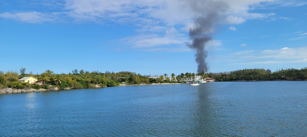 We pulled back and went the half mile more to the marina. They were burning the dump, we learned later, which explains the pillar of smoke that greeted us. A nice staff lady met us at the dock, but it was blocked by a dinghy. We opted for an open slip a few doors down.
