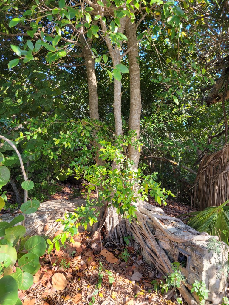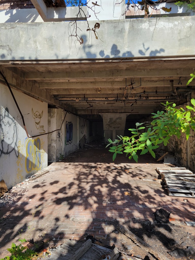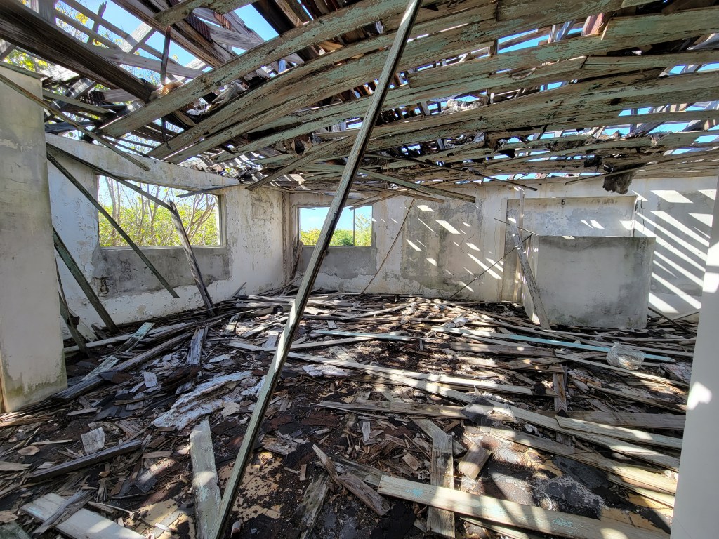Back on the golf cart, go back the way you came. The other side of the turnaround, for some reason, is not very clear. It’s passable, but just easier to go back the way you just came through. Follow the road back toward town. You’ll pass a driveway with a chain across it. There is a sign that says “No trespassing.” The next left after that driveway is a dirt path that leads to the Sugar Bush Resort ruins. Take the golf cart down the drive. Go admire the gorgeous water, and walk to the left along the beach so you can see just how far this resort went. Then when you go back around the front of the resort, you’ll have a better idea of where to go. Go back to the front of the resort, you can peek in that first building you see and poke around. But keep going left past the orange flower bushes and the giant grill to go into a bigger area. We went down the stairs (it felt like we were on an episode of Scooby Doo), and then up the interior stairs to some of the main rooms. Watch out for nails. This is not the day for your Teva sandals (says the girl who wore Teva sandals). This place was really cool. We could imagine how nice it must have looked at one time long ago.
