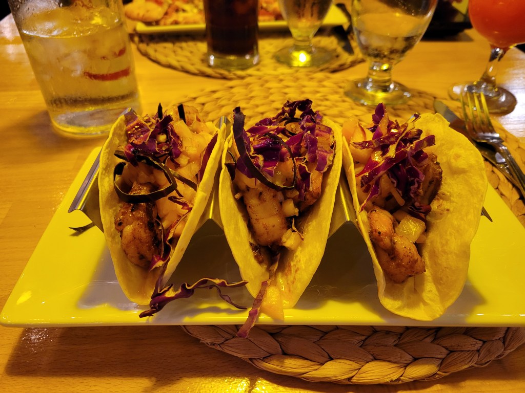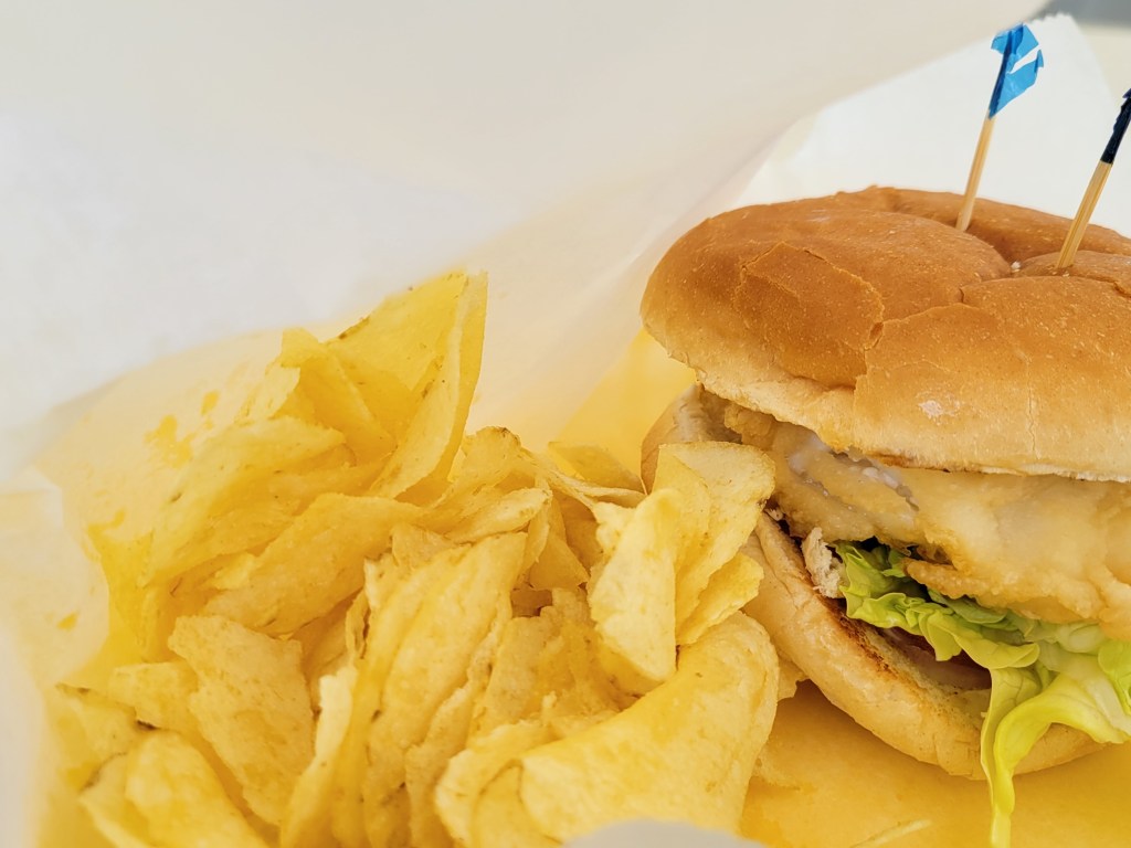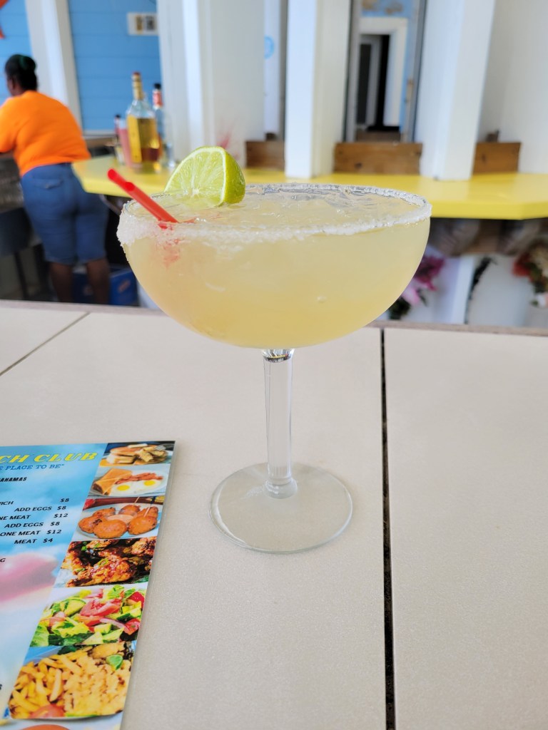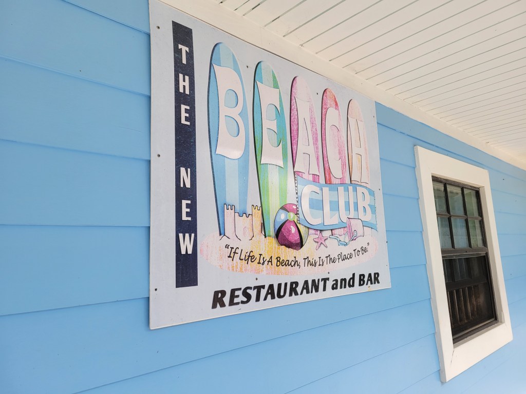 Surely, you’re hungry by now, right? Get back on the golf cart and continue south. Past the road to the clubhouse and marina, past the beach access point and directly across the street from the airport entrance, you’ll find The New Beach Club. I’m not sure what time it opens, but it closes at 4. They have breakfast and lunch items. Owen had the spicy burger, I had the fish sandwich. Both were yummy! We learned that after they close at 4, other people are welcome to use the space. That day, they had a sign that said “No grill today.” We thought something was broken, but the server said that because it’s windy they don’t want others who use the space at night to use the grills. There are clean restrooms at this restaurant.